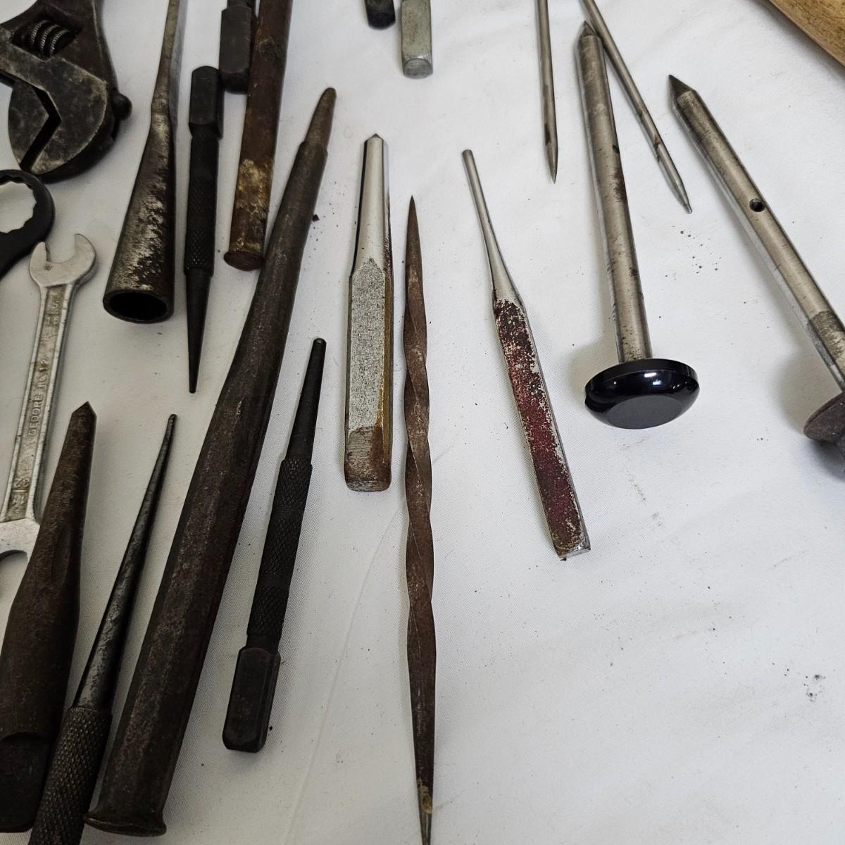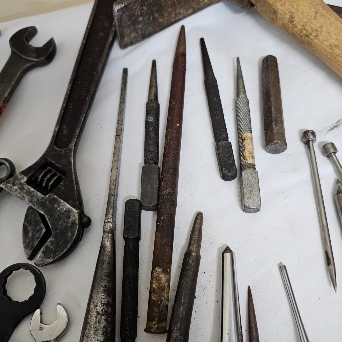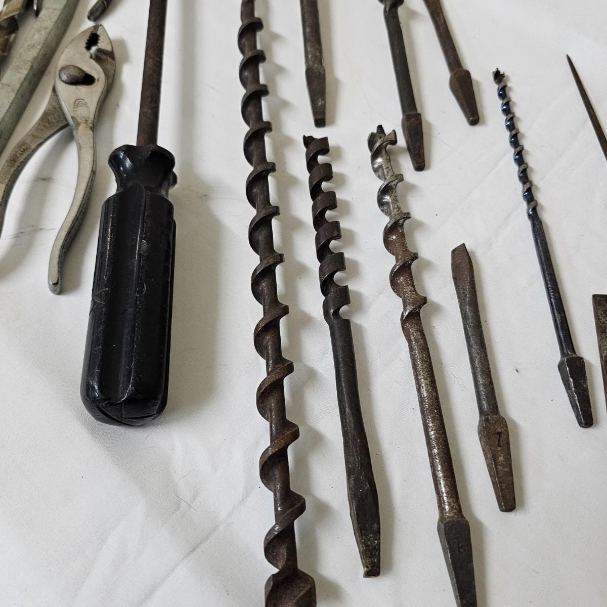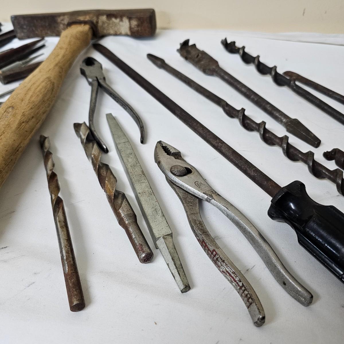 Tools from old. Many wrenches, punches, drifts and more. Several brace and bit style drills and other. Large hammer measures 7.5" x 14"Long. Black screwdriver is 16.5". All items well used. See photos for details. Local pickup only.