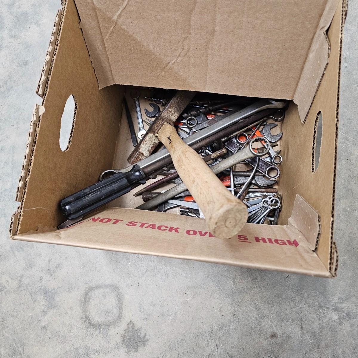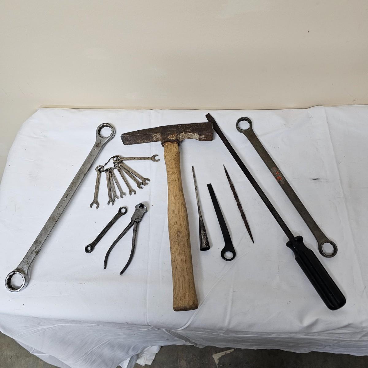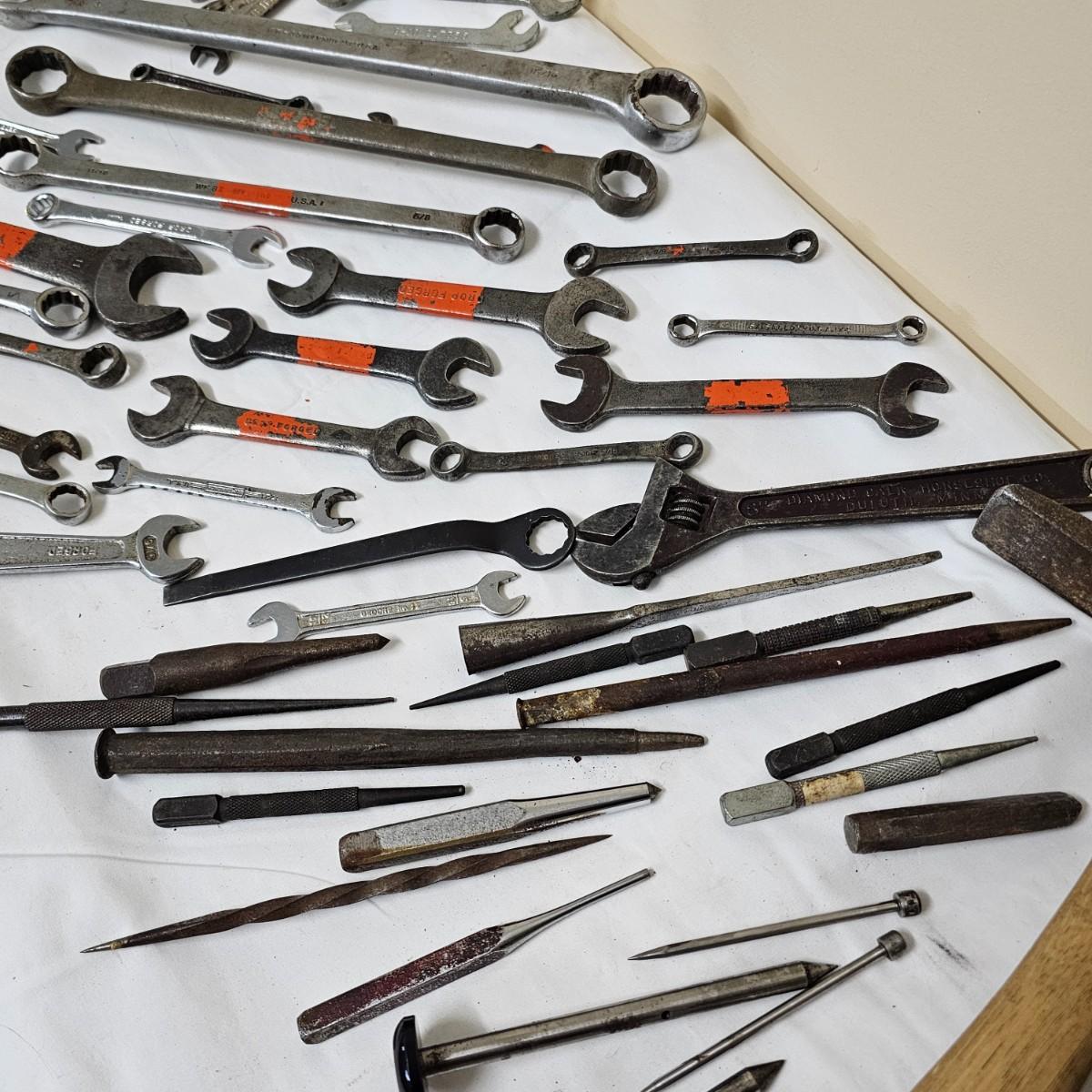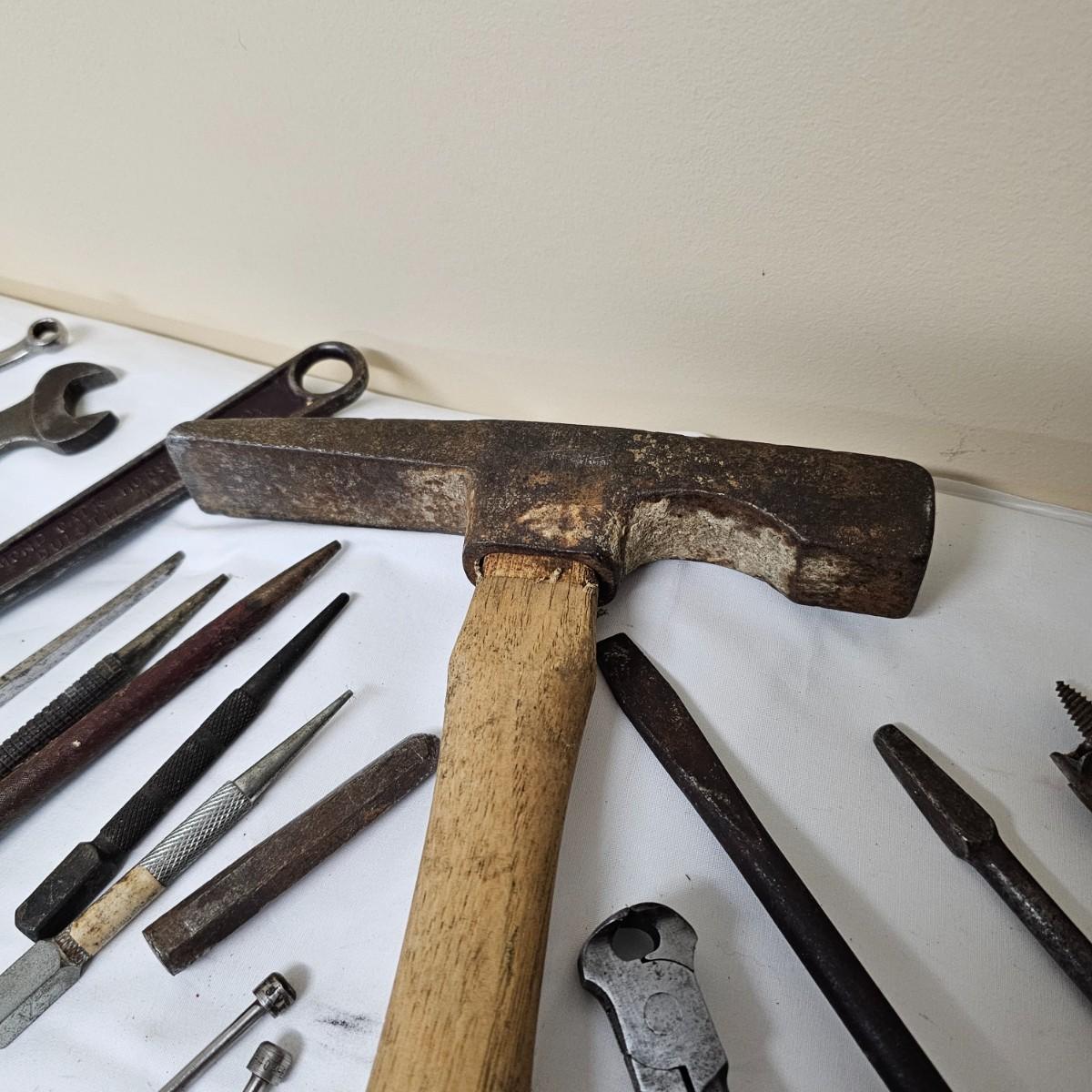 Tools from old. Many wrenches, punches, drifts and more. Several brace and bit style drills and other. Large hammer measures 7.5" x 14"Long. Black screwdriver is 16.5". All items well used. See photos for details. Local pickup only.