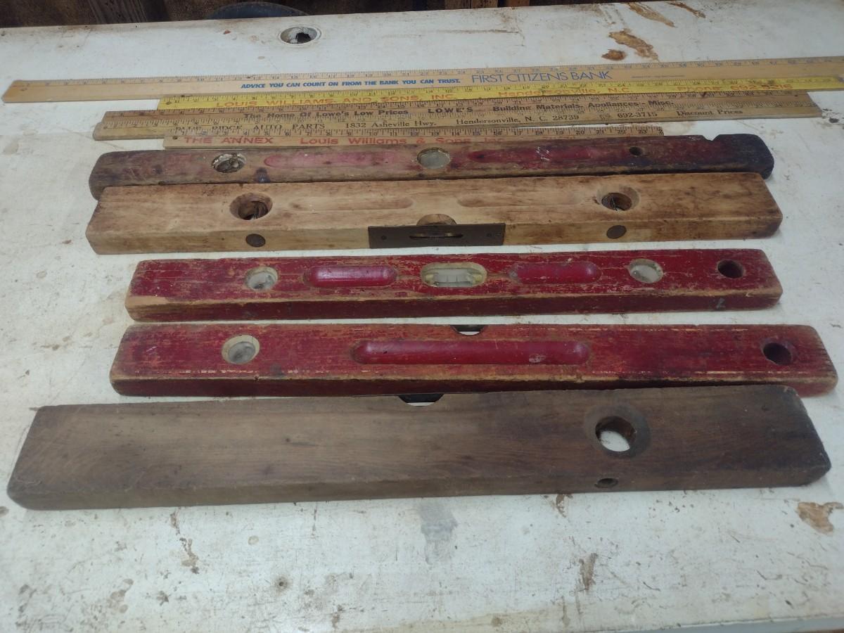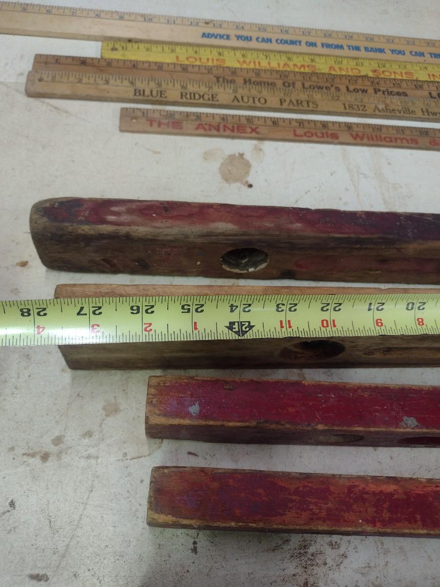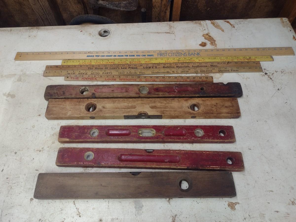 Assortment of Vintage Wood Framed Levels and Advertising Yard Sticks