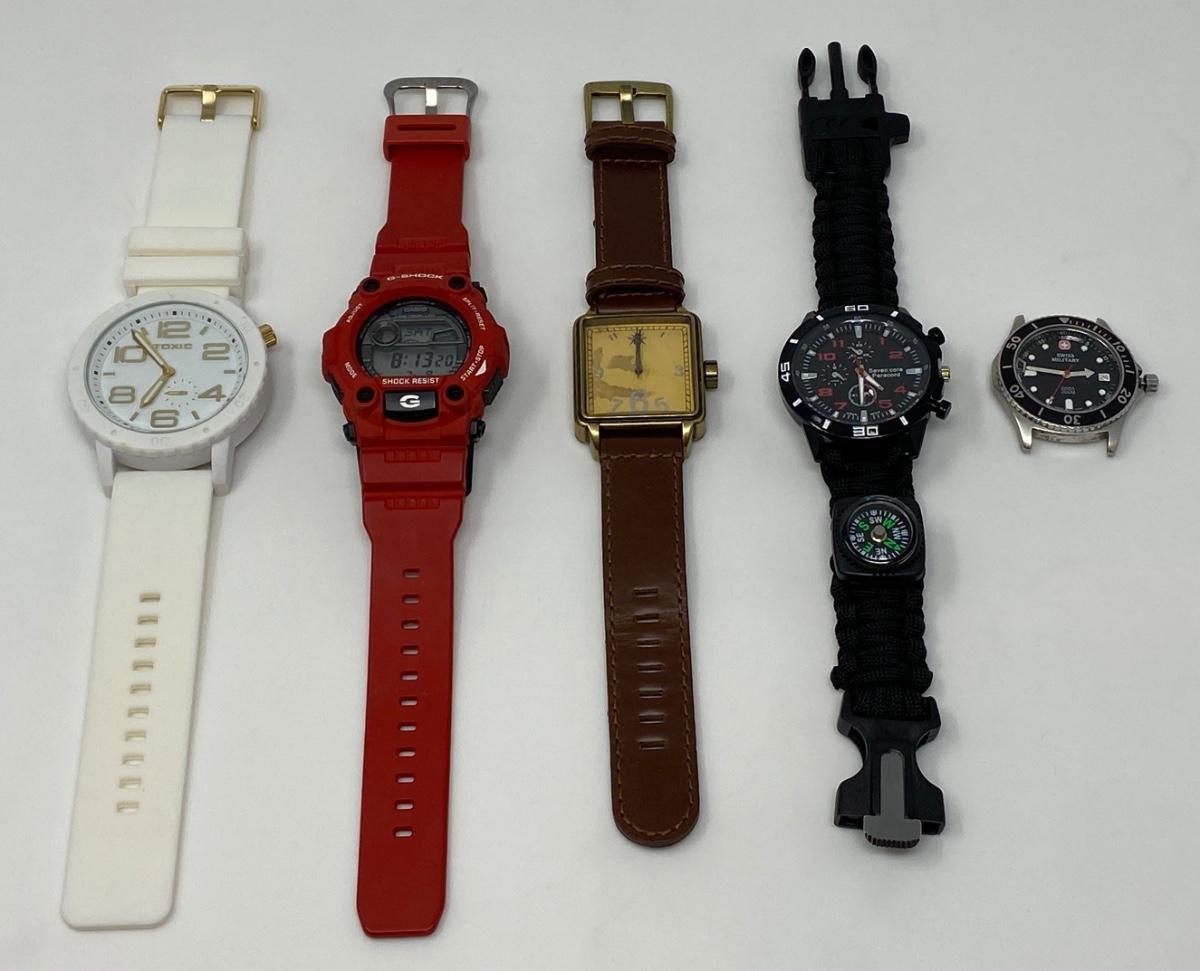 Assortment of Watches Including Area 51 Toxic, Casio G-Shock, Oui Art, Seven Core Paracord, and Swiss Military Watch Face