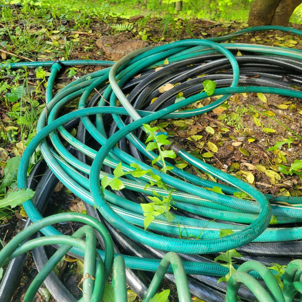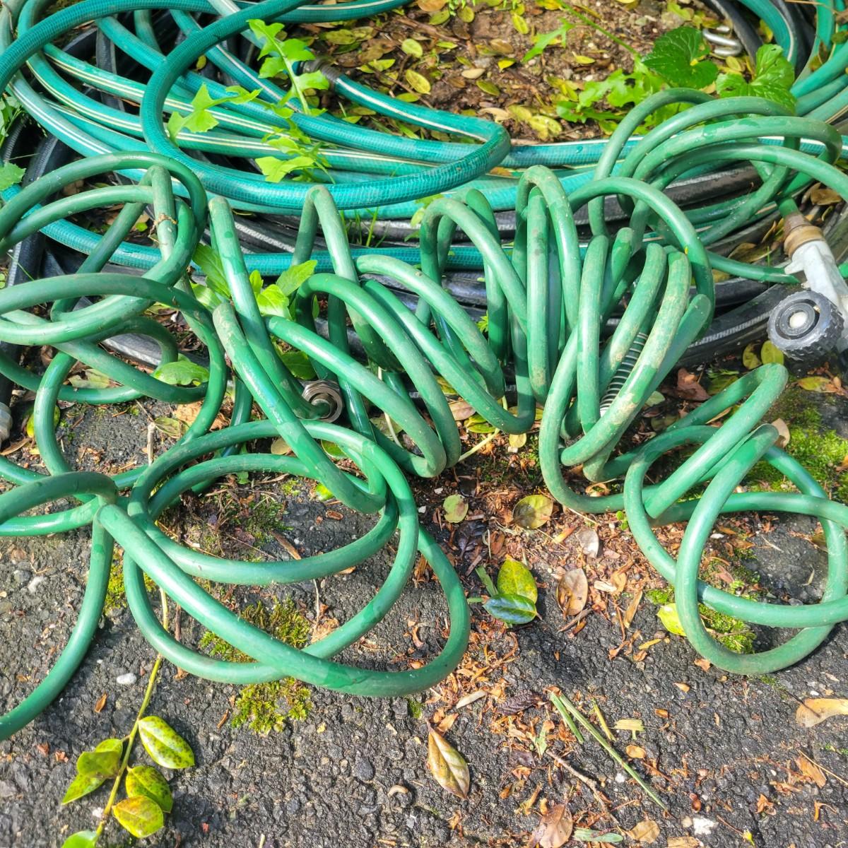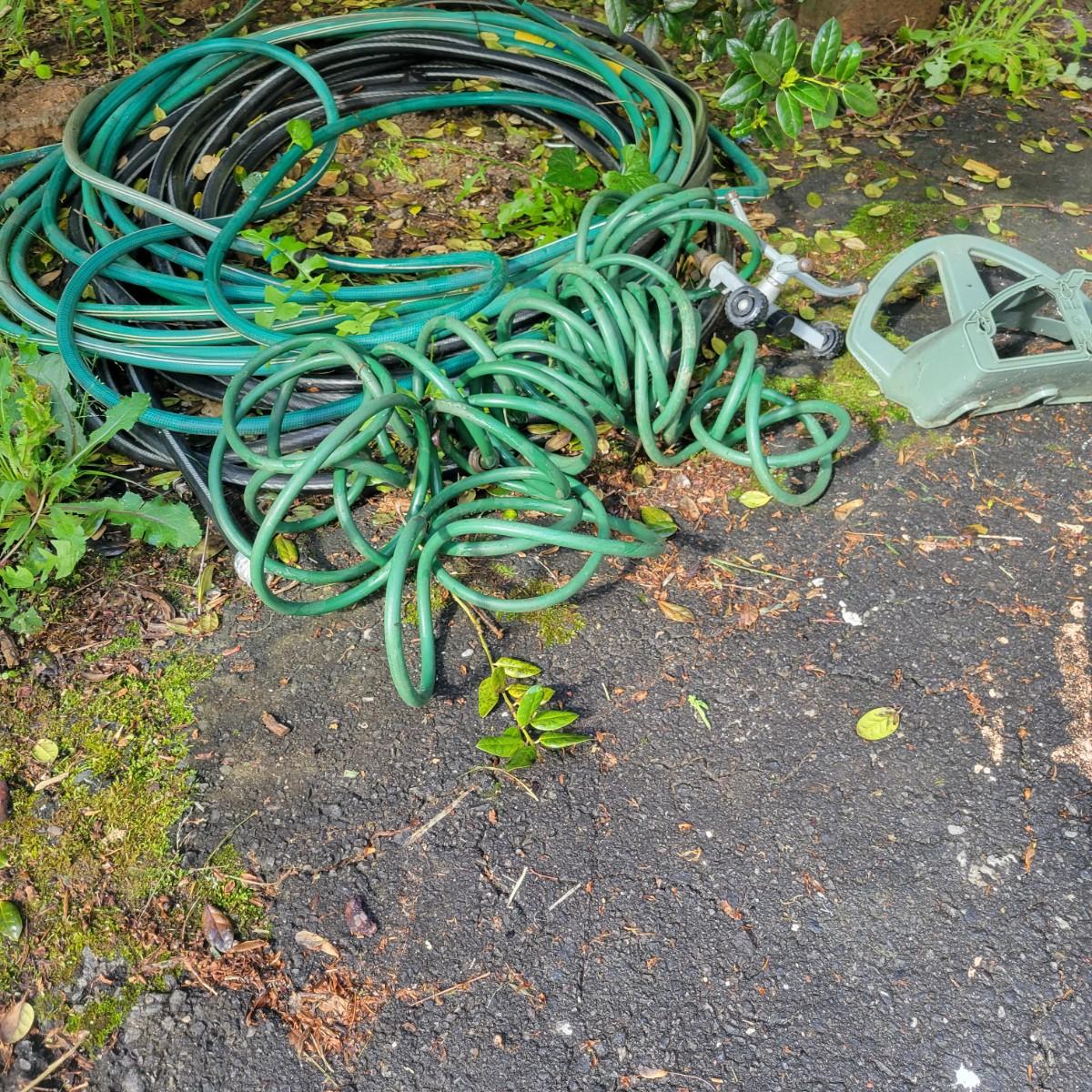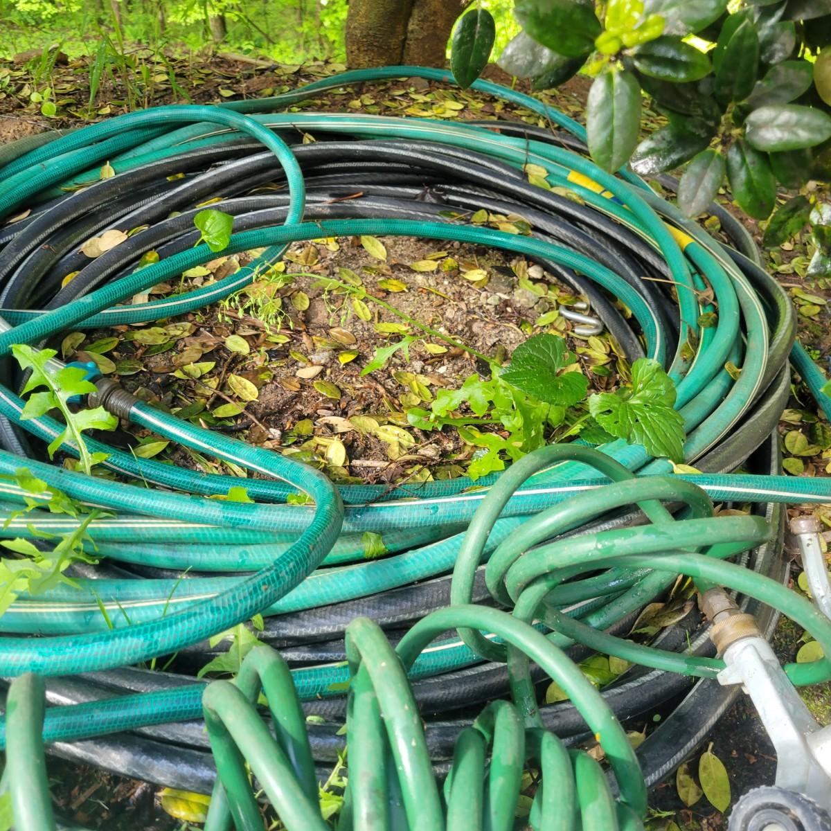hoses ranging in length from 100fl' for the black one to 50' for the other Hoses. This lot also includes a metal sprinkler and a plastic wall mounted hose caddy. Local pickup only