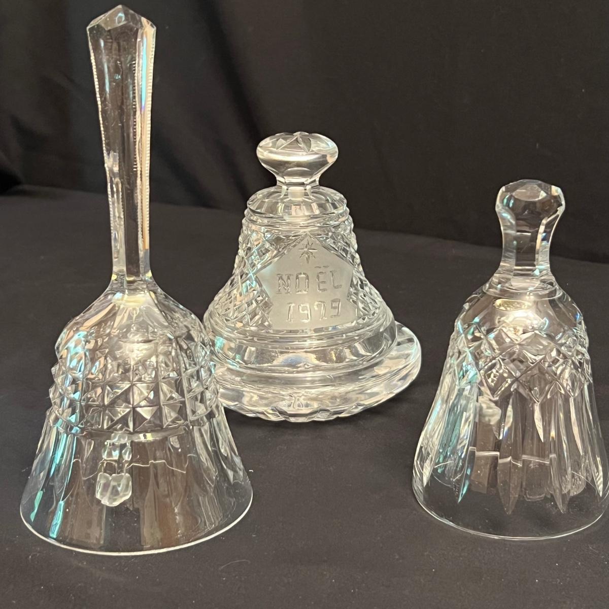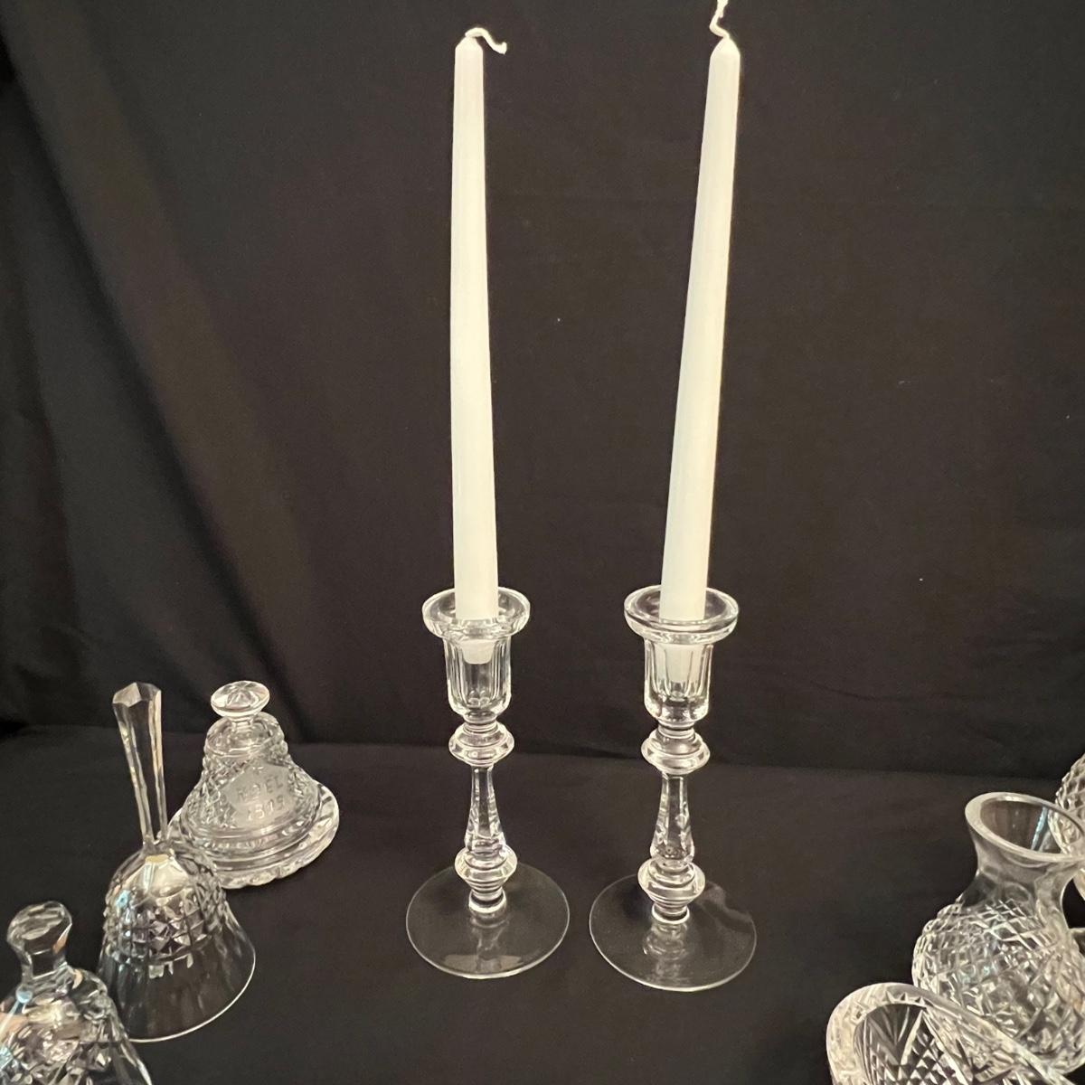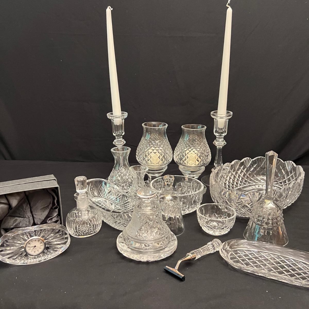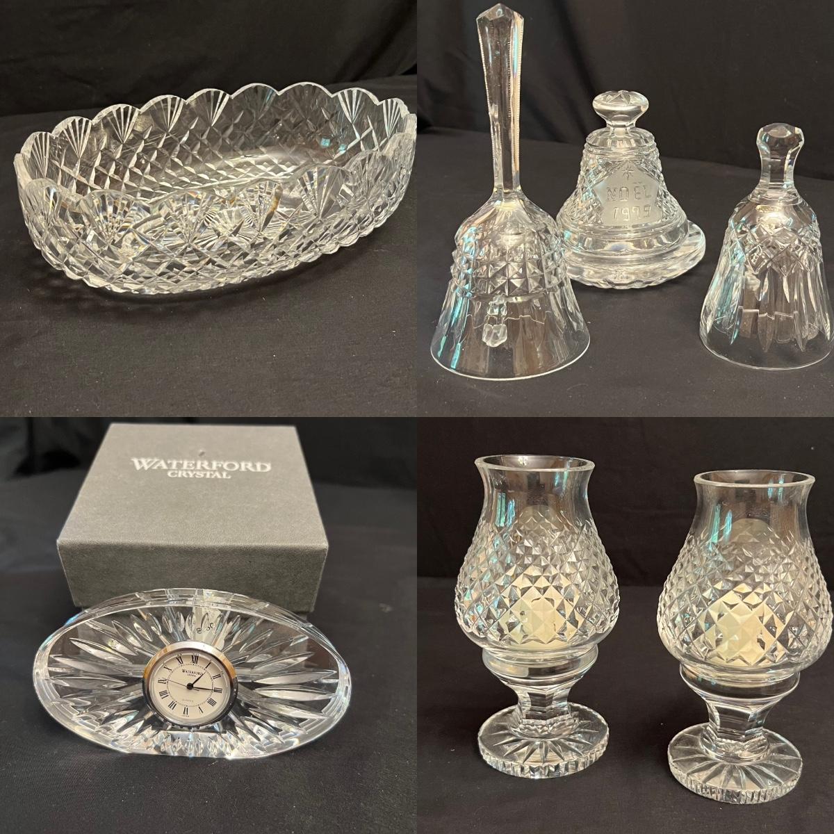 This assortment of approximately 19 pieces of Waterford crystal includes bells, a small clock (not tested). large and small bowls plus more. The razor has a crystal handle. Note that no marking was found on the small bottle with stopper.