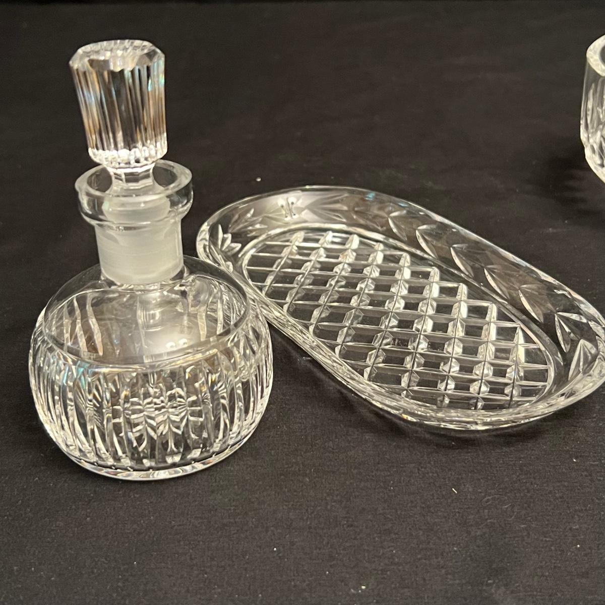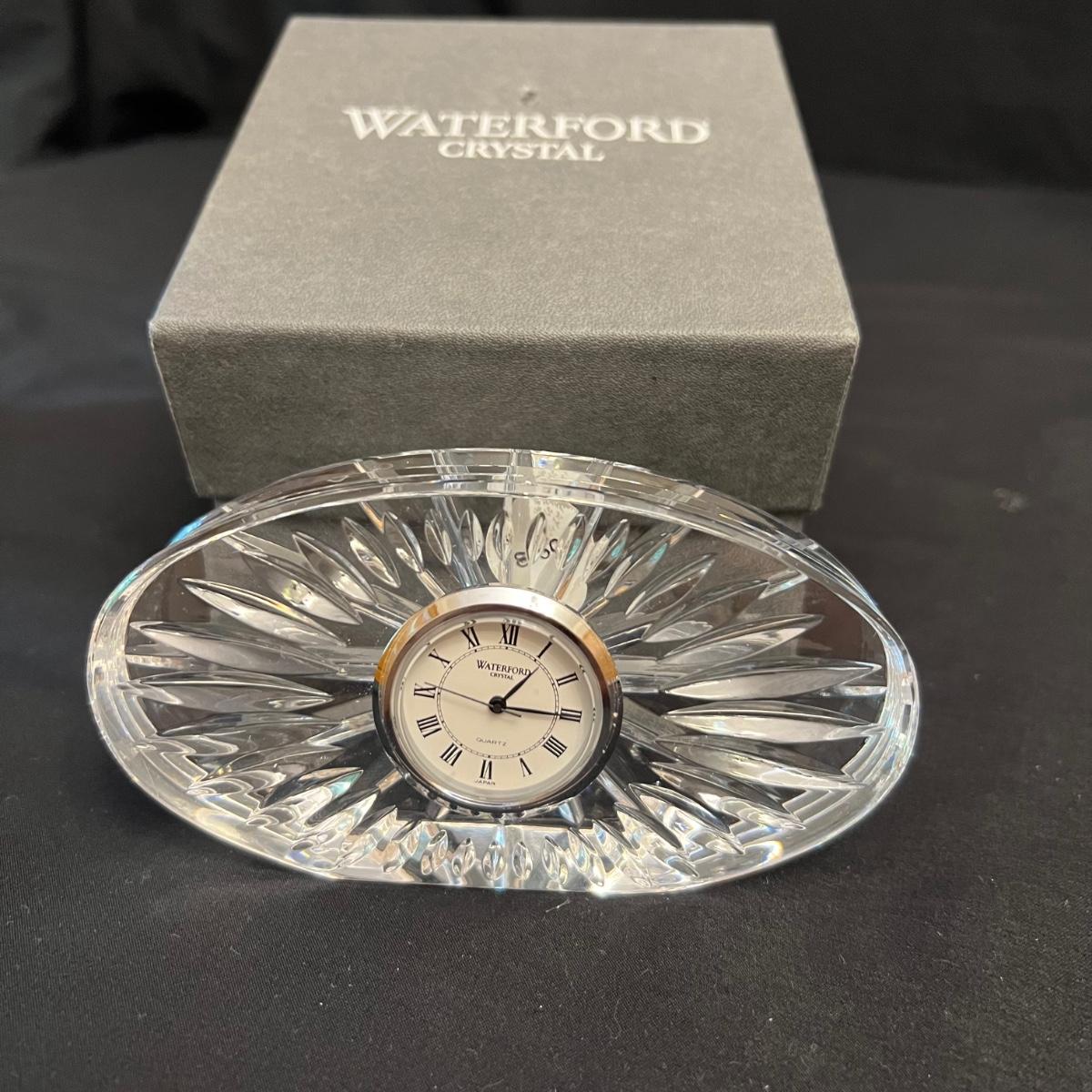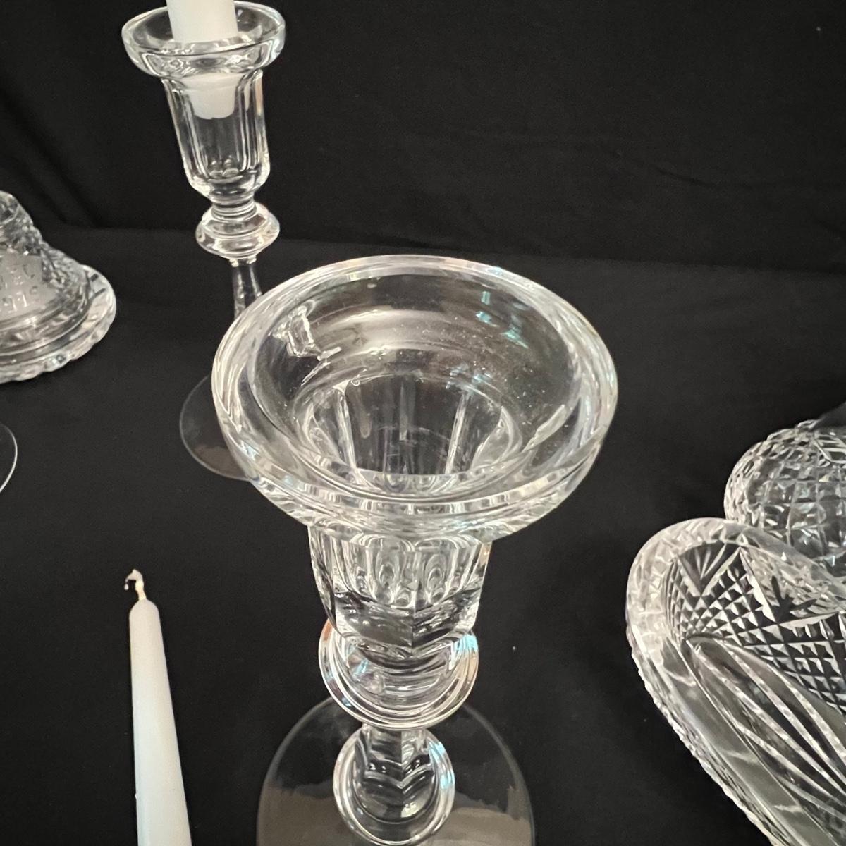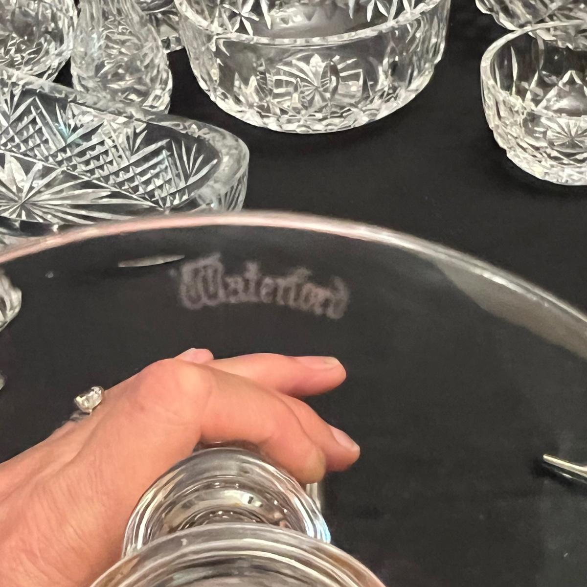 This assortment of approximately 19 pieces of Waterford crystal includes bells, a small clock (not tested). large and small bowls plus more. The razor has a crystal handle. Note that no marking was found on the small bottle with stopper.