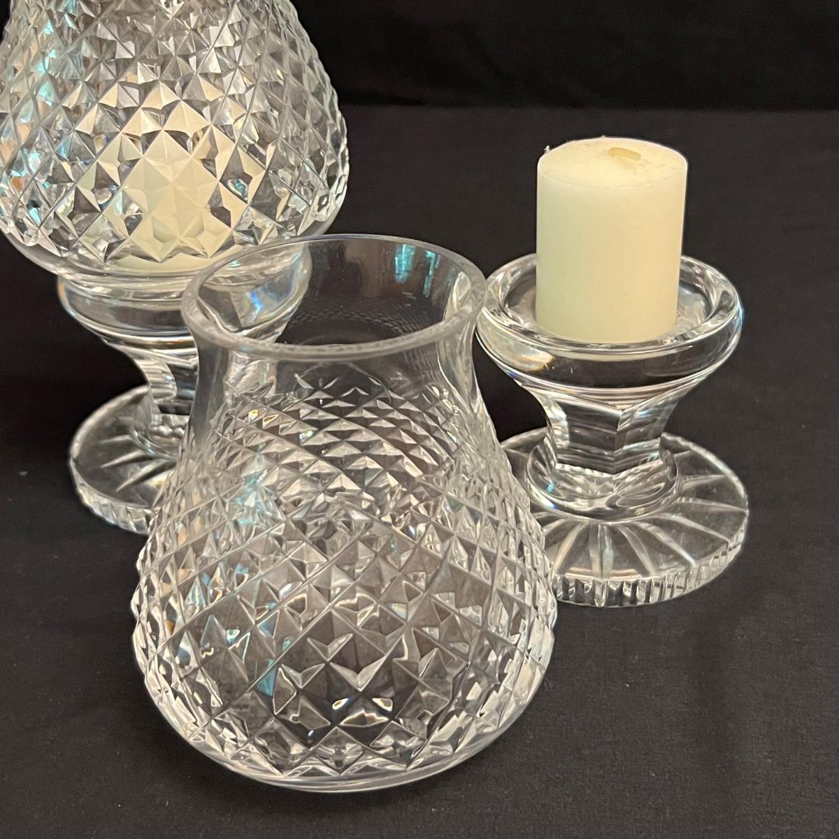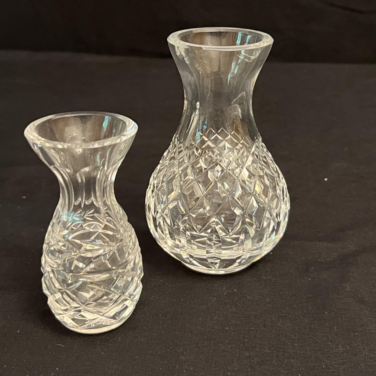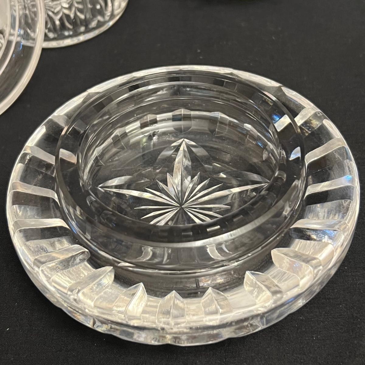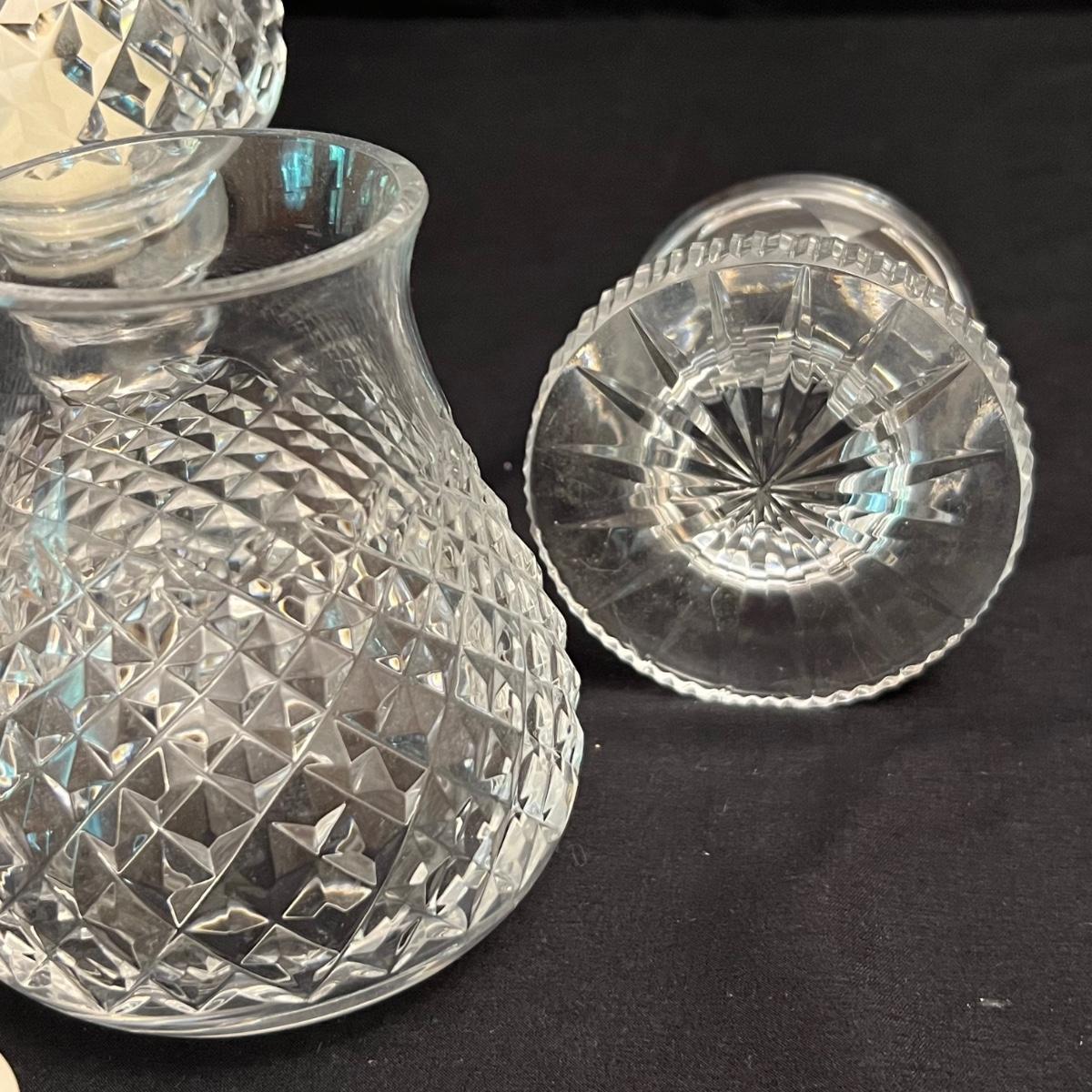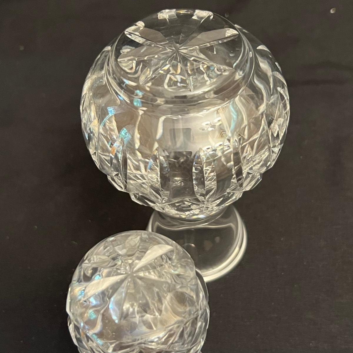 This assortment of approximately 19 pieces of Waterford crystal includes bells, a small clock (not tested). large and small bowls plus more. The razor has a crystal handle. Note that no marking was found on the small bottle with stopper.