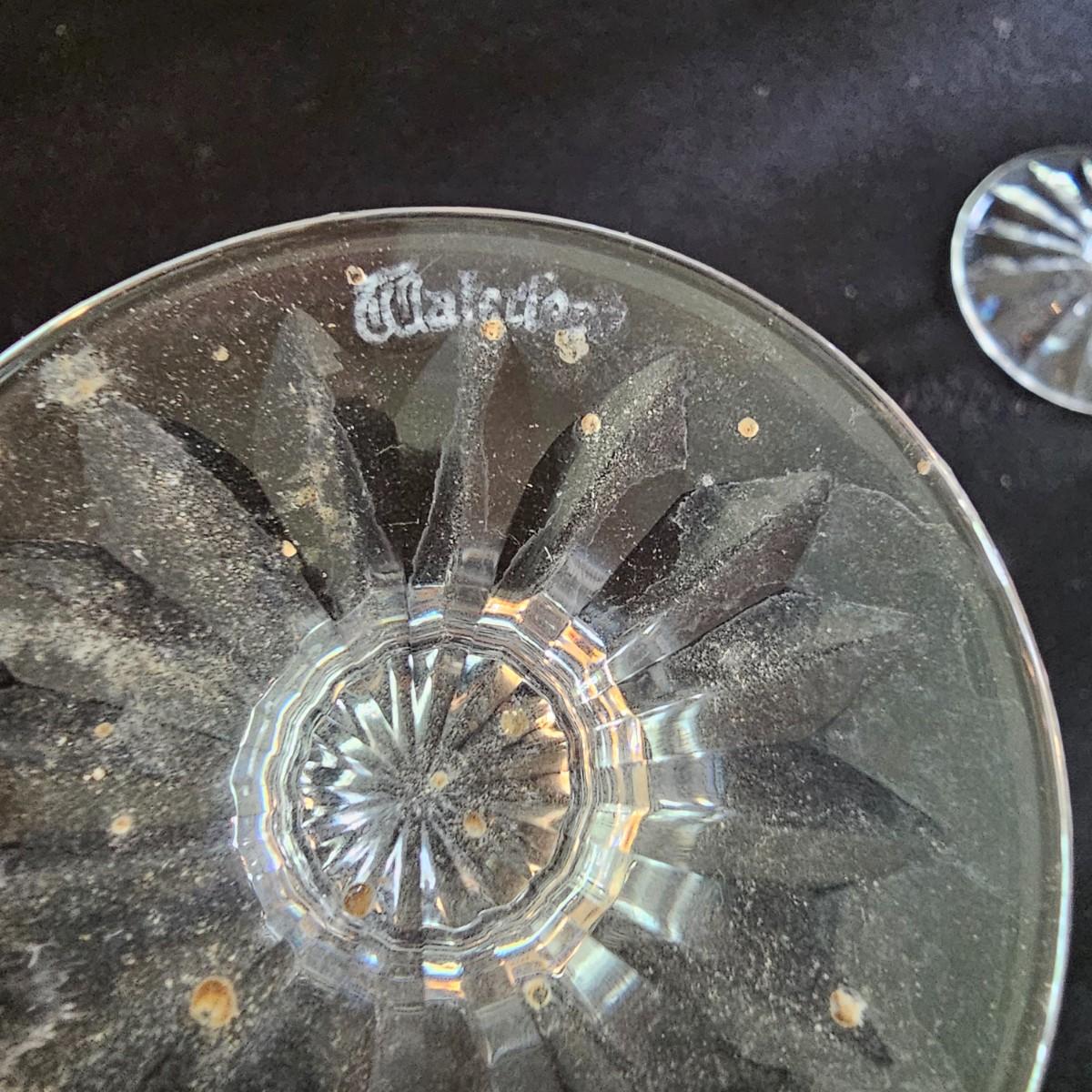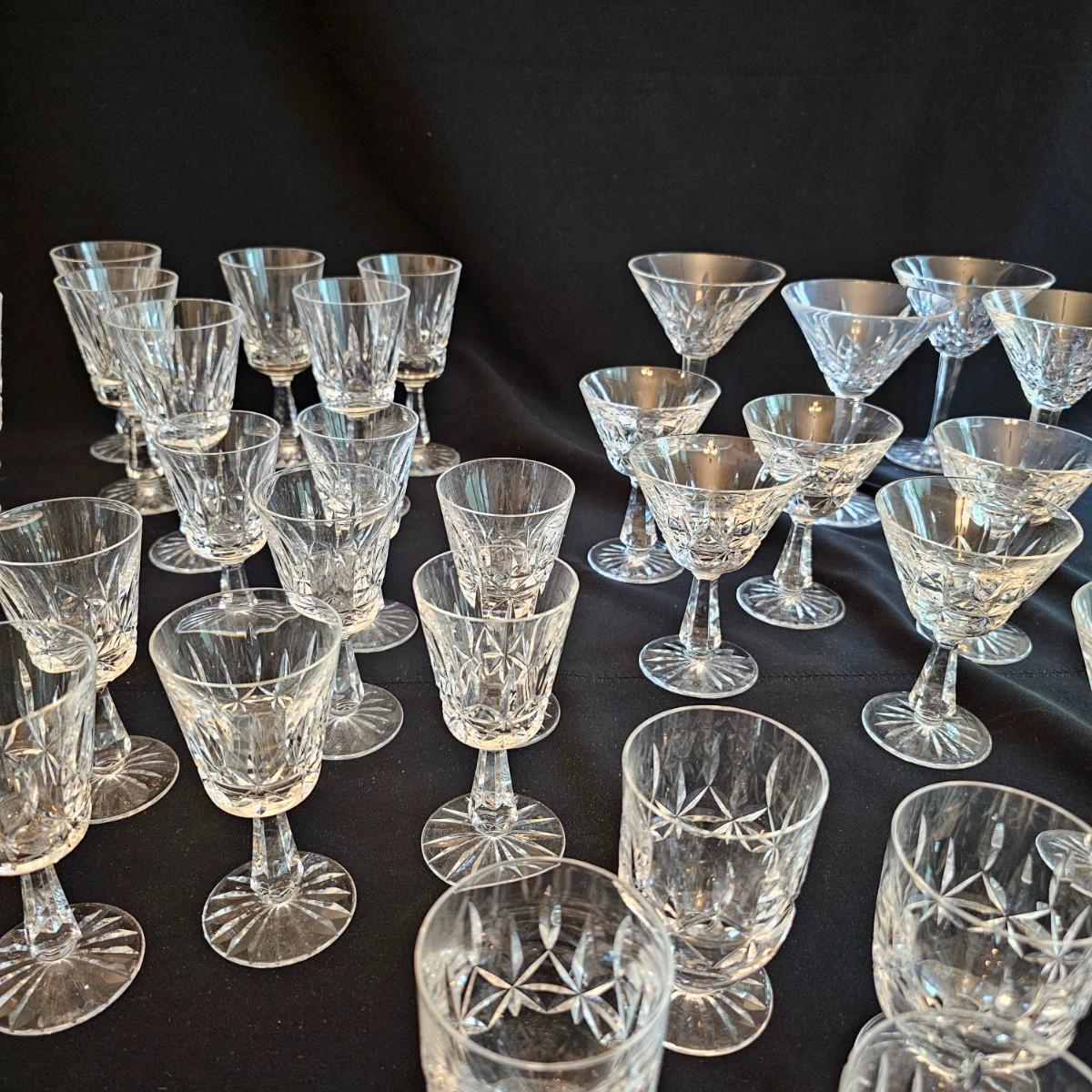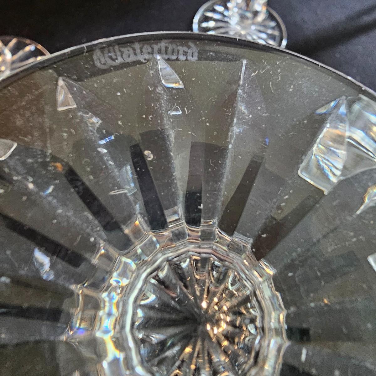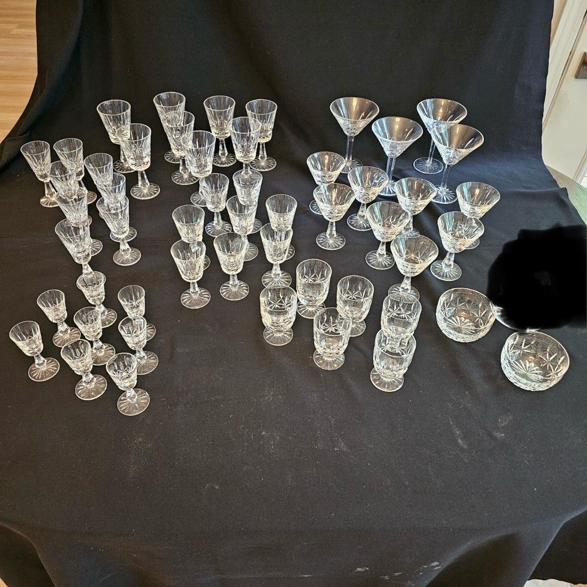 About 50 pieces of crystal stemware by Waterford. Martini, wine, aperitif and more styles. Largest martini glass measures 4.5"D x 6"H. Small aperitif is 1.5"D x 4"H. Two small bowls at end of photos we were unable to find brand markings but may still be Waterford. Known chips are noted in photos. See photos for details. Local pickup only.