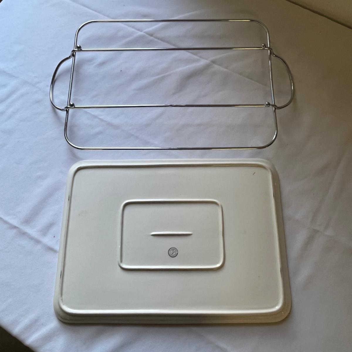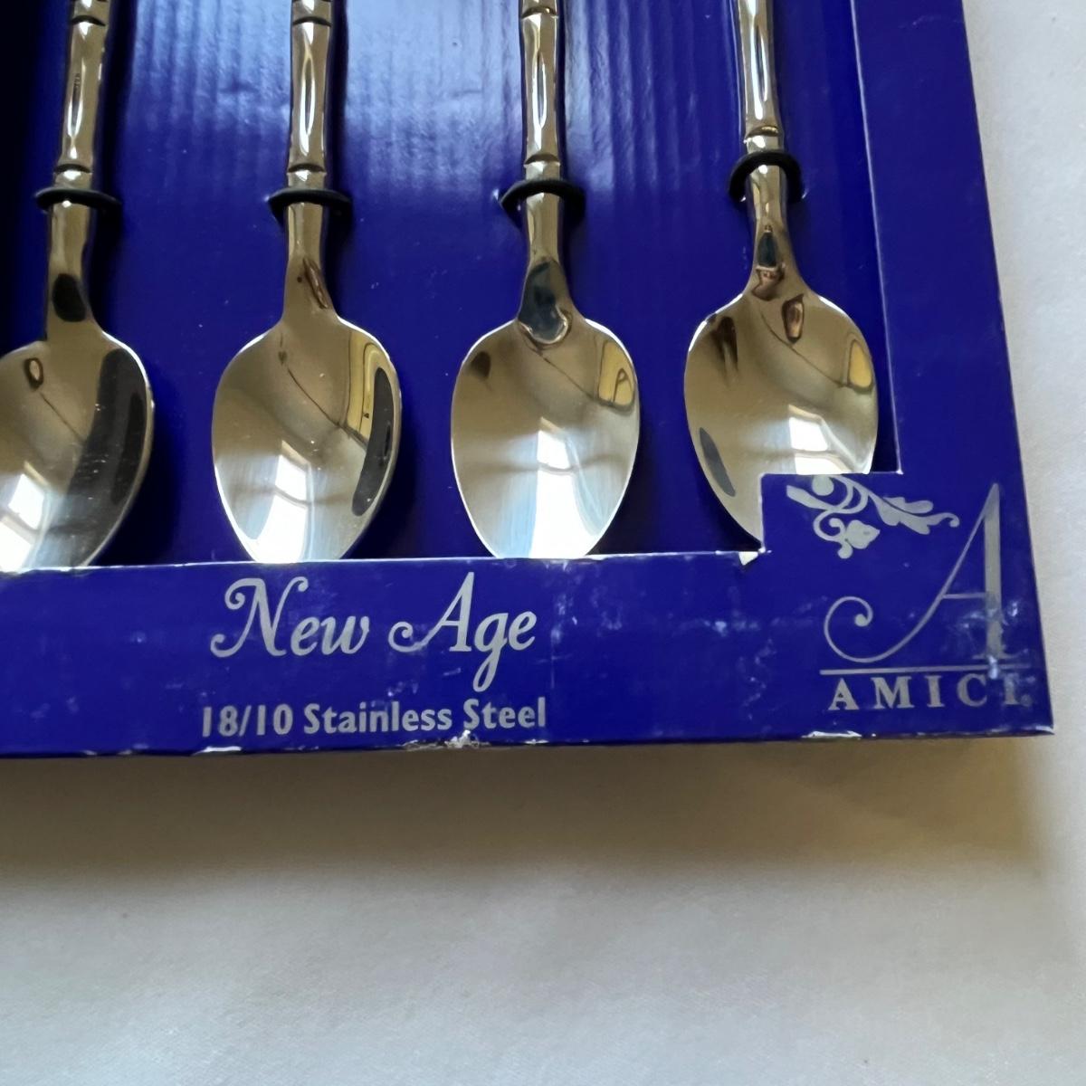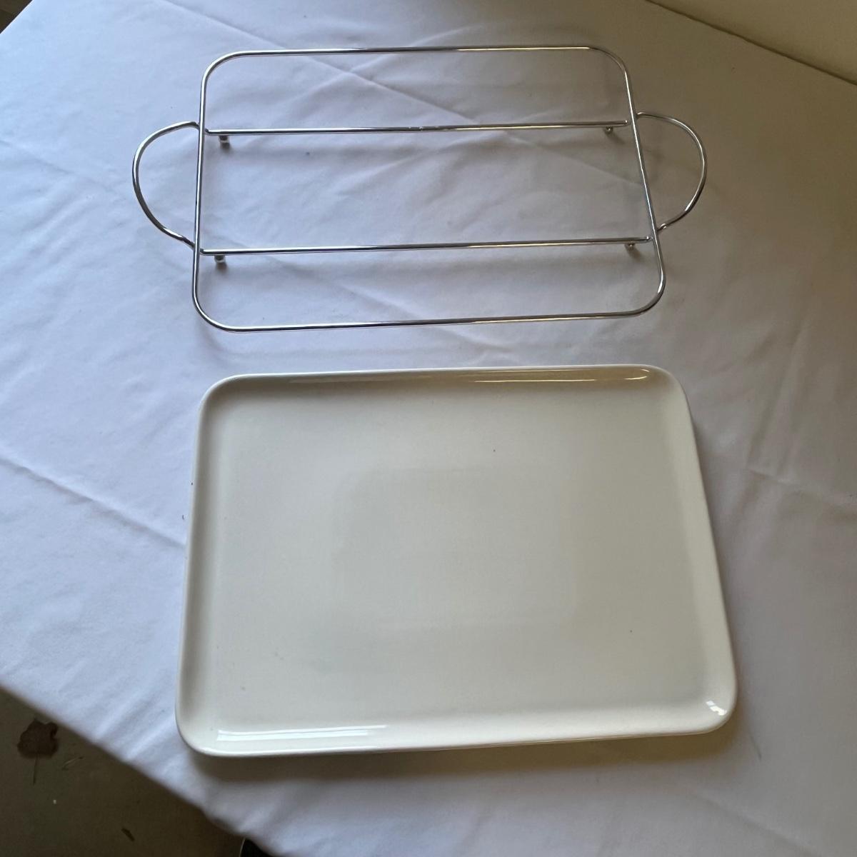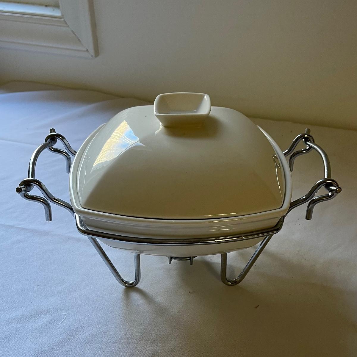 This grouping contains a small lidded casserole dish with a metal chafing frame and a serving platter with a metal handled frame both by Godington Silver Art Co. Also a beautiful ceramic bowl and four Stainless Steel Bamboo patterned tea spoons in the original box.