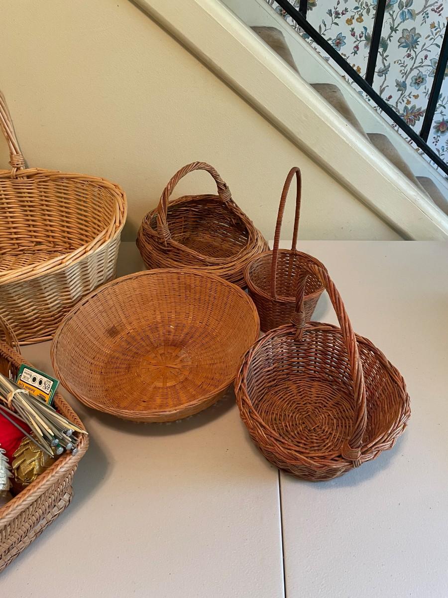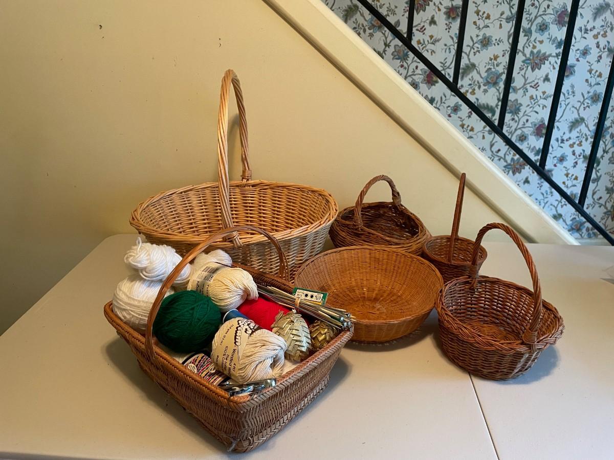 6 wicker baskets in assortment sizes. Various bundles of yarn, needle pillow in acorn shape, Wess brand fabric scissors
