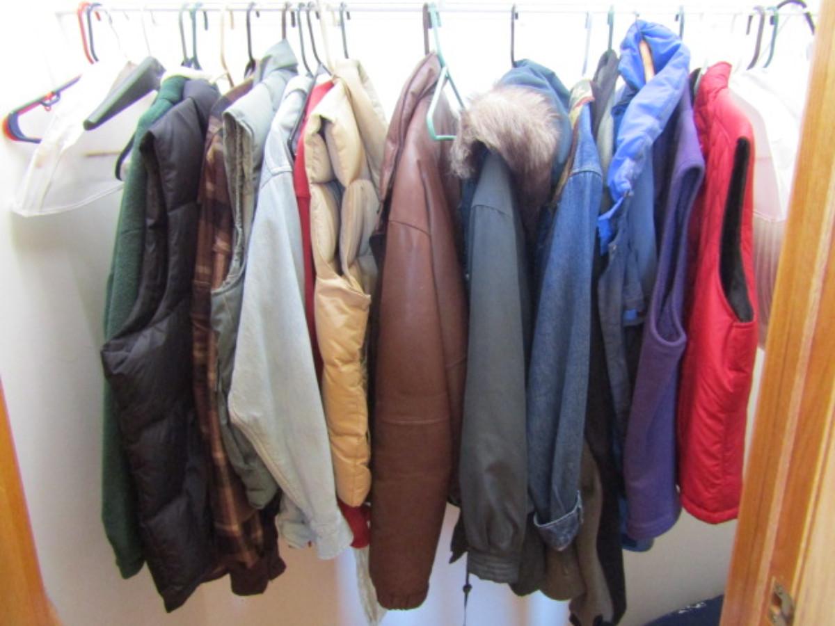 Assortment of Winter Wear- Coats, Vests, Jackets (Front Closet). Mostly men's- Size Large and XL. Assorted brands- Orvis, Eddie Bauer, Land's End, etc.