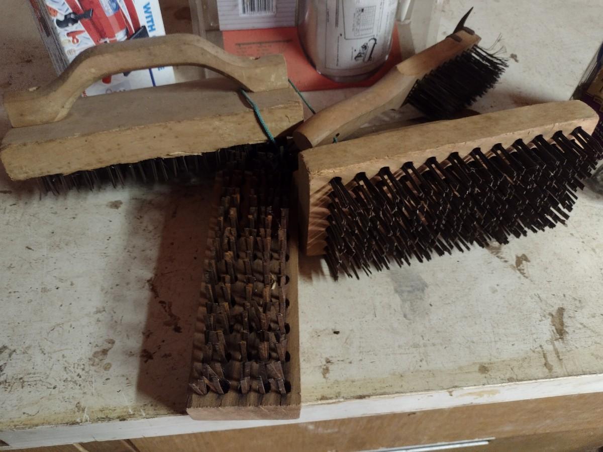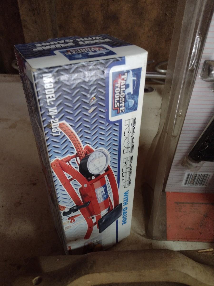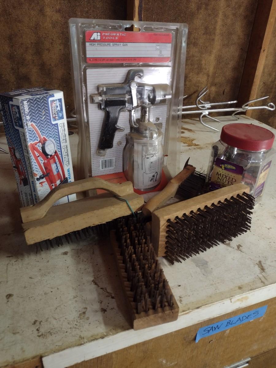 Assortment of Work Tools and Accessories Foot Air Pump, Paint Sprayer, Wire Brushes, Other