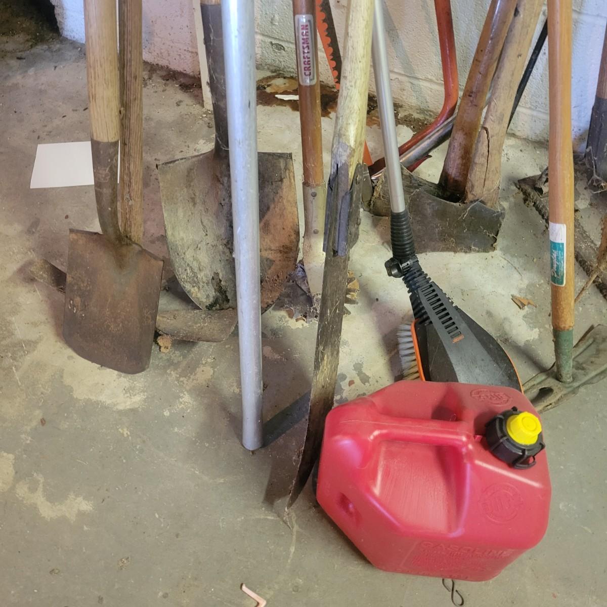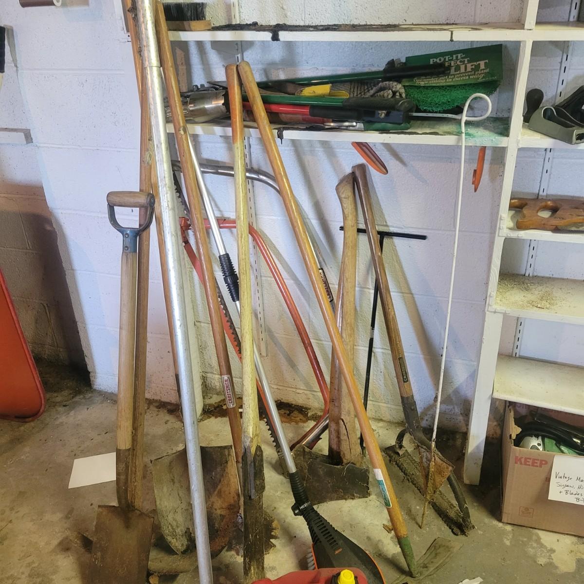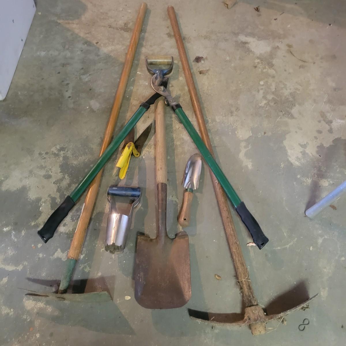 A large assortment of yard and gardening Tools in good condition. Lot includes saws, shovels, spades, axes, loppers and more. Local pickup only