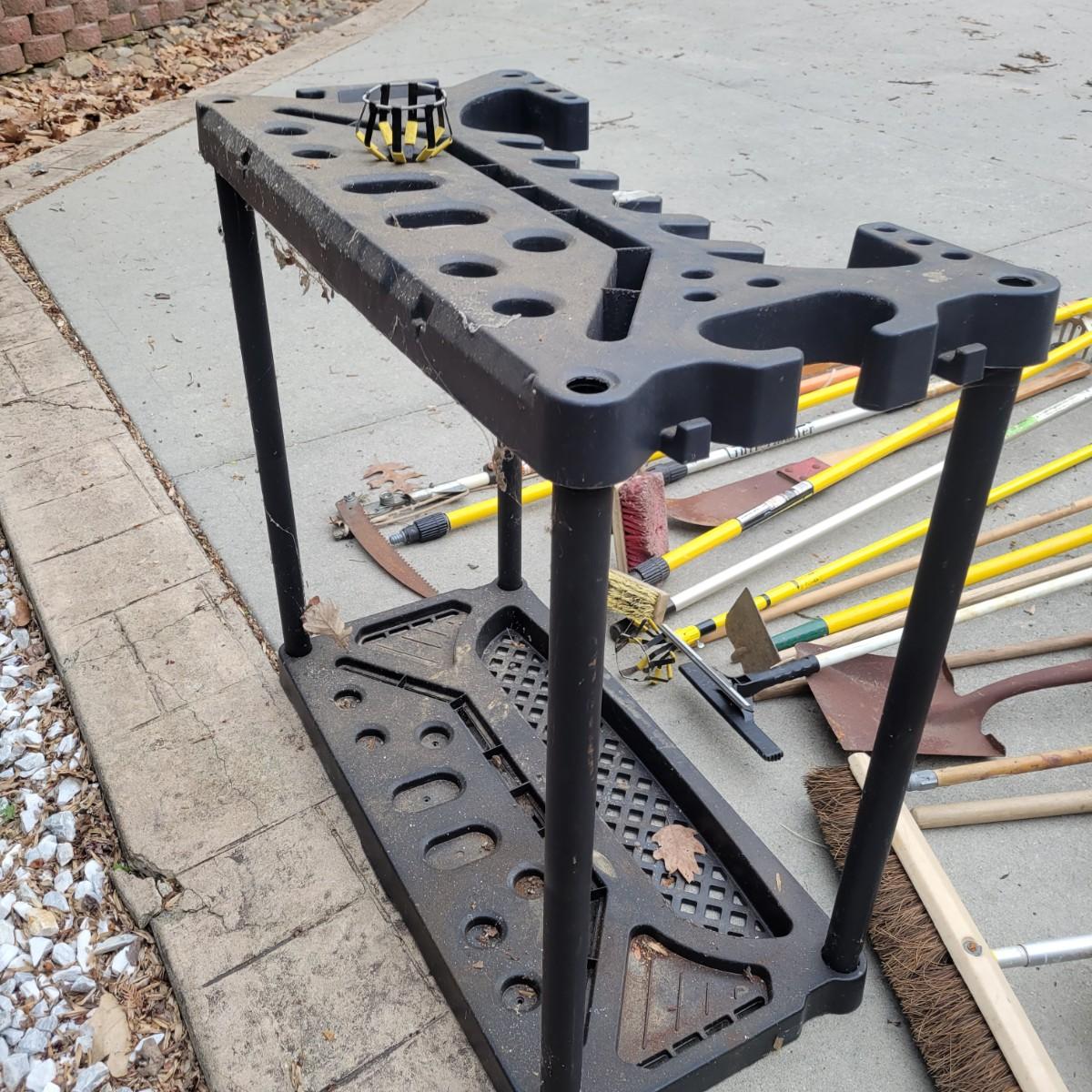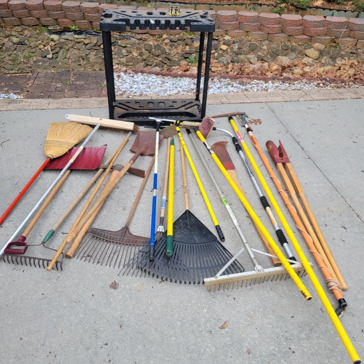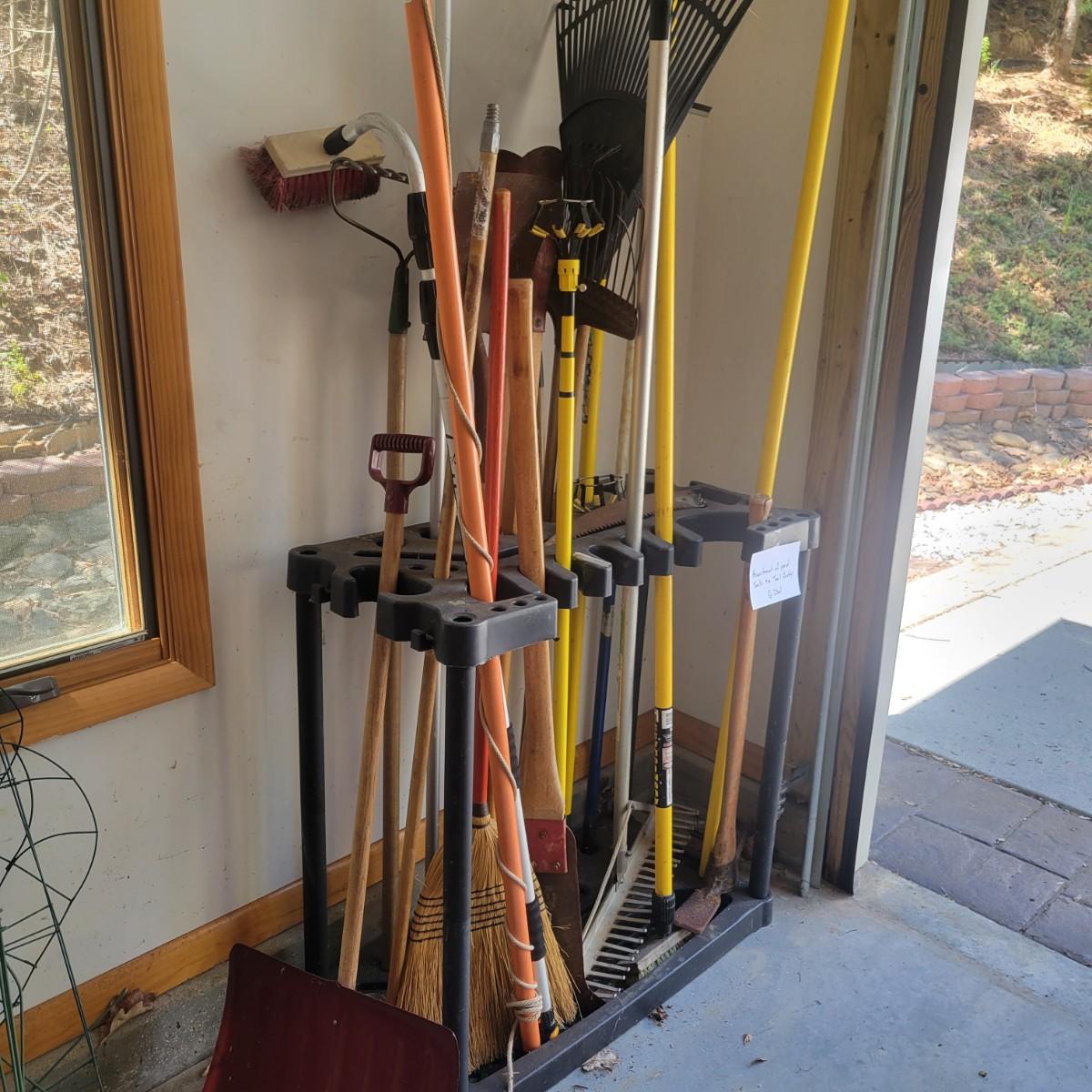 An assortment of yard tools ranging from rakes and brooms to shovels and a post hole digger. This lot also includes a tool storage caddy that measures approximately 36" x 18" x 35.5"H. Local pickup only