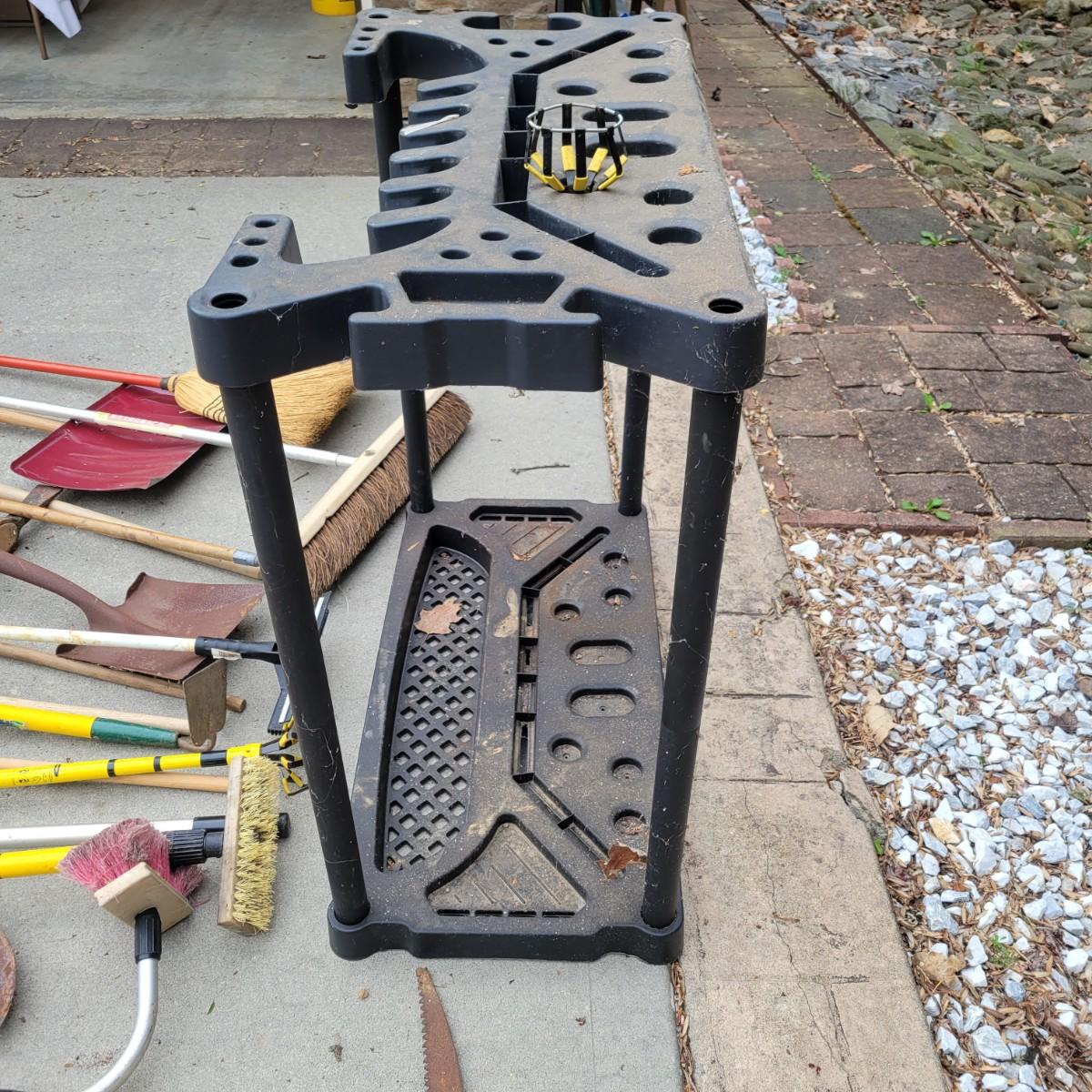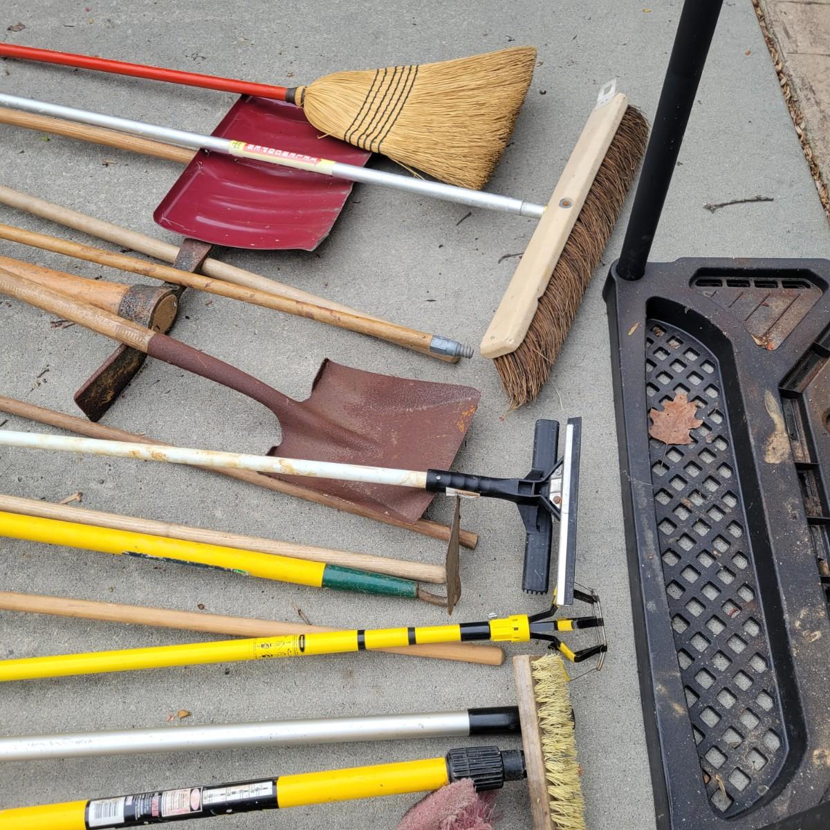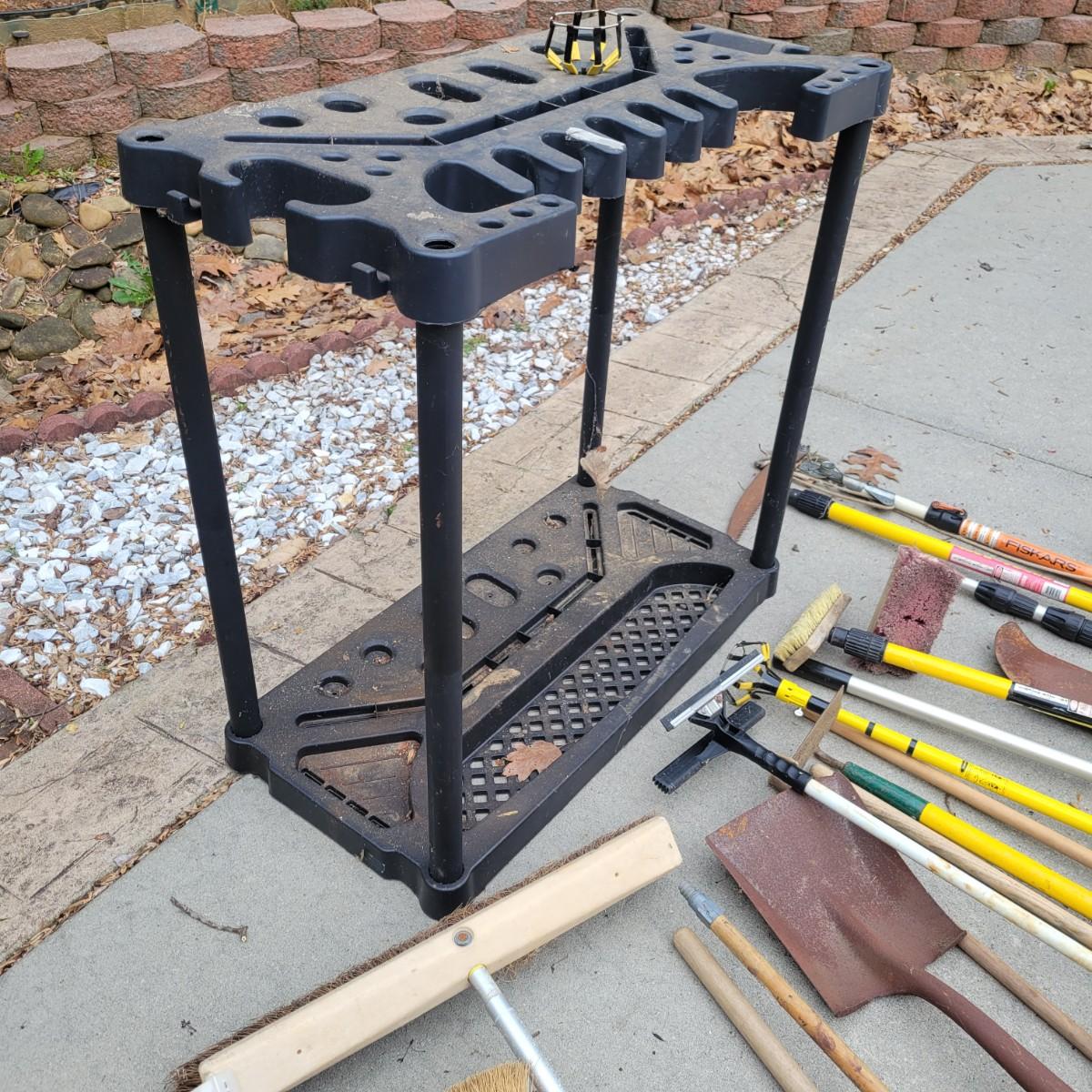 An assortment of yard tools ranging from rakes and brooms to shovels and a post hole digger. This lot also includes a tool storage caddy that measures approximately 36" x 18" x 35.5"H. Local pickup only