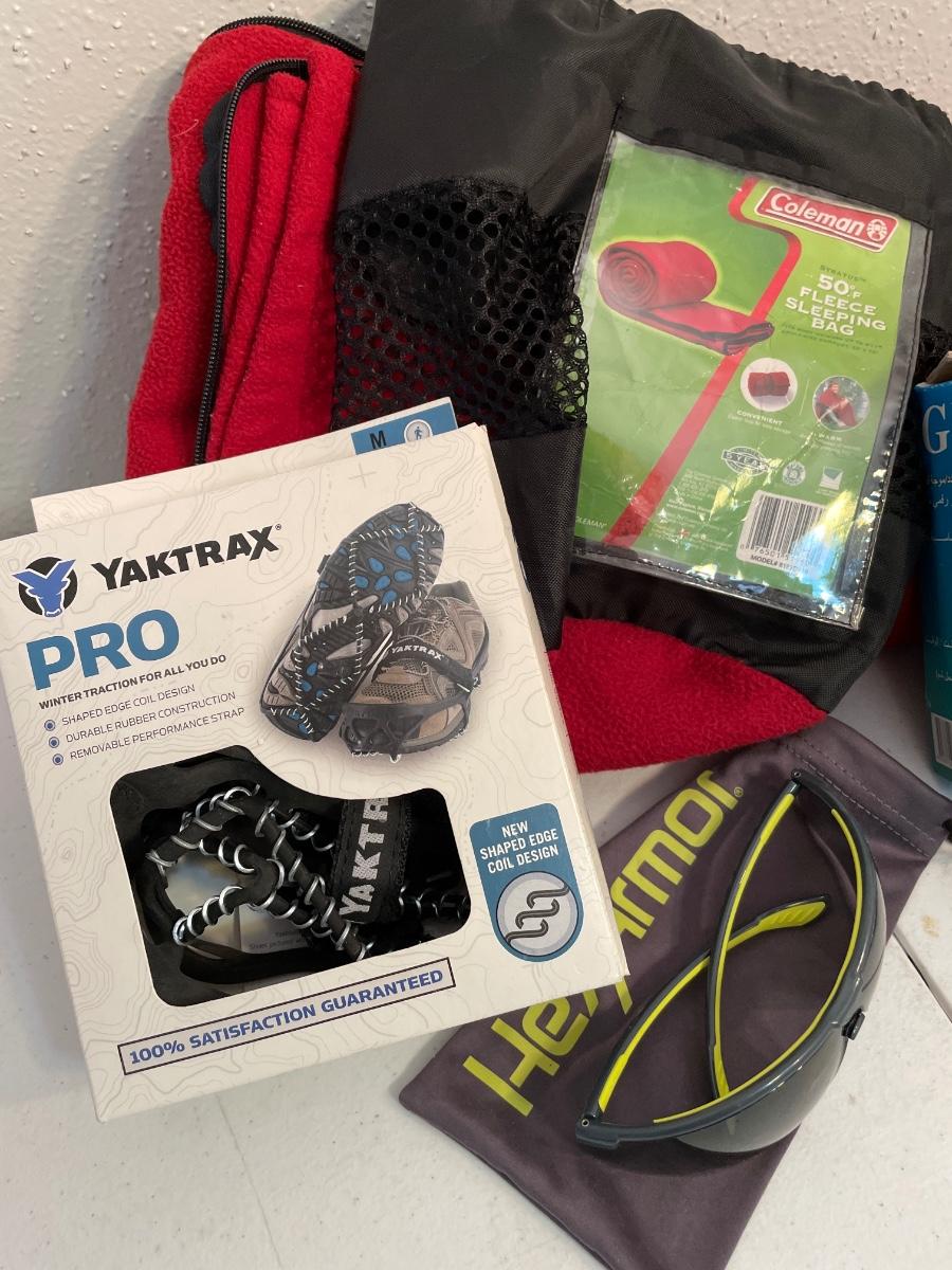 HexArmir sunglasses., Yaktrax, Coleman fleece sleeping bag, GYS digital radio