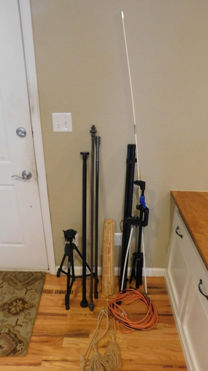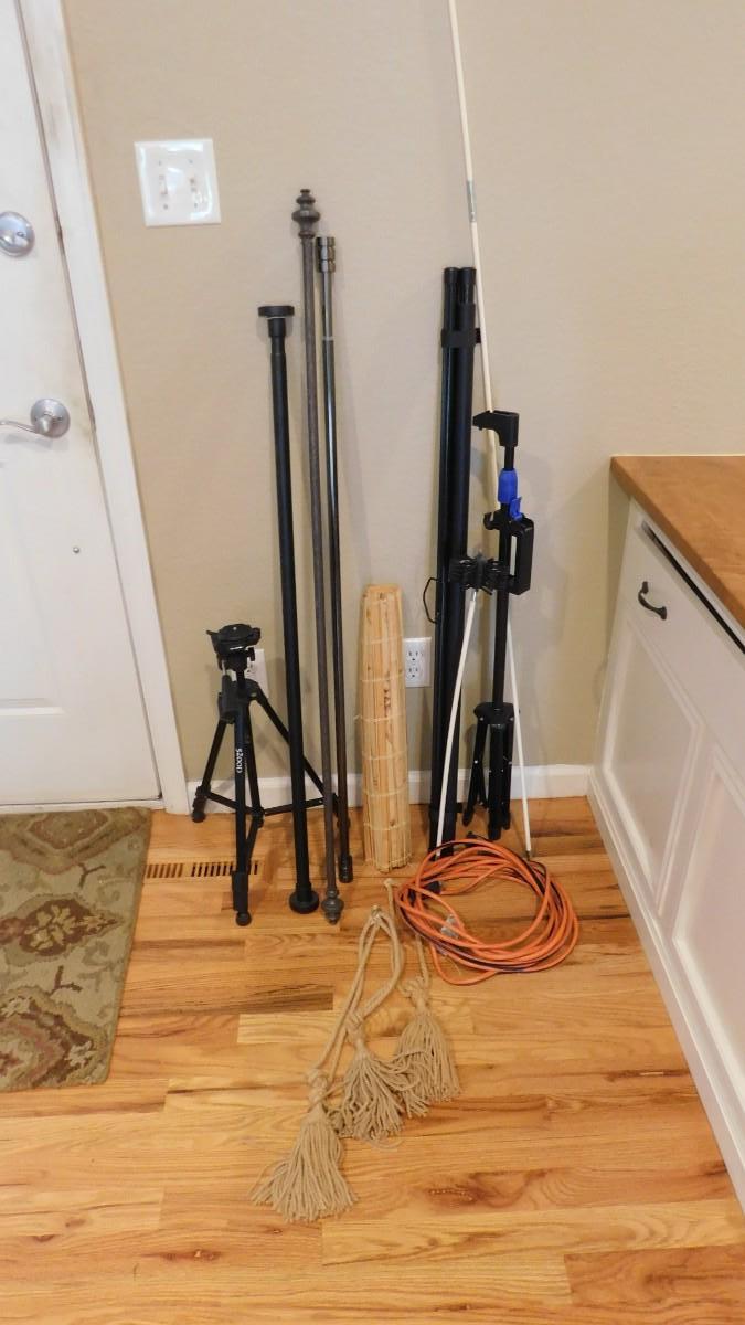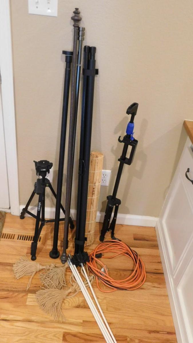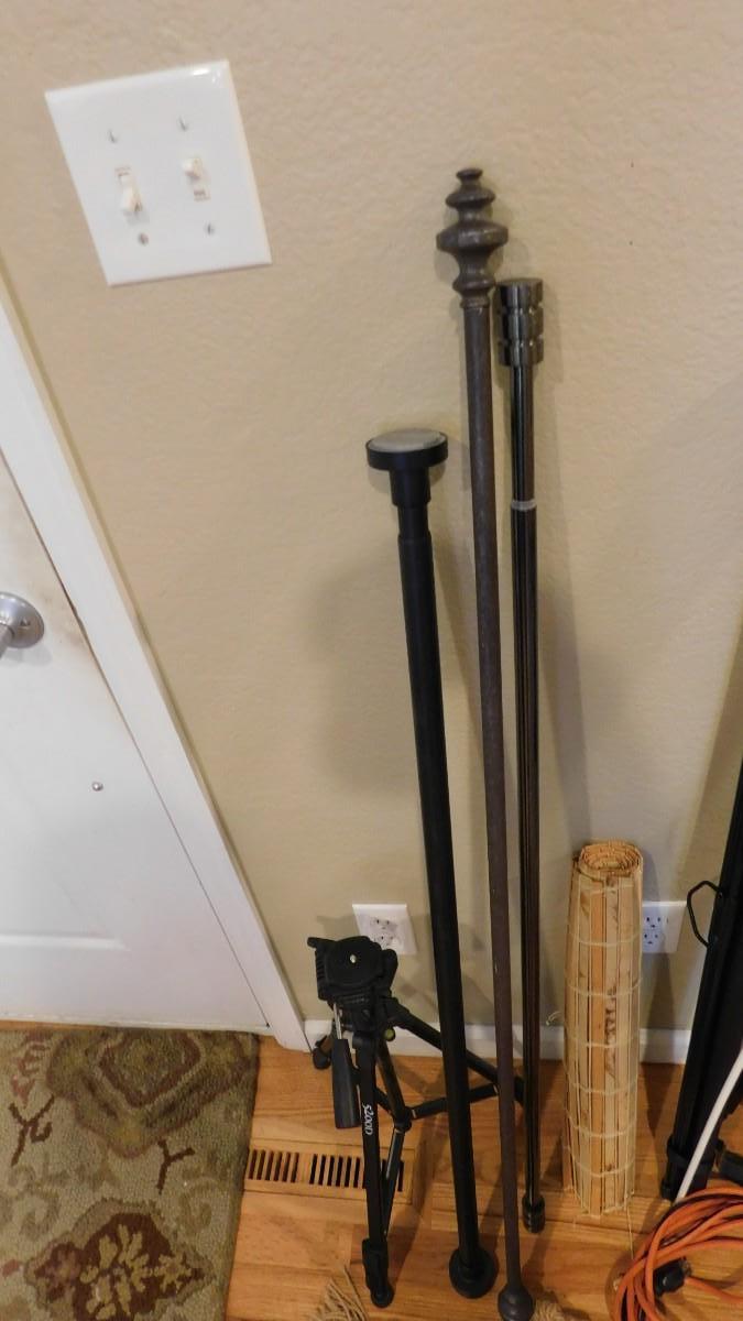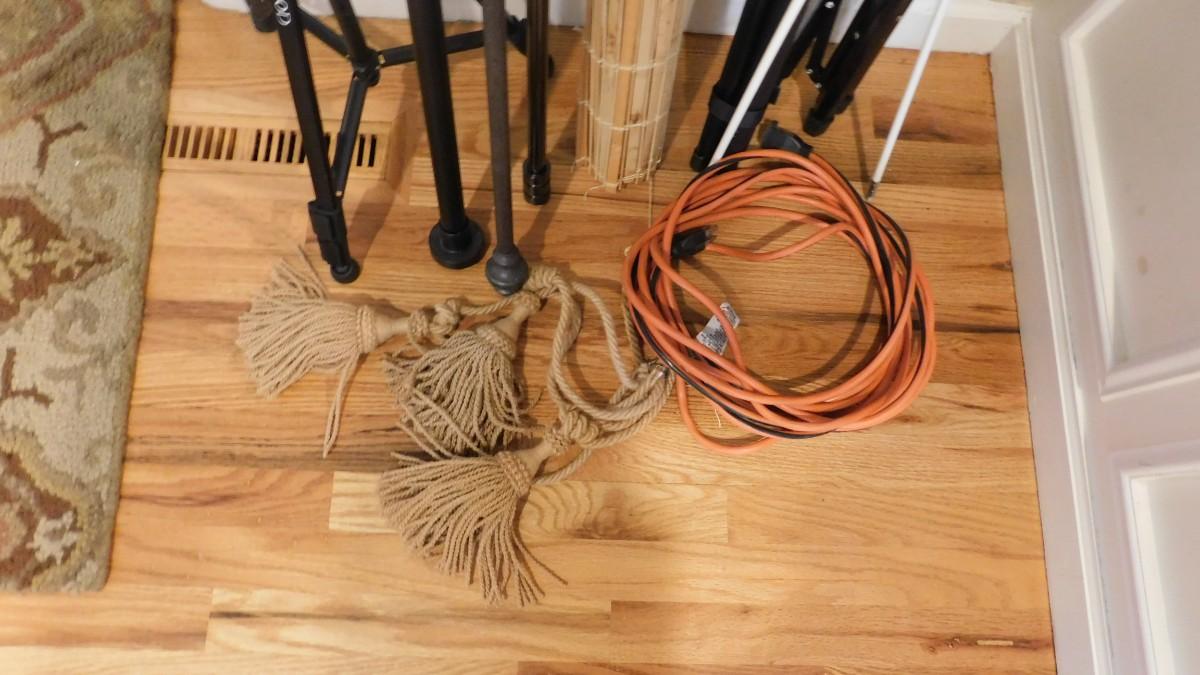 SHOWER CURTAIN ROD, CURTAIN RODS, TRIPOD, BRAND NEW PROJECTOR SCREEN, EXTENSION CORD, CURTAIN TIE BACKS AND MORE