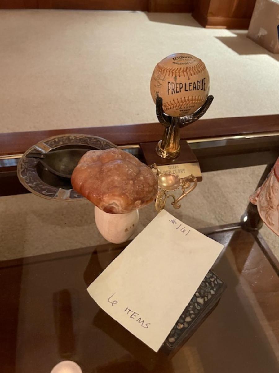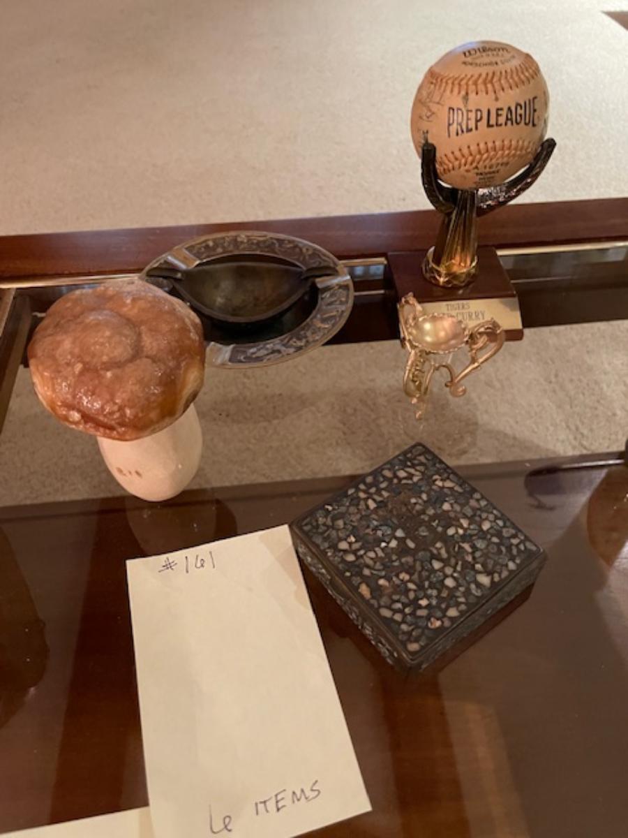 Ashtrays, metal cigarette box, mushroom art, prep league baseball,