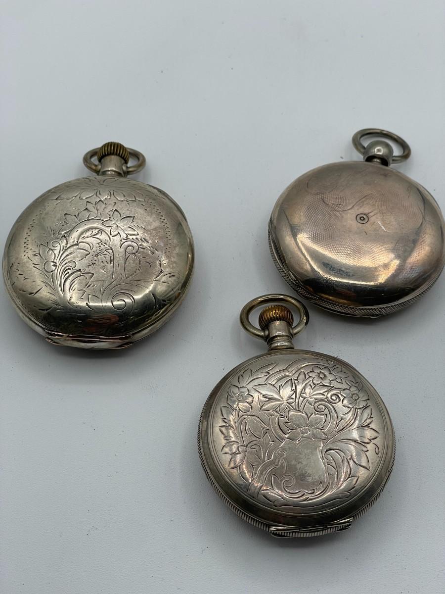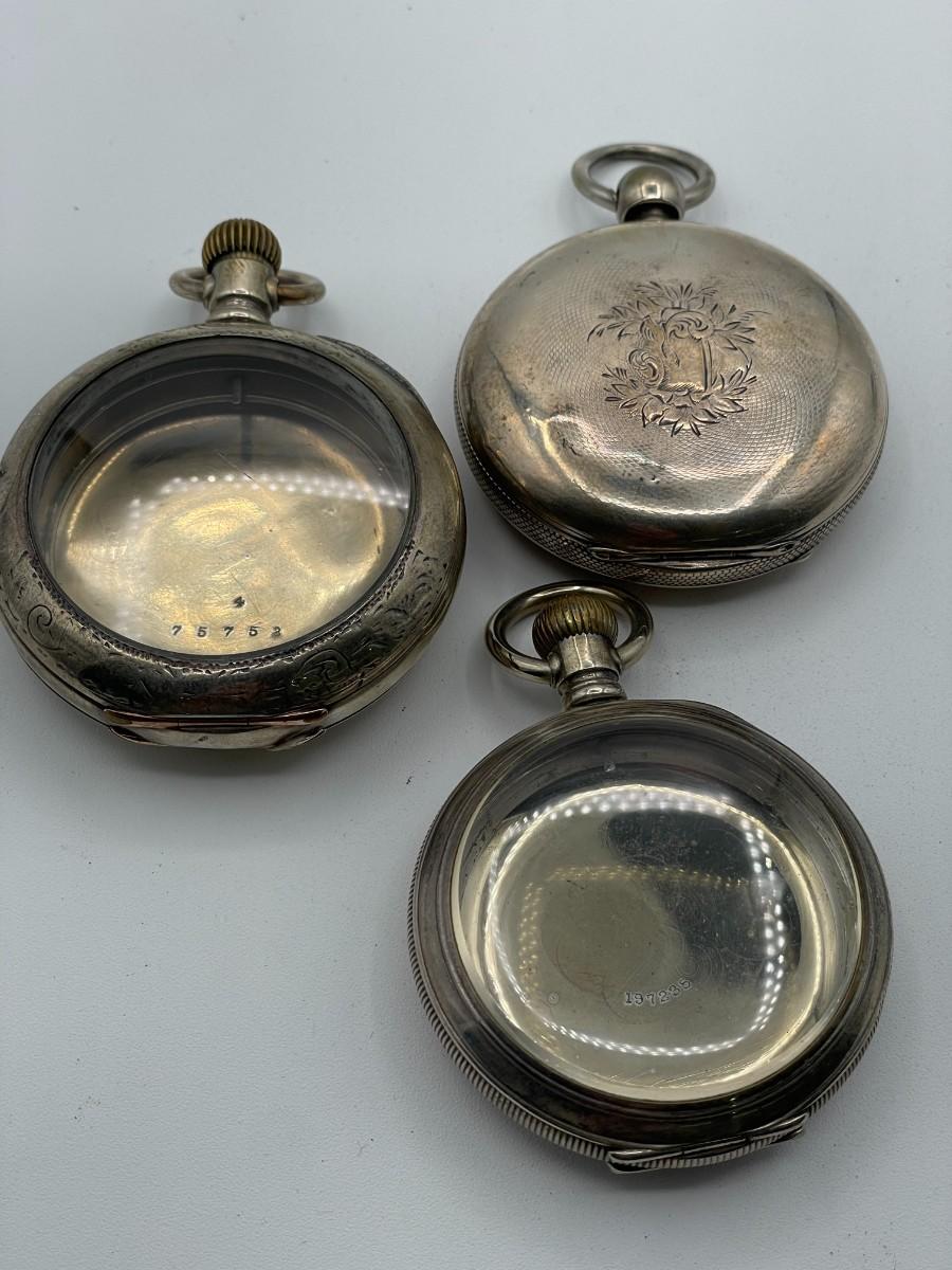 3 Asst. Coin Silver Pocket Watch Cases; 2 for 18s watch, 1 for 16s watch.