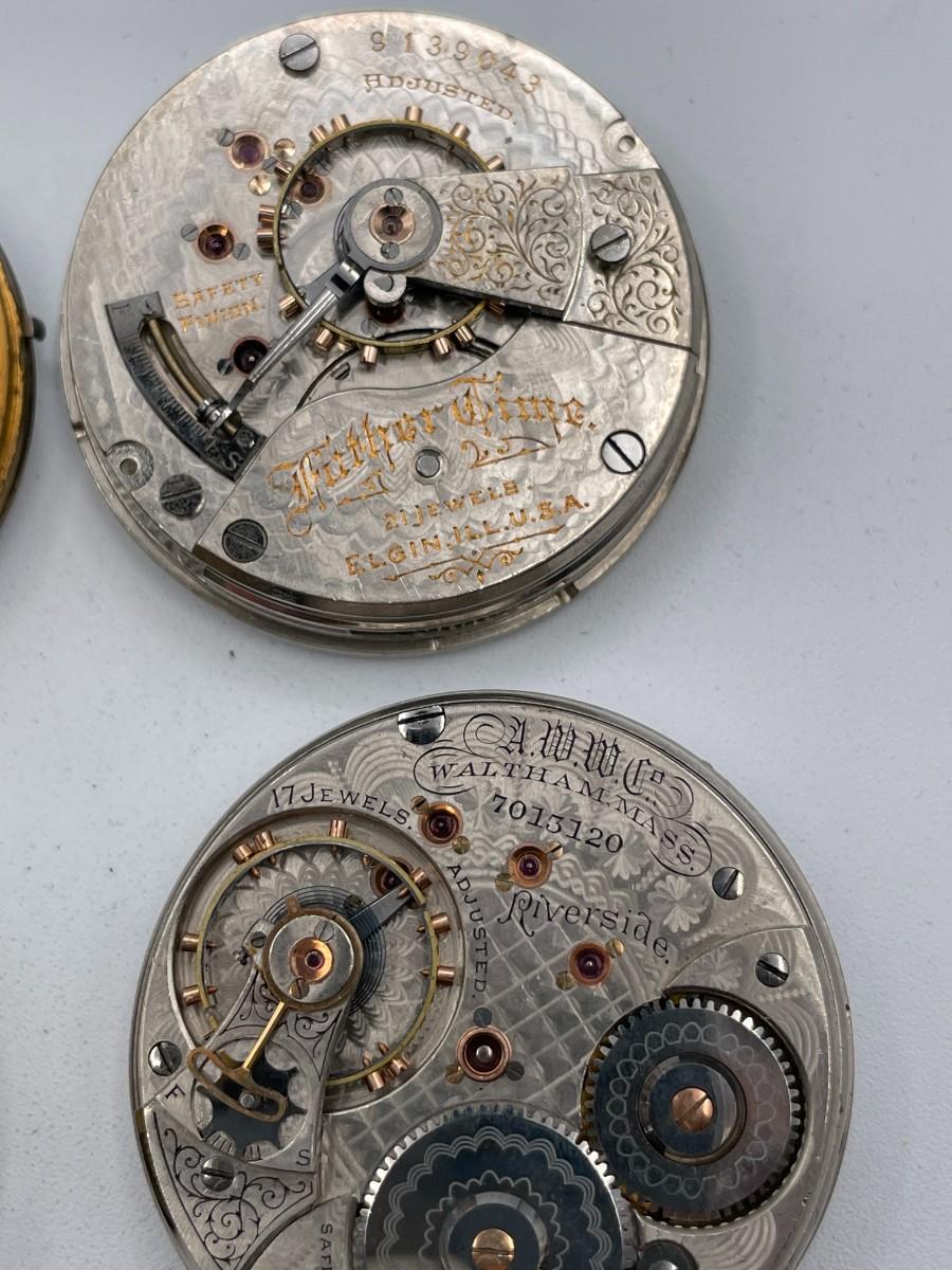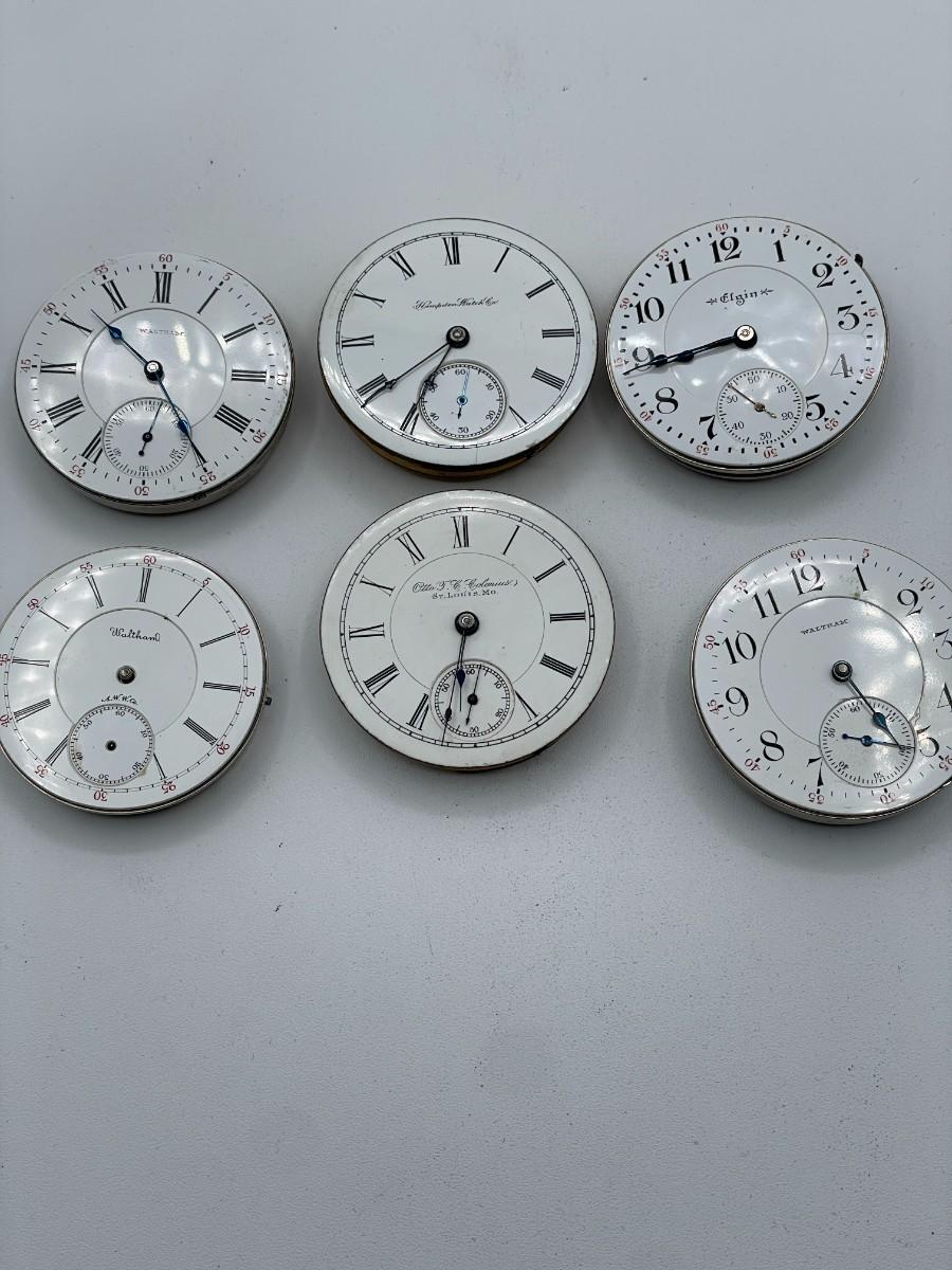 6 Asst. Pocket Watches: Elgin 9139043, Waltham 7013120, Waltham 12041233, Waltham 6028330, Hampden 907078, Otto 791126. NO CASES. Watches are NOT in working order and for parts only.