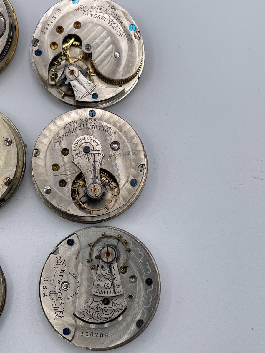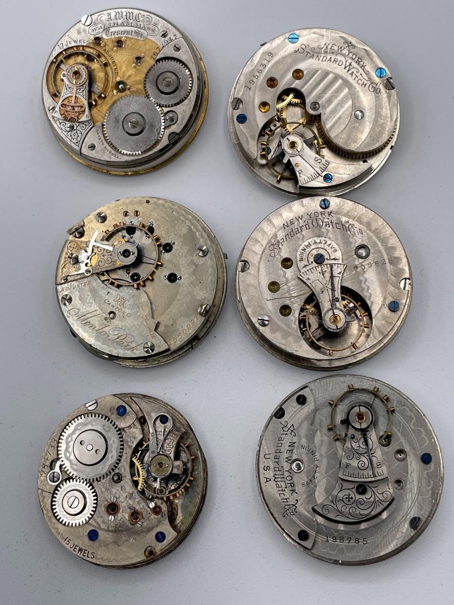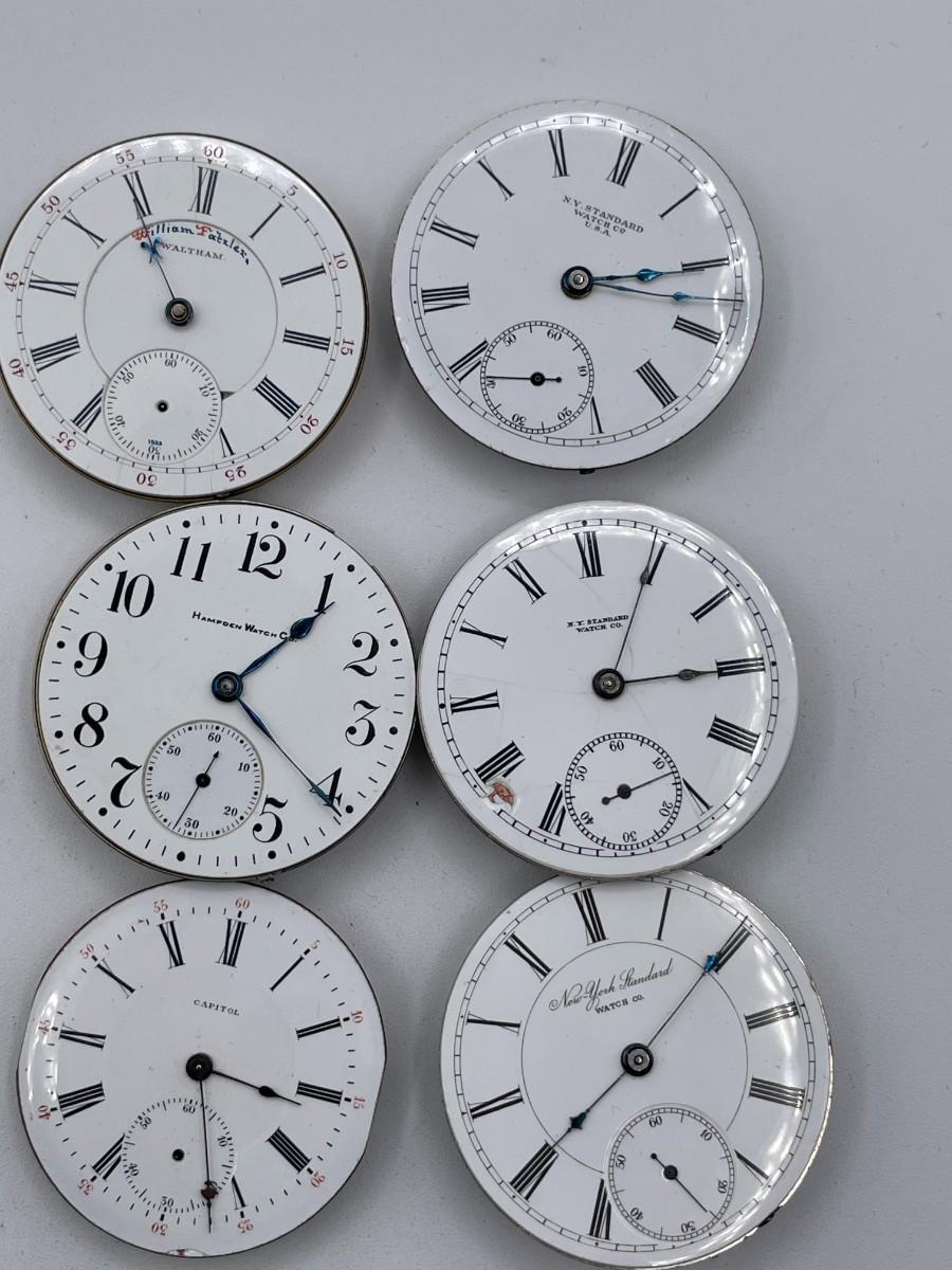 6 Asst. Pocket Watches: NY Standard 708828, Wm. Fatzlers 7672947, NY Standard 198785, NY Standard 1956319, Capitol 784733, Hampden 1560222. NO CASES. Watches are NOT in working order and for parts only.