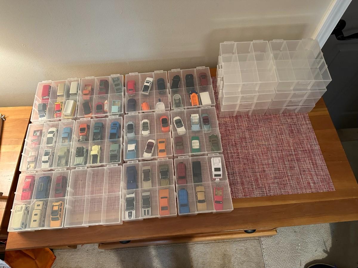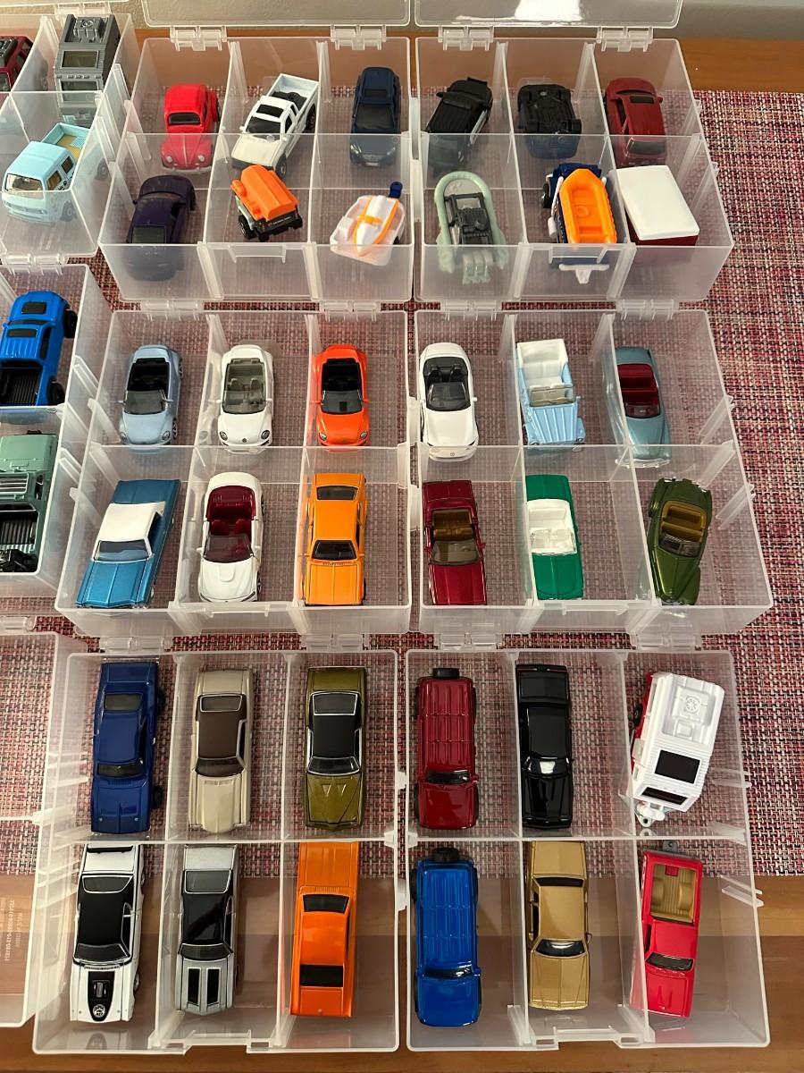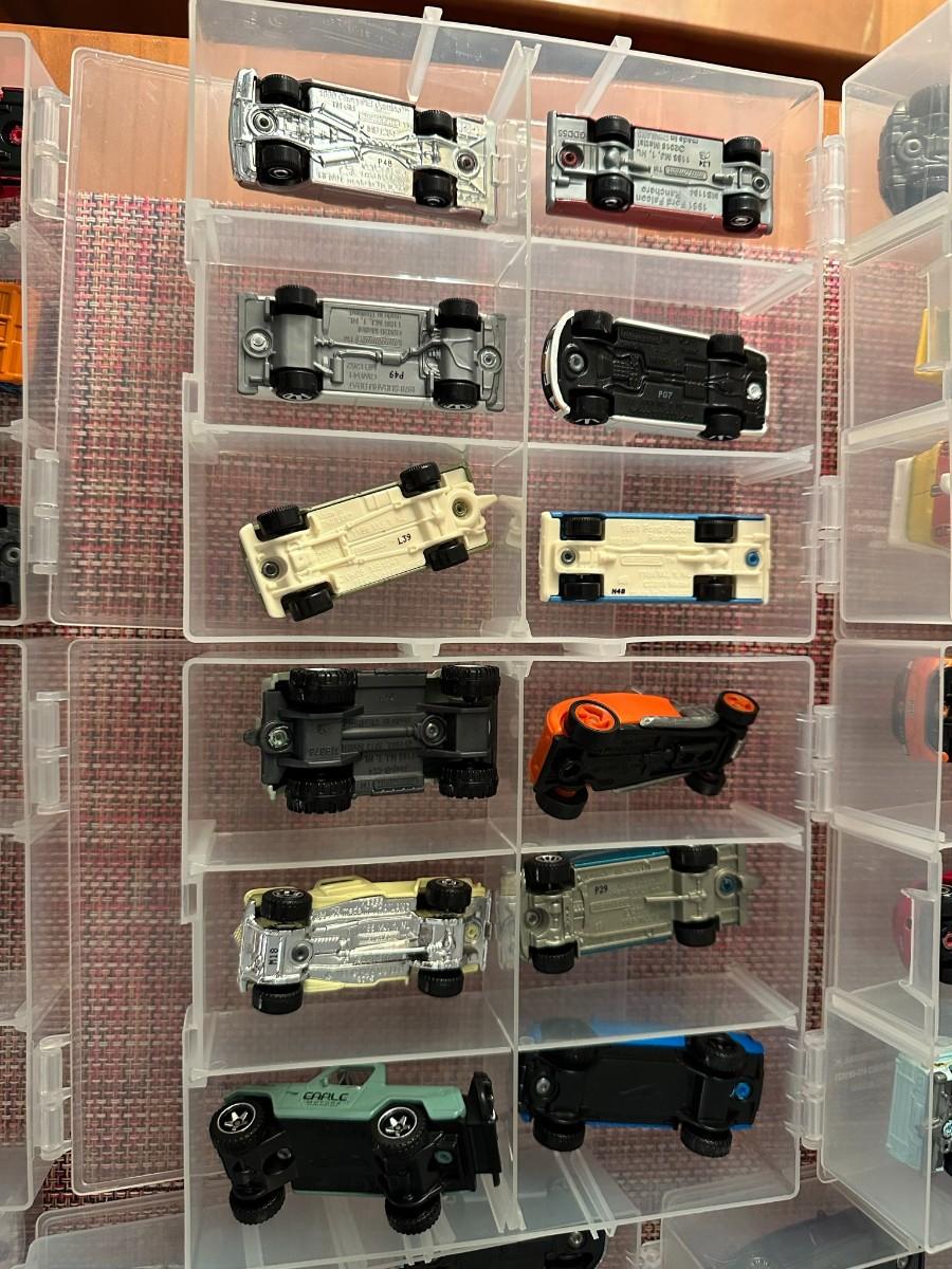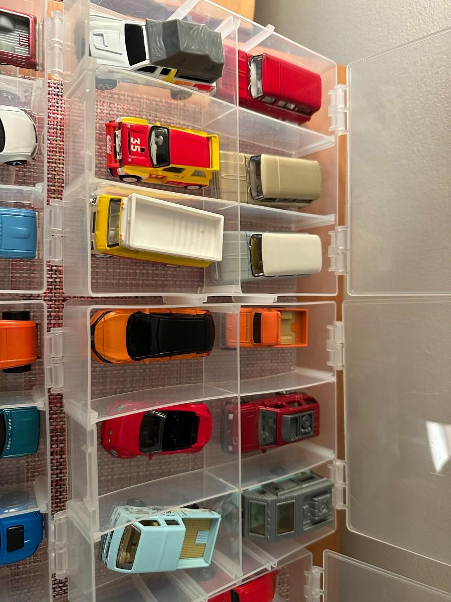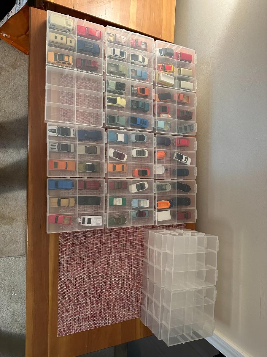 66 Assorted toy cars by Mattel plus others and 10 storage bins