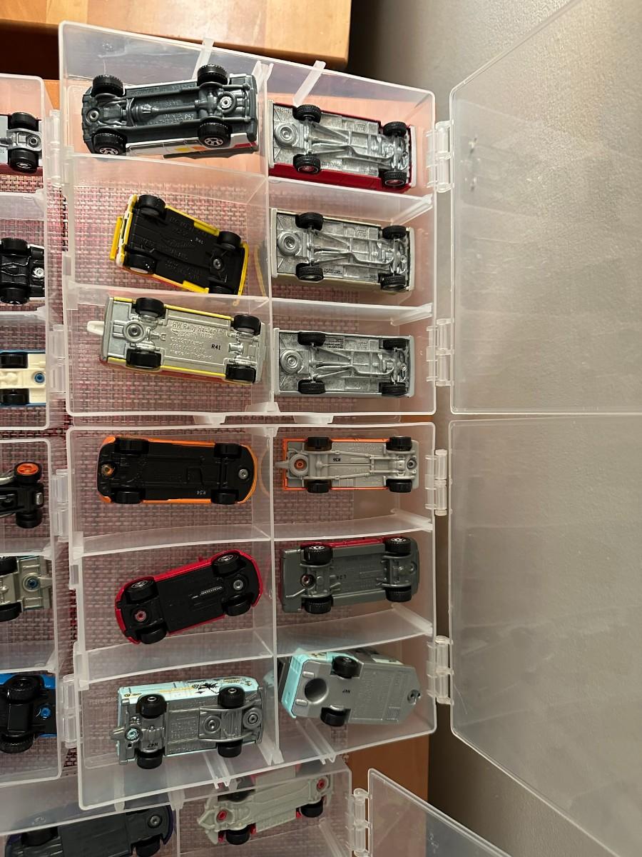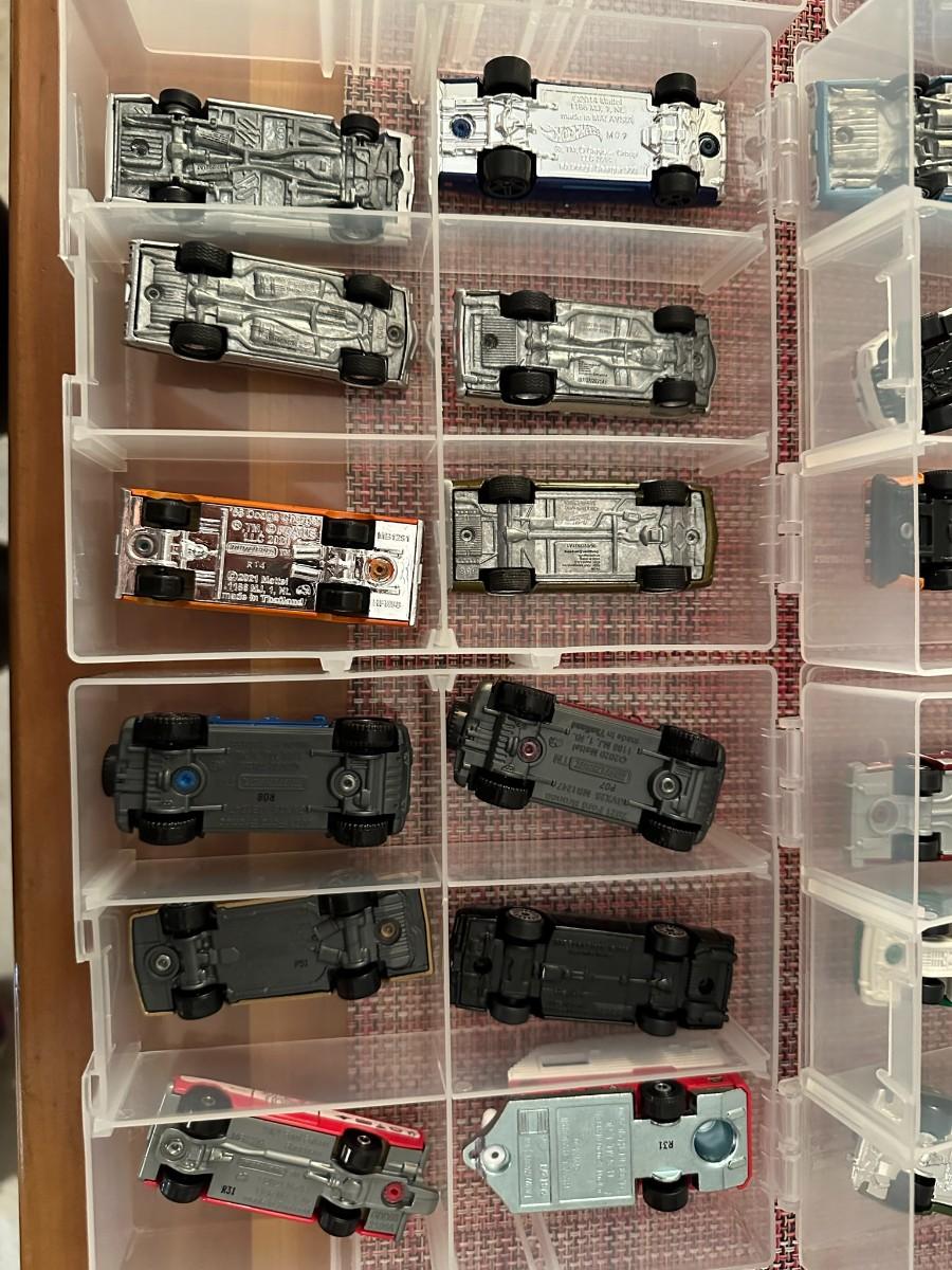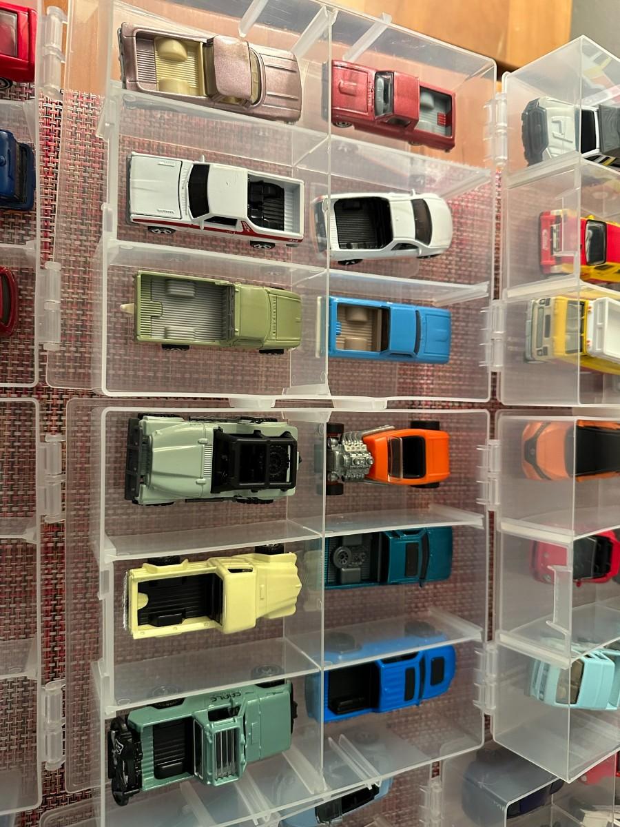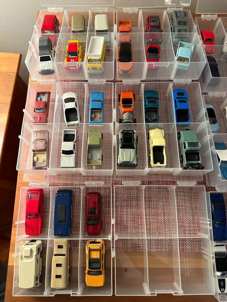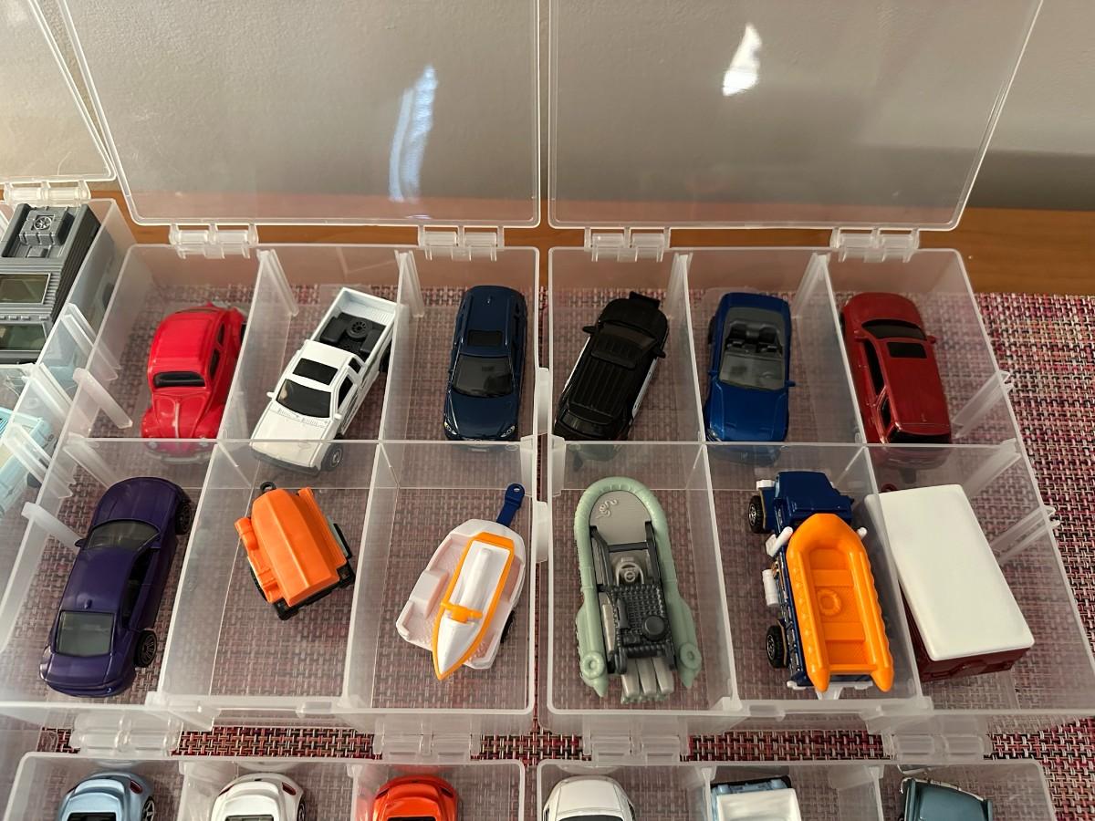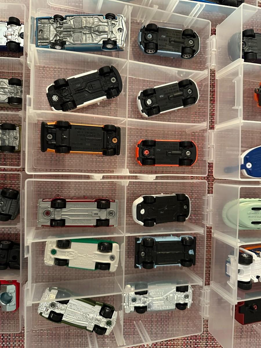 66 Assorted toy cars by Mattel plus others and 10 storage bins