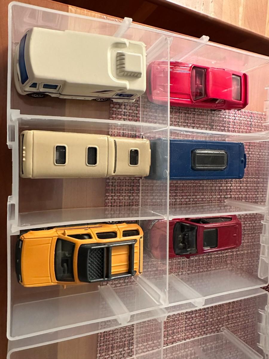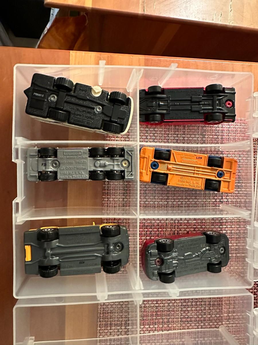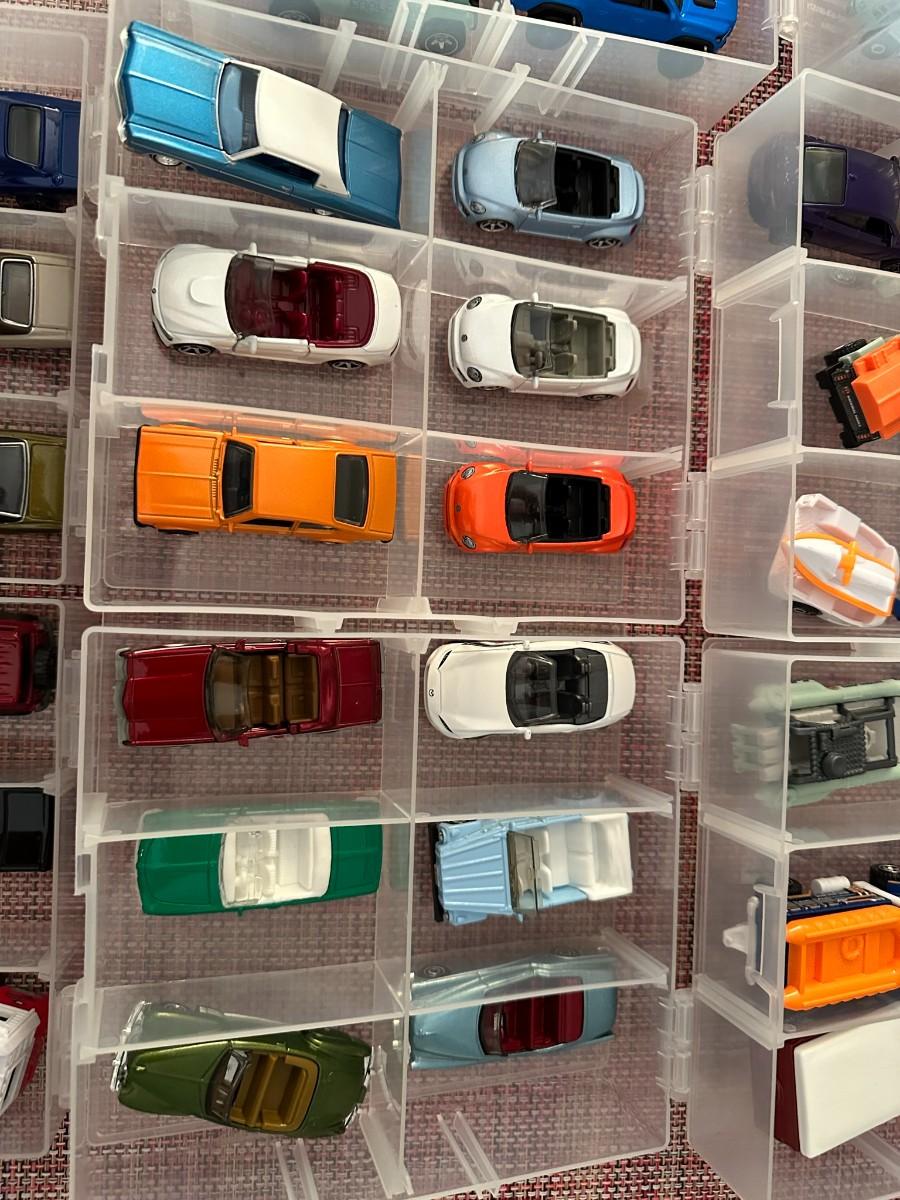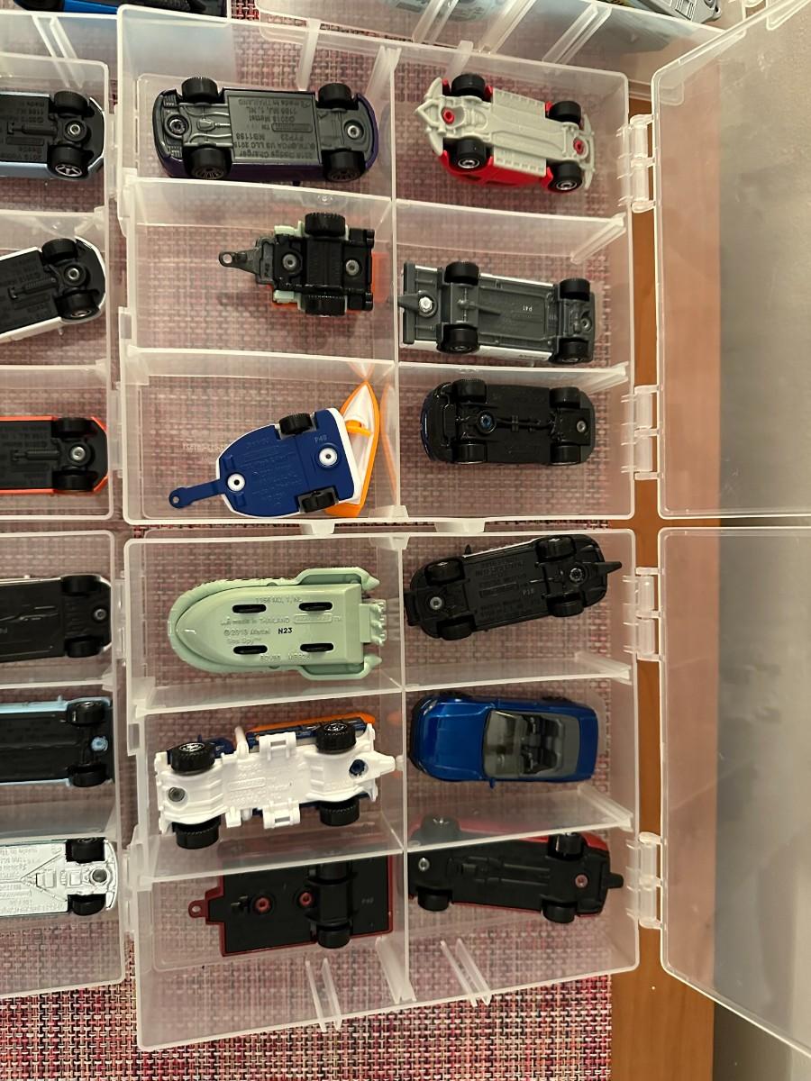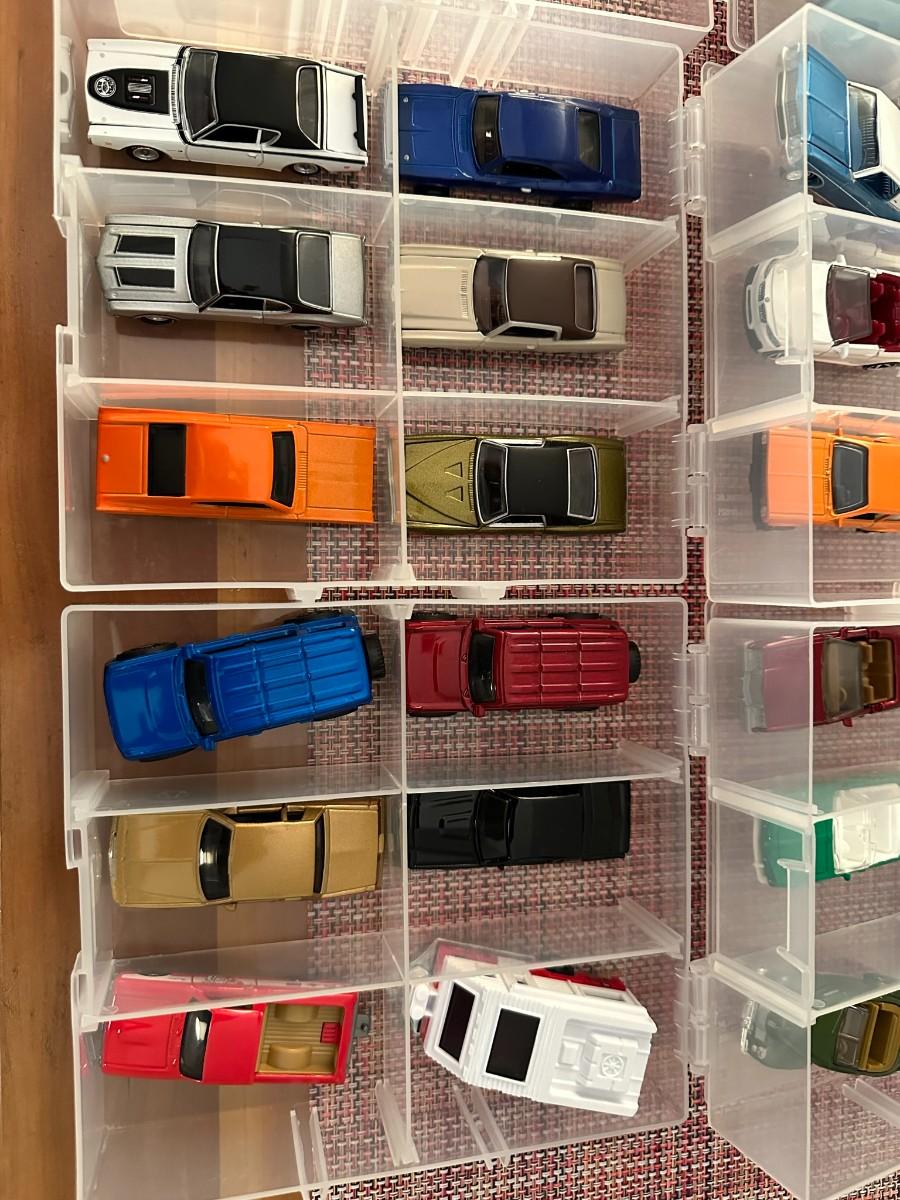 66 Assorted toy cars by Mattel plus others and 10 storage bins