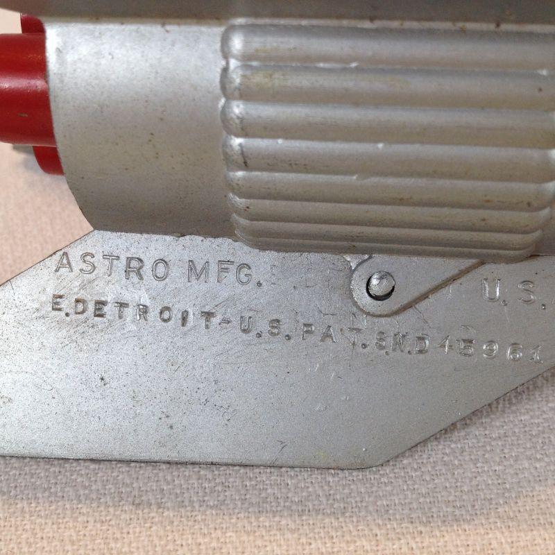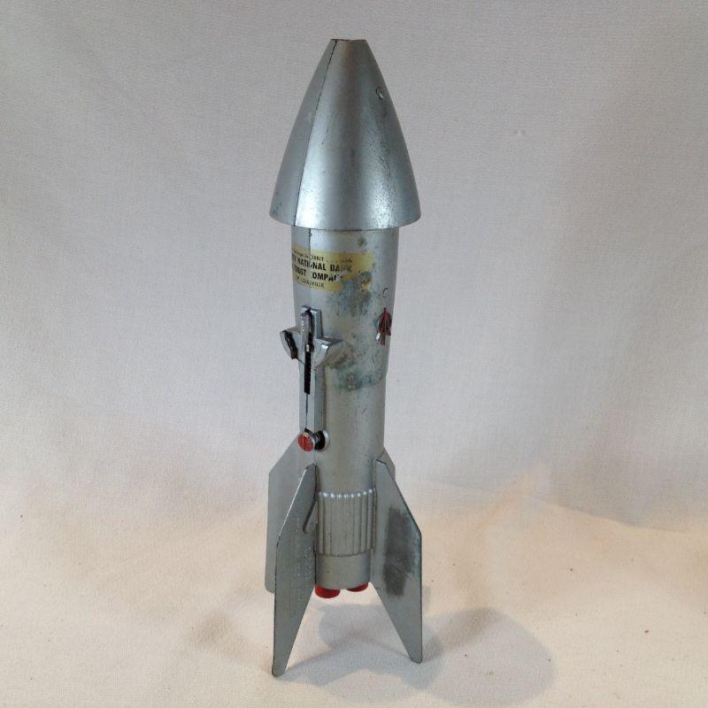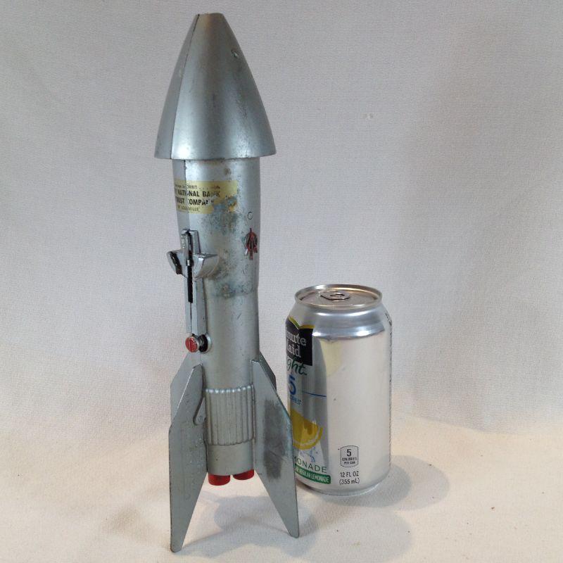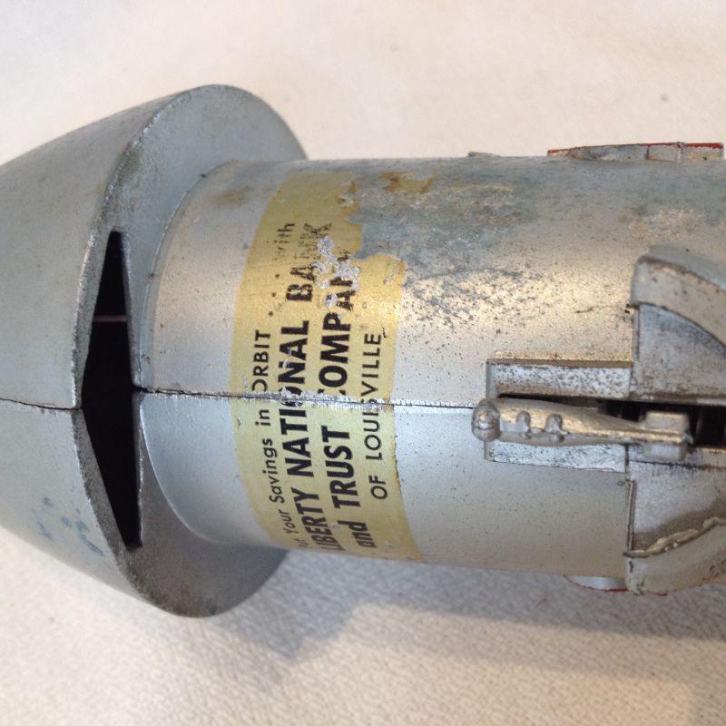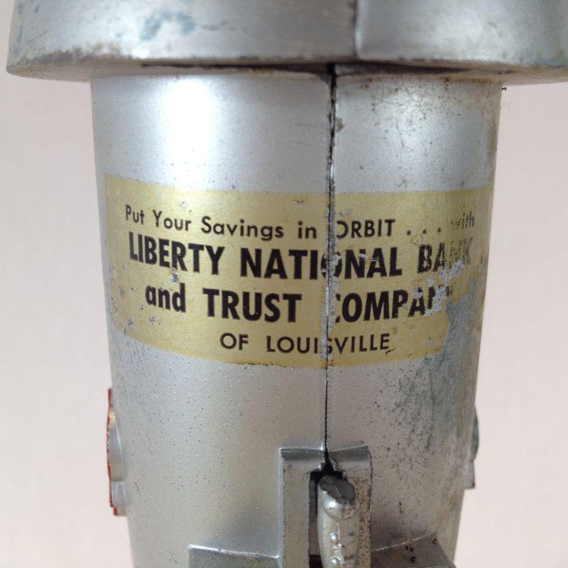 This is a vintage Rocket Bank, made by Astro Manufacturing, USA. These were given to children opening up their first savings account. It says "Put your savings in Orbit...Liberty National Bank & Trust Co. of Louisville." Made from a heavy metal. It takes a key to open unfortunately we don't have the key but we found several available on line. It is mechanical - you place the coin in the slot and pull back the trigger and it shoots the coin into a slot in the bottom of the nose. - so very cool. This has a starting bid/reserve of $15.00.