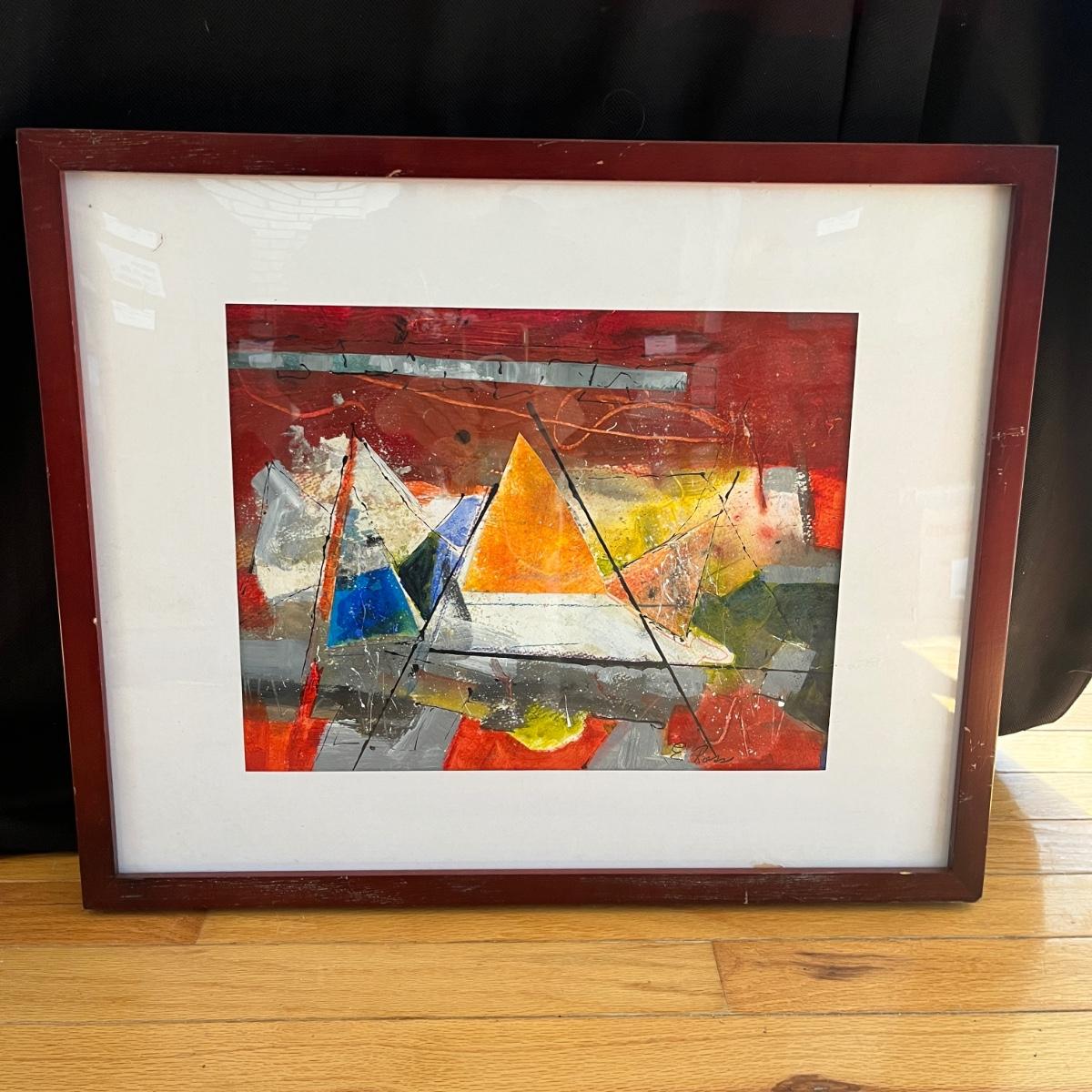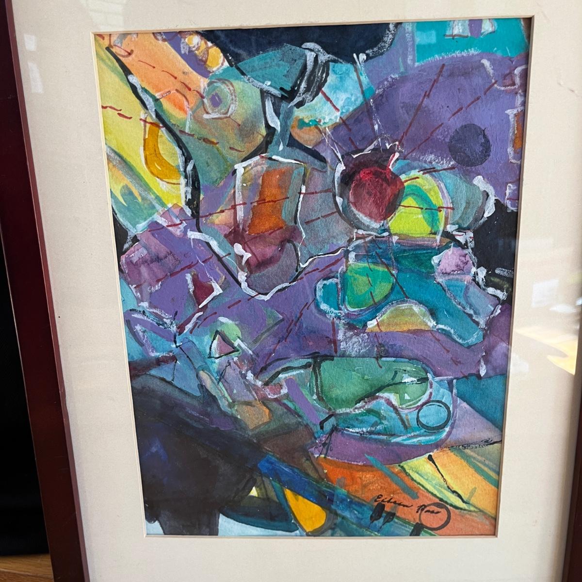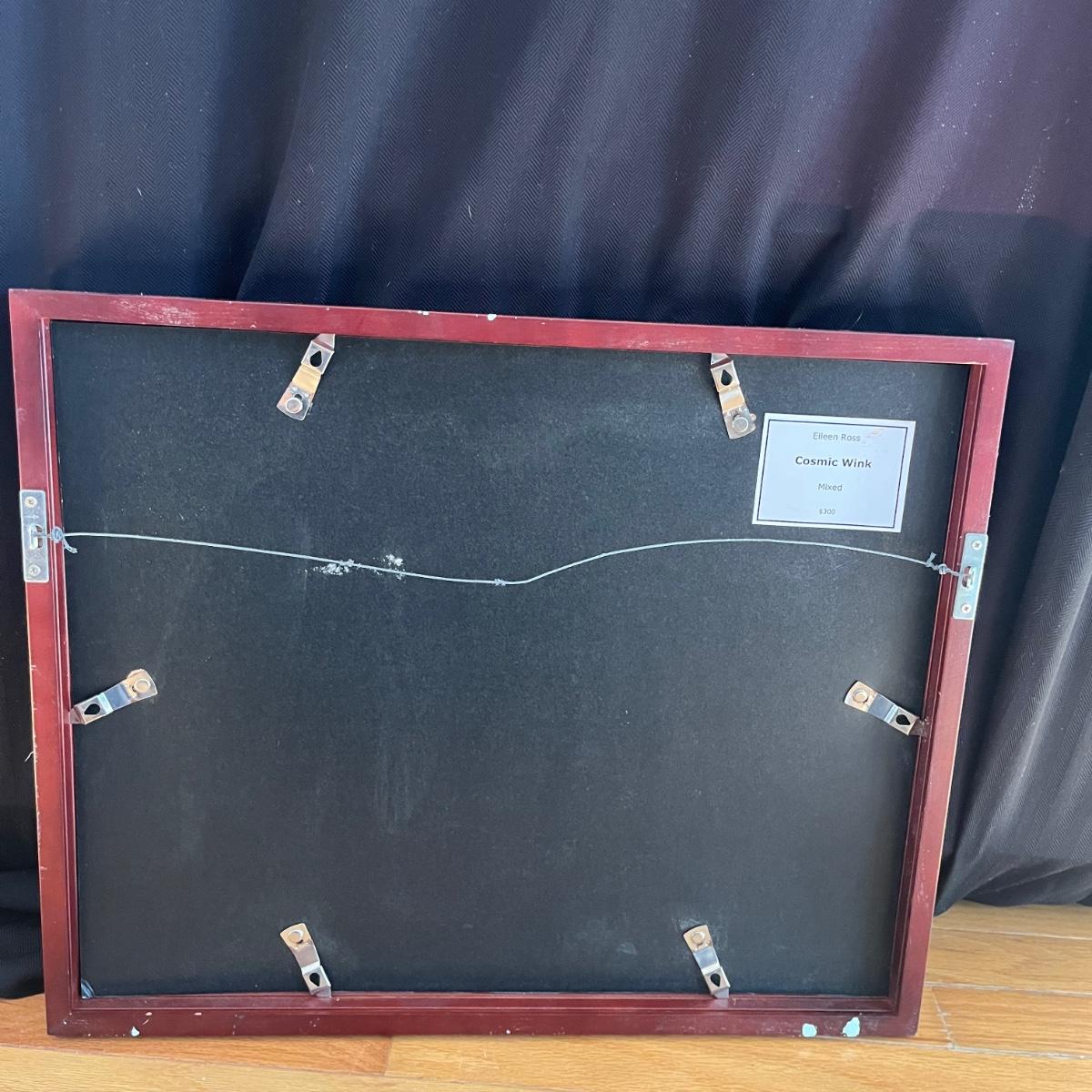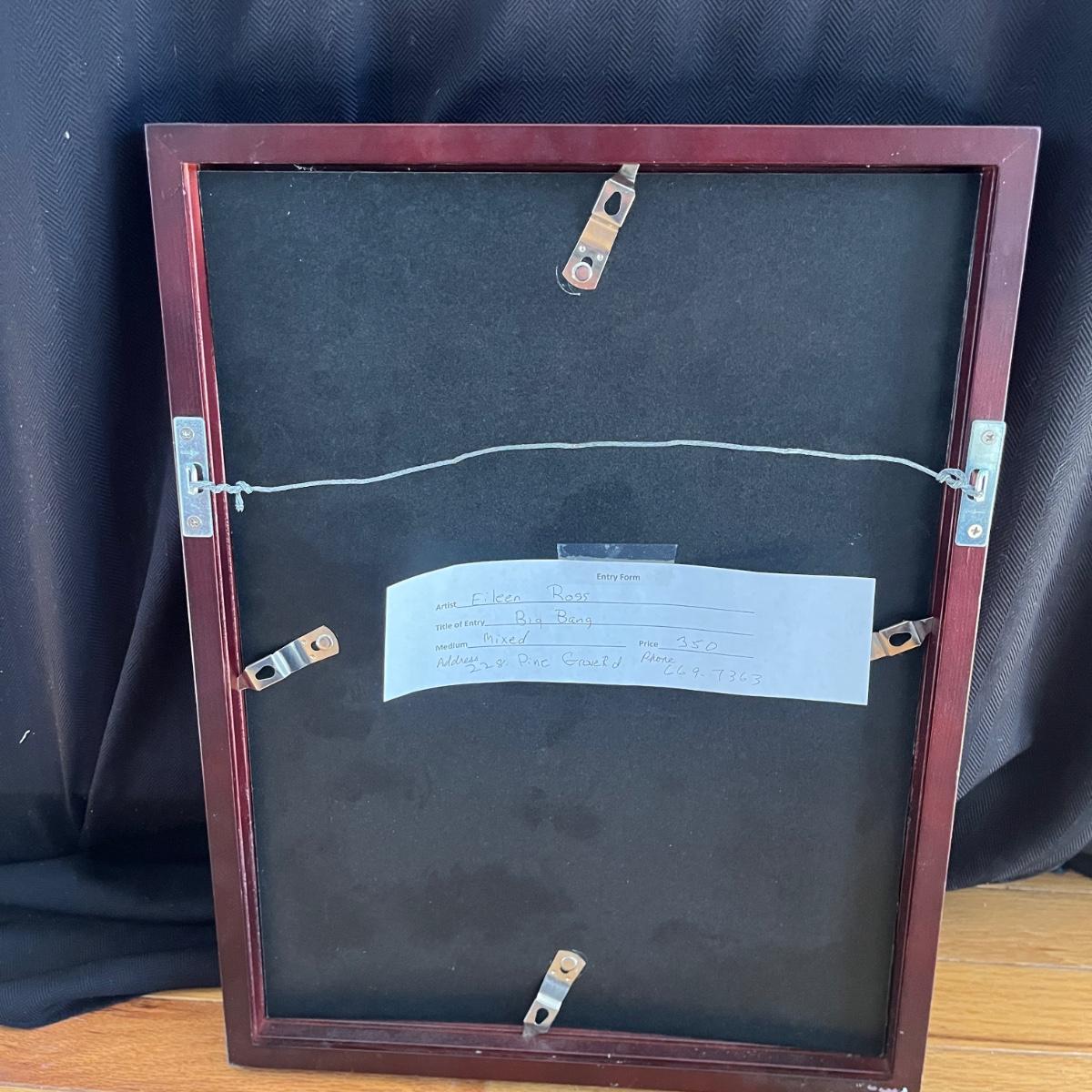 Lot includes two astronomy themed original art pieces in wood frames under glass The titles are 'Big Bang' & 'Cosmic Wink'. Largest frame measures 21” x 17”H.