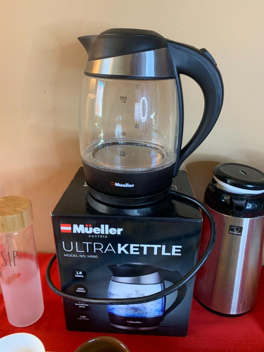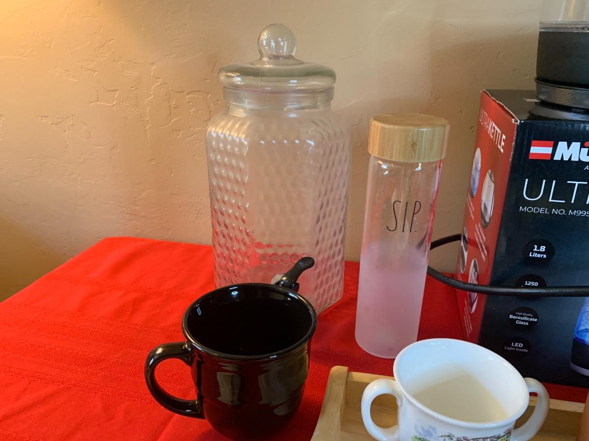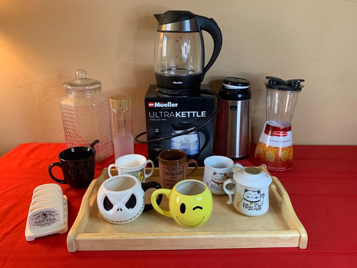 Everything you need for a barista experience at home! Includes an electric kettle, tray, mugs, coffee pitcher, Rubbermaid plastic carafe, a ceramic toast rack, a Chinese waving kitty sugar and creamer and a glass drink dispenser.