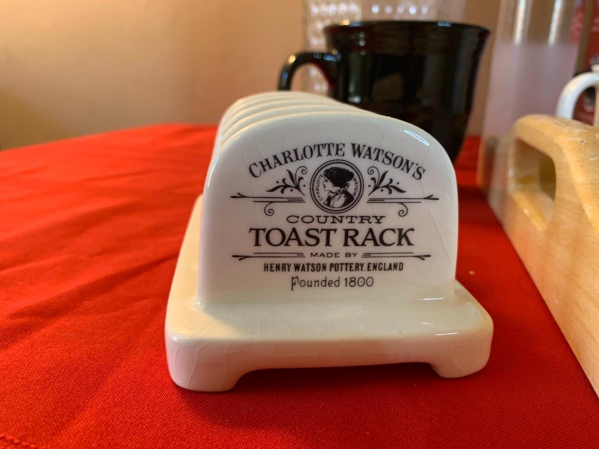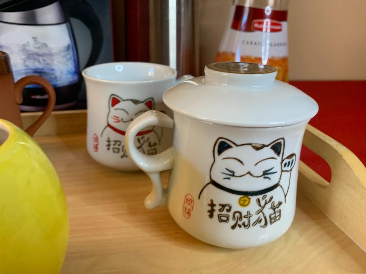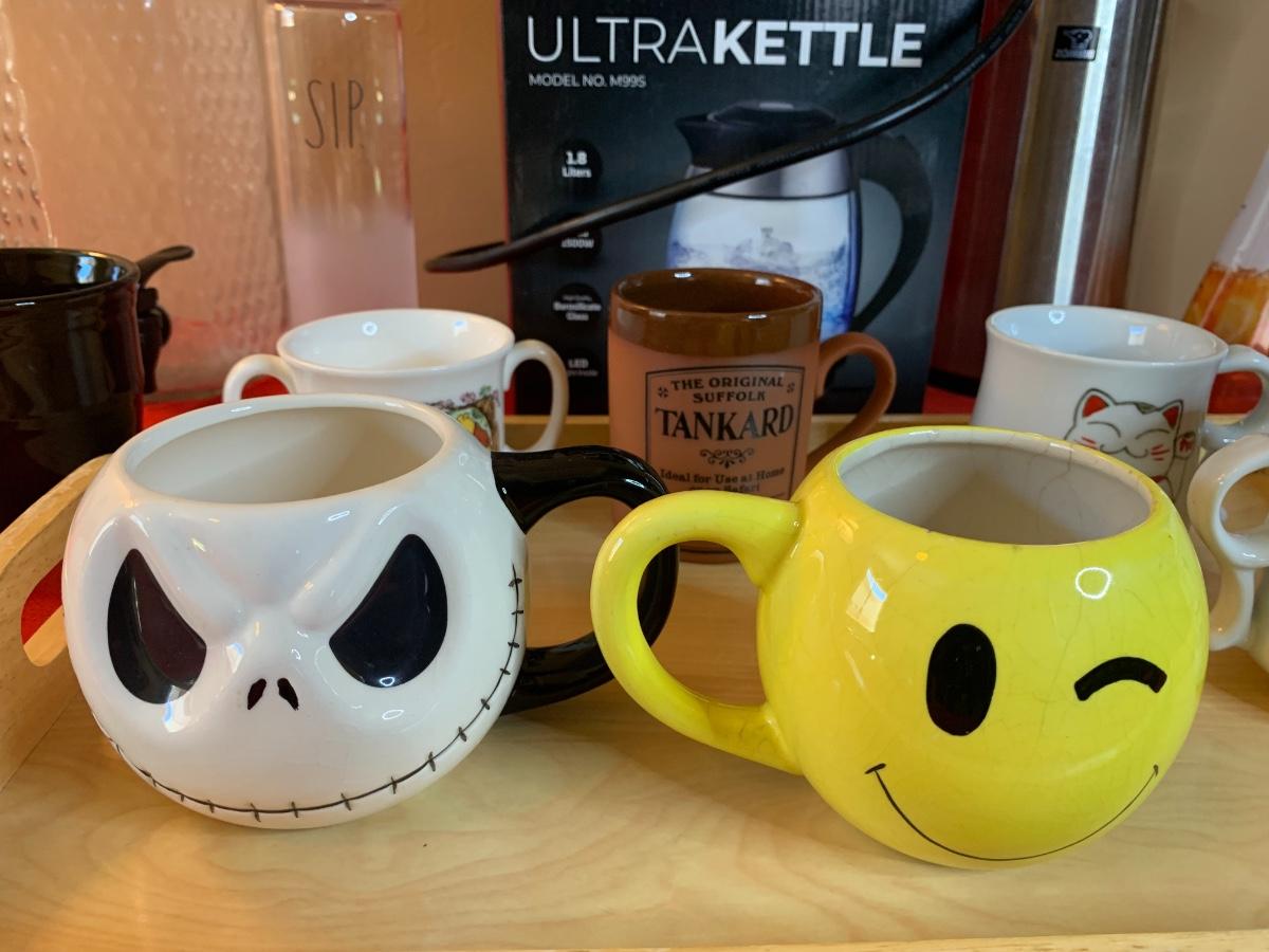 Everything you need for a barista experience at home! Includes an electric kettle, tray, mugs, coffee pitcher, Rubbermaid plastic carafe, a ceramic toast rack, a Chinese waving kitty sugar and creamer and a glass drink dispenser.