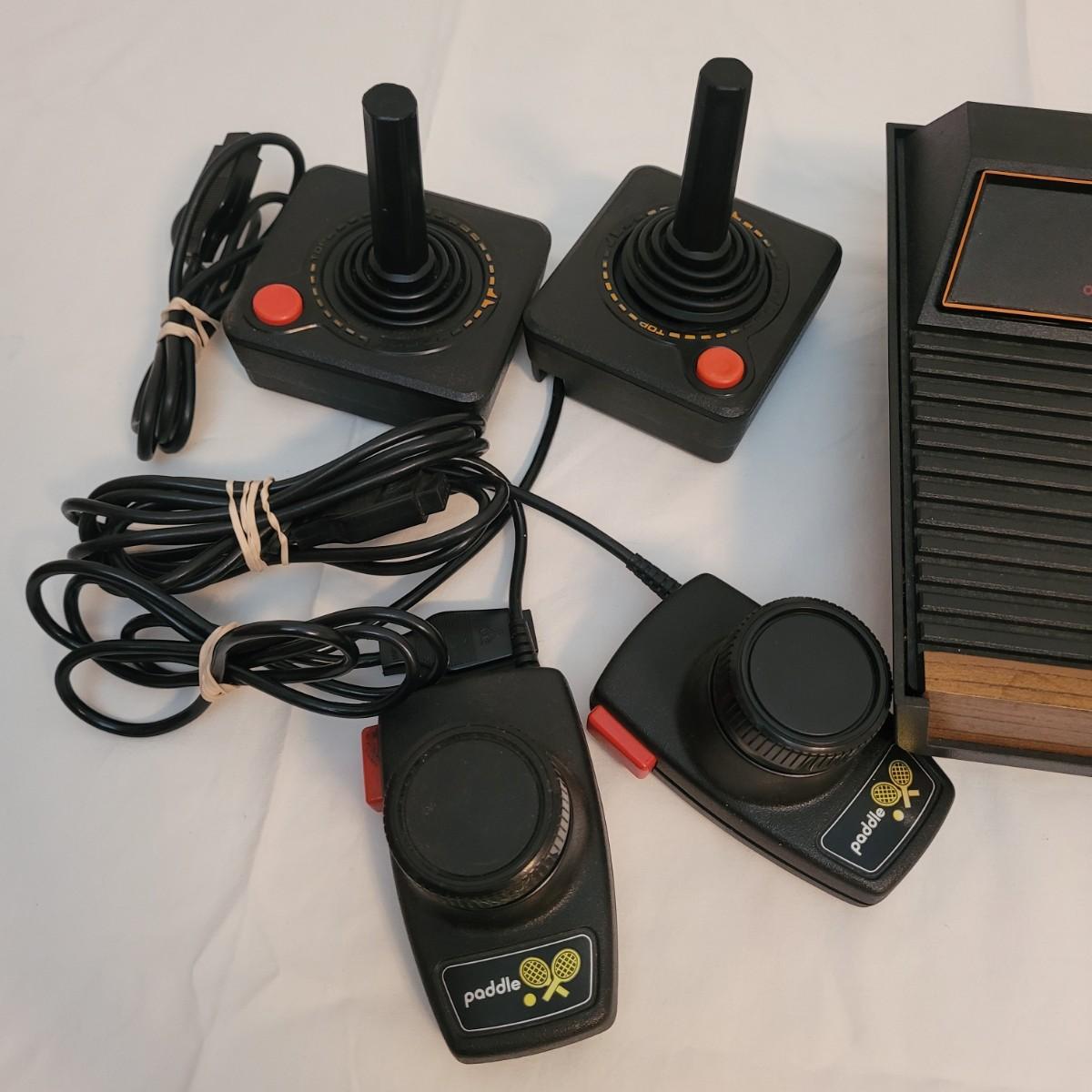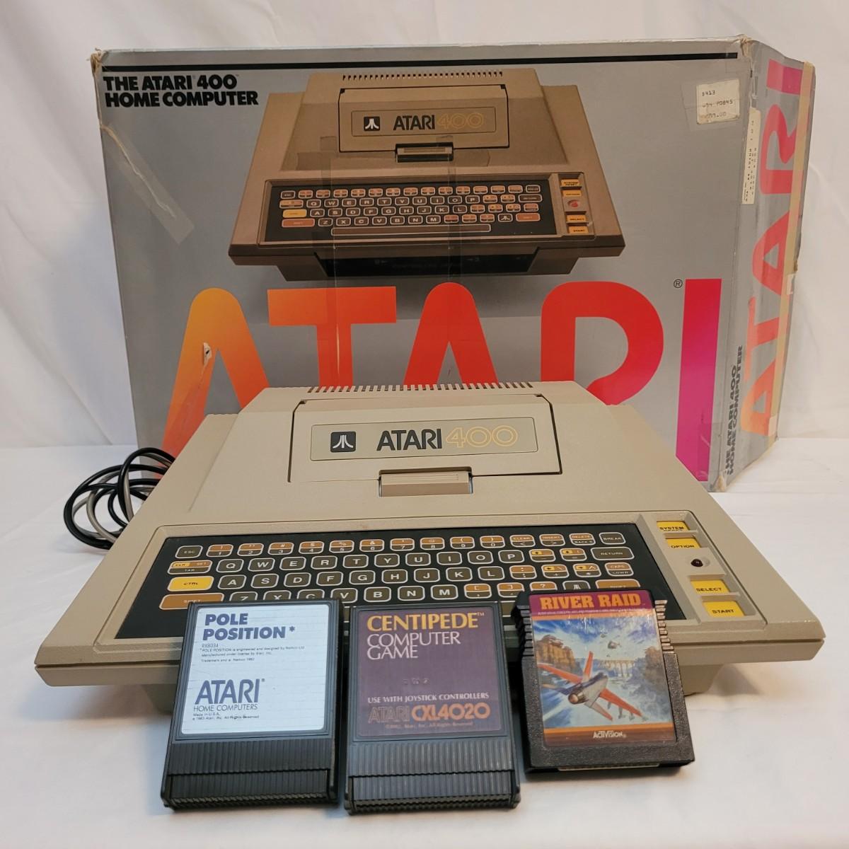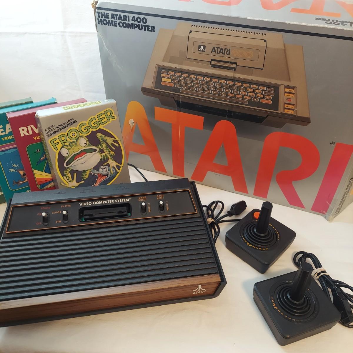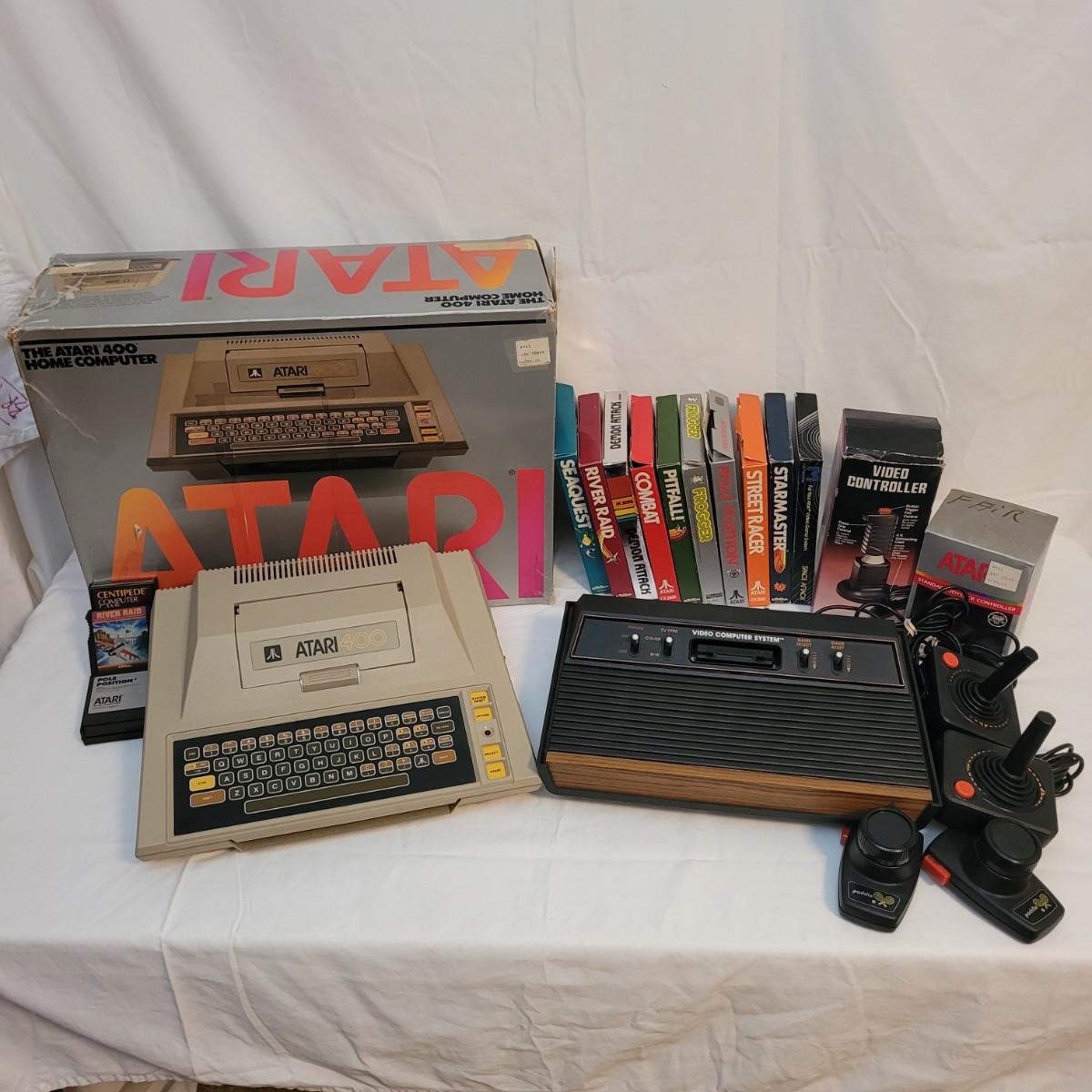 This lot includes an Atari 2600 system, an Atari 400 system, game cartridges, joysticks, controllers, and cables. Both Atari systems powered on when plugged in but were not hooked up to a TV to be tested. Individual game cartridges and controllers have not been fully tested. There are two joysticks and two paddles with the 2600 system, with two backup joysticks for parts. There is also a pistol grip game controller for use with the 2600. Game cartridges for the 2600 include "Seaquest", "River Raid", "Demon Attack", "Combat", "Pitfall", "Frogger", "Pole Position", "Street Racer", "Starmaster", and "Space Attack". Cartridges for the 400 include "Centipede ", "Pole Position", and "River Raid".