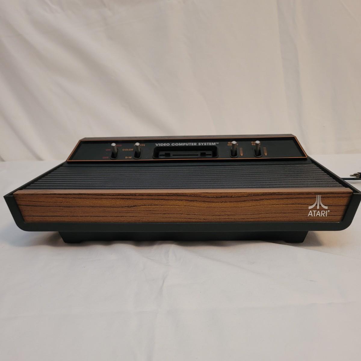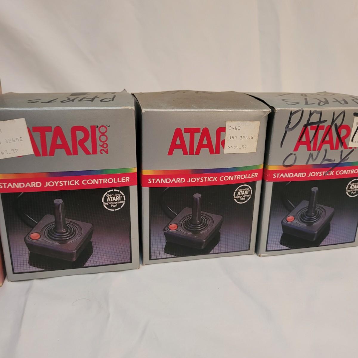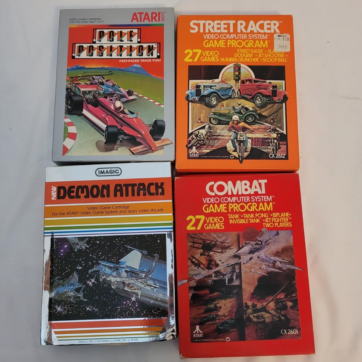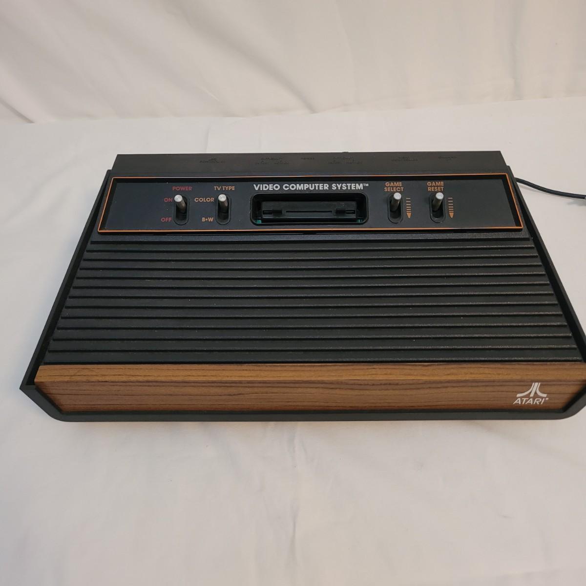 This lot includes an Atari 2600 system, an Atari 400 system, game cartridges, joysticks, controllers, and cables. Both Atari systems powered on when plugged in but were not hooked up to a TV to be tested. Individual game cartridges and controllers have not been fully tested. There are two joysticks and two paddles with the 2600 system, with two backup joysticks for parts. There is also a pistol grip game controller for use with the 2600. Game cartridges for the 2600 include "Seaquest", "River Raid", "Demon Attack", "Combat", "Pitfall", "Frogger", "Pole Position", "Street Racer", "Starmaster", and "Space Attack". Cartridges for the 400 include "Centipede ", "Pole Position", and "River Raid".