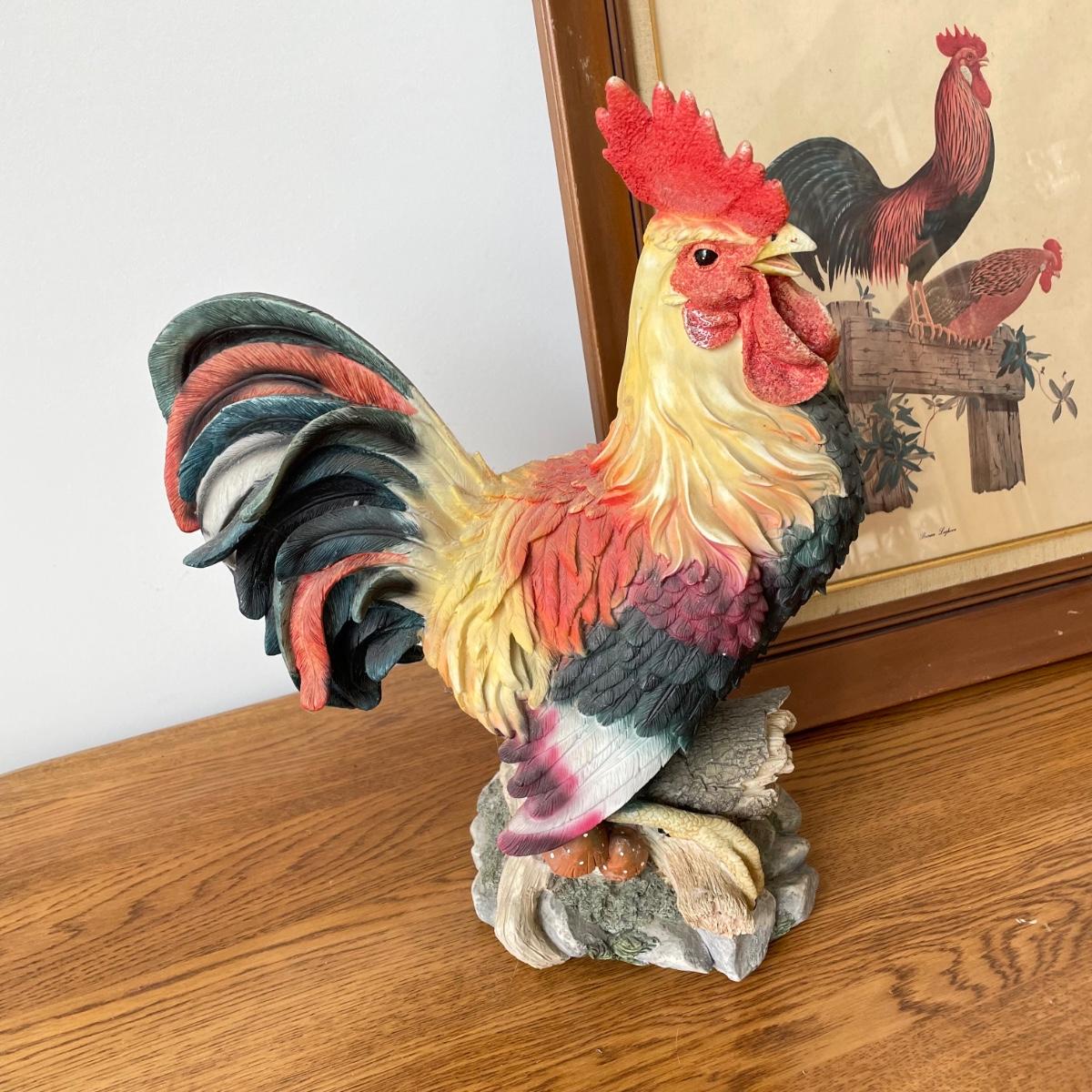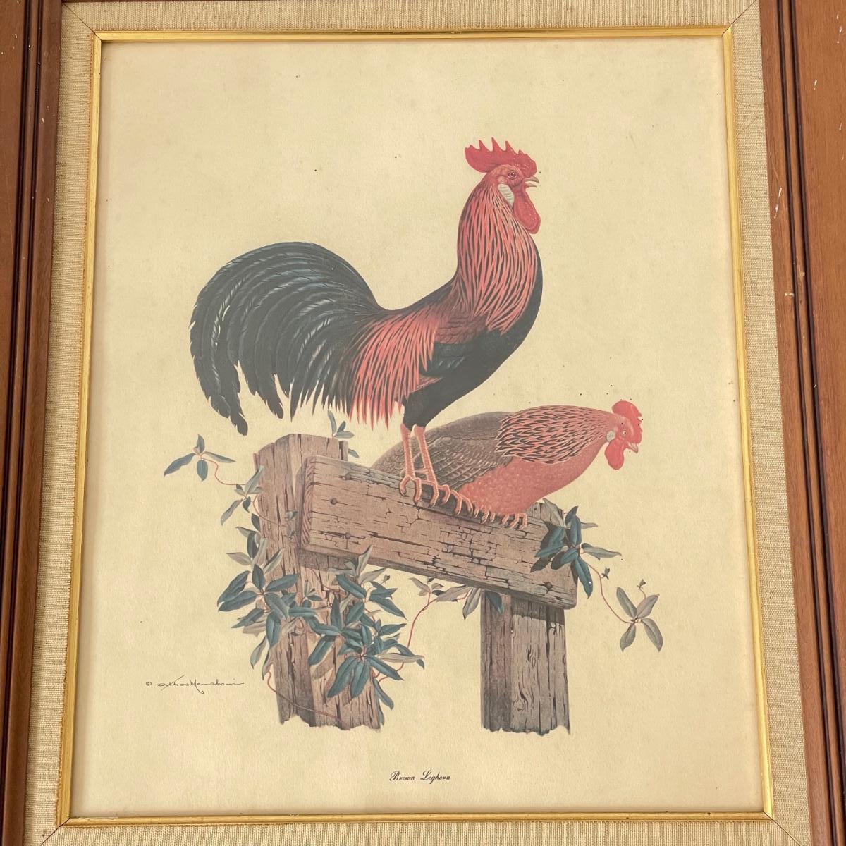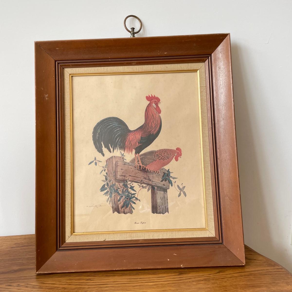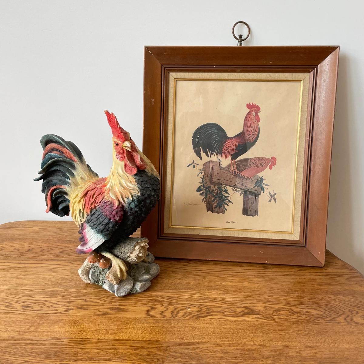 Two fun Leghorn decor. The print is by Athos Menaboni and sits behind glass in a wooden frame. The frame has many superficial blemishes and appears to be easily polished. It measures approximately 18.5” x 21.5” and boasts a 2.5” hook on top. The other Leghorn is made of a moderately heavy resin and stands about 17” tall. See images. Shipping available.