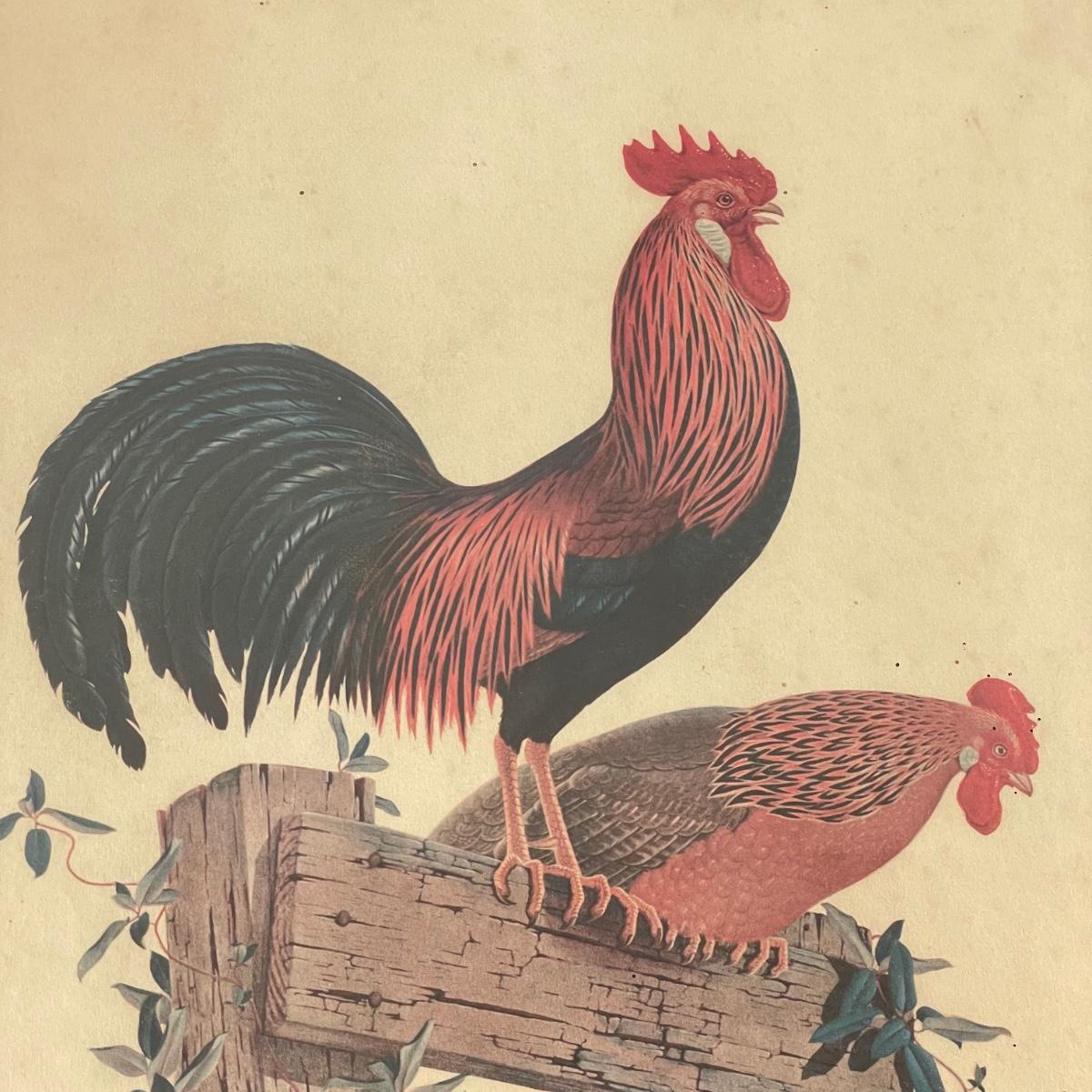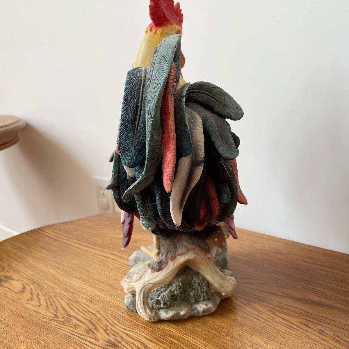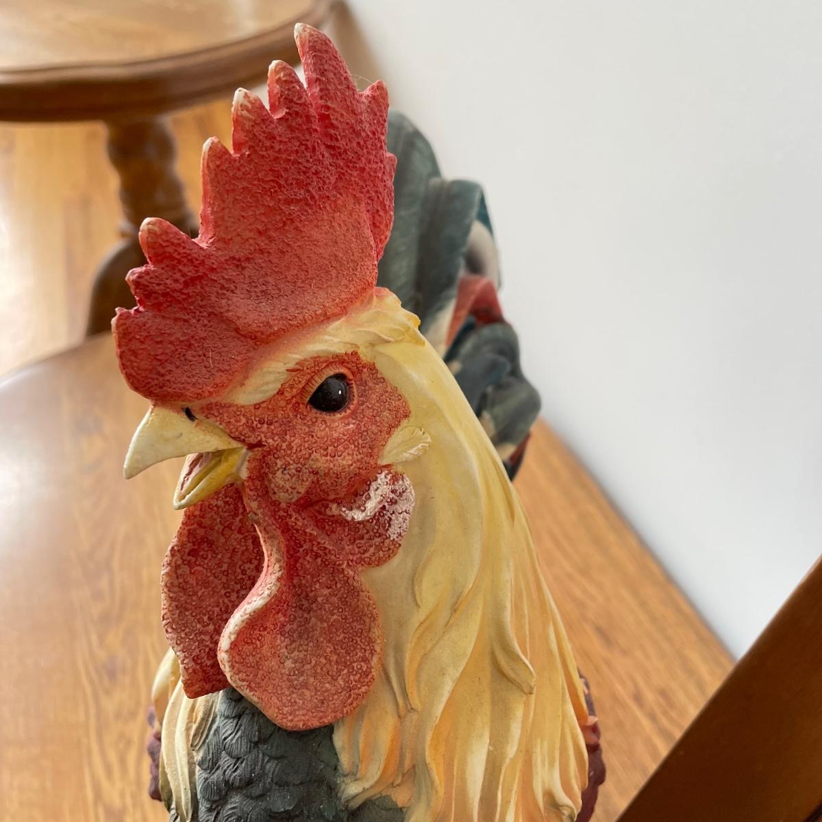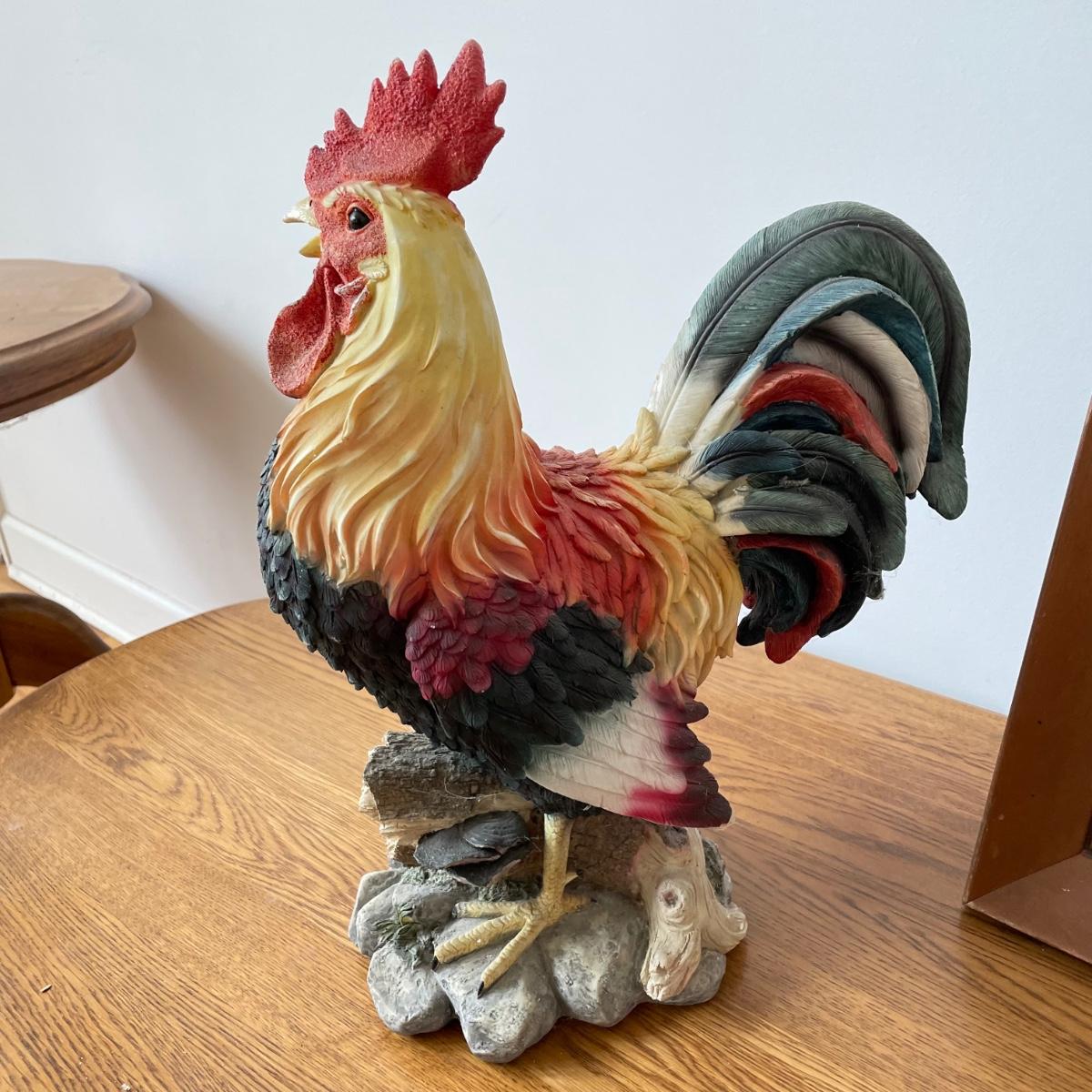 Two fun Leghorn decor. The print is by Athos Menaboni and sits behind glass in a wooden frame. The frame has many superficial blemishes and appears to be easily polished. It measures approximately 18.5” x 21.5” and boasts a 2.5” hook on top. The other Leghorn is made of a moderately heavy resin and stands about 17” tall. See images. Shipping available.