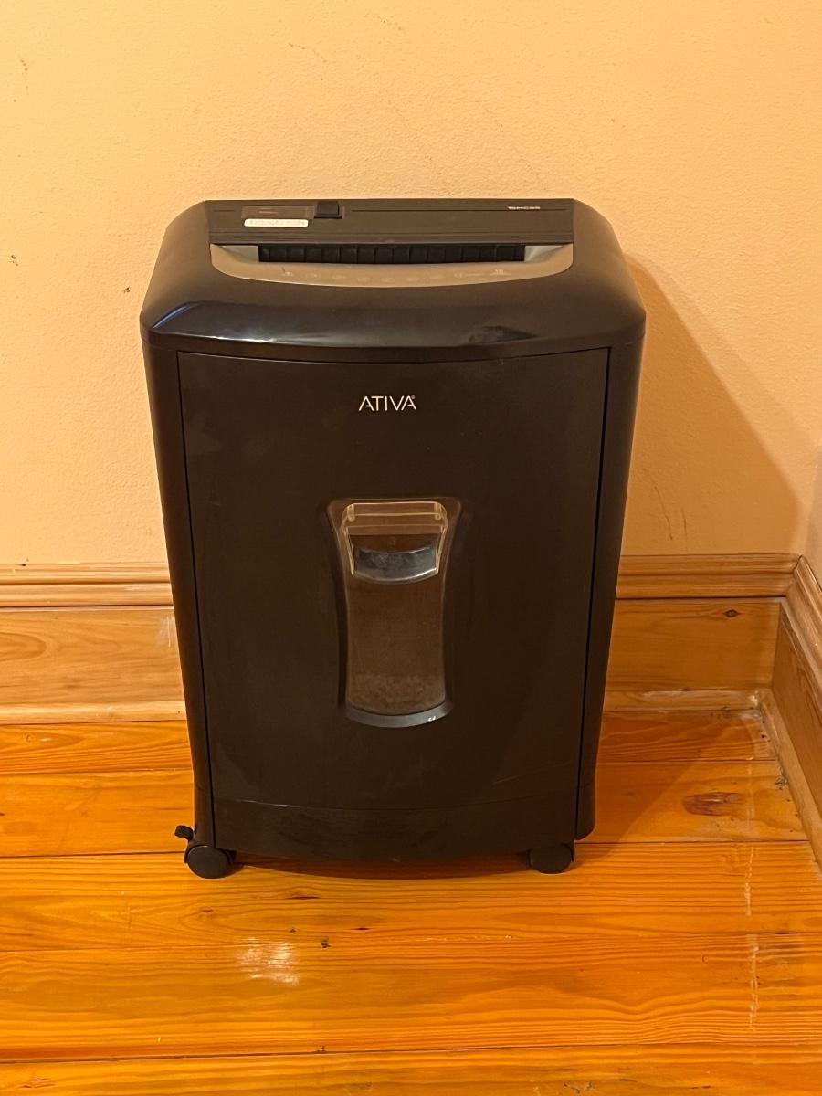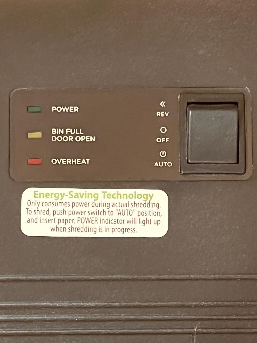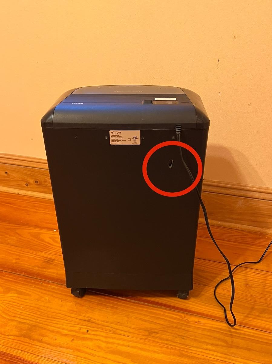 Works great!! Has wheels, rolls easy. Drawer slides easily. Cuts paper into tiny squares. Has small hole in the back at the top. 25” H x 17” W x 13” D