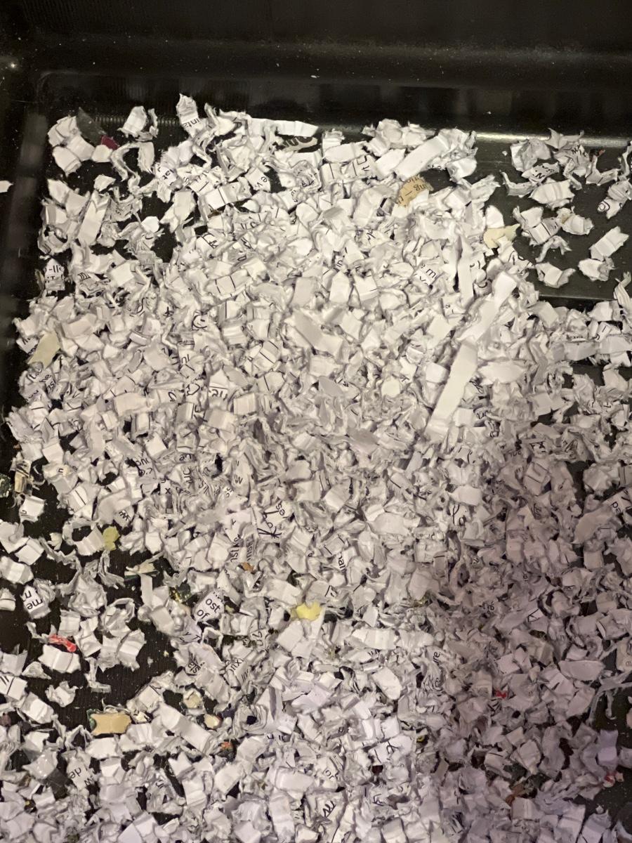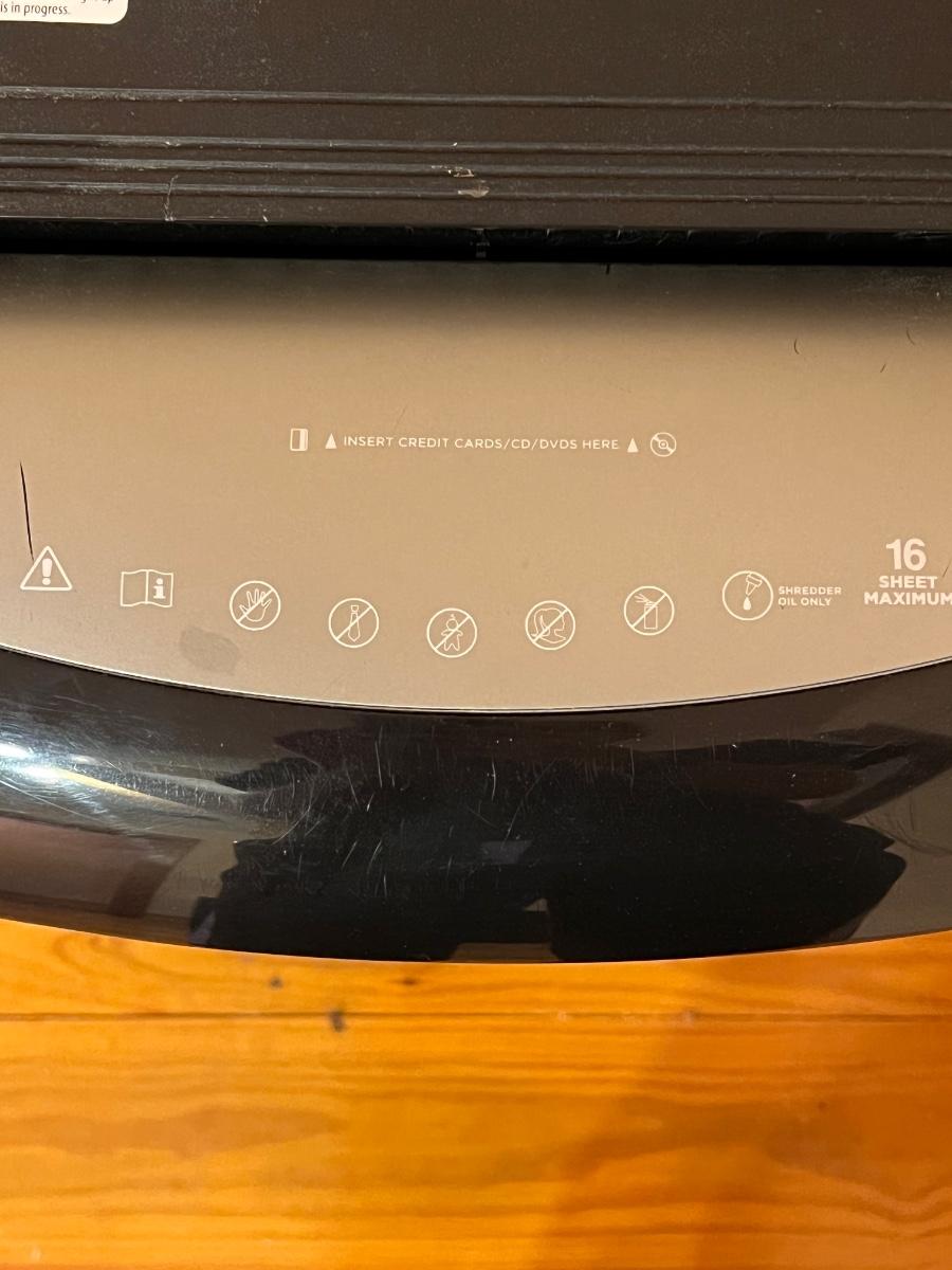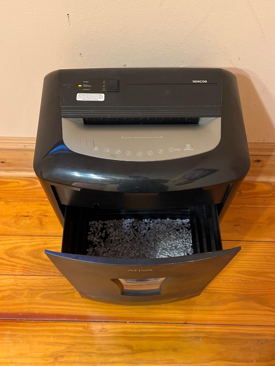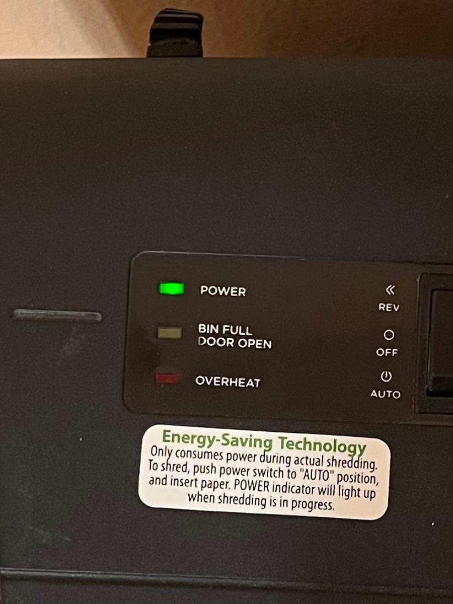 Works great!! Has wheels, rolls easy. Drawer slides easily. Cuts paper into tiny squares. Has small hole in the back at the top. 25” H x 17” W x 13” D