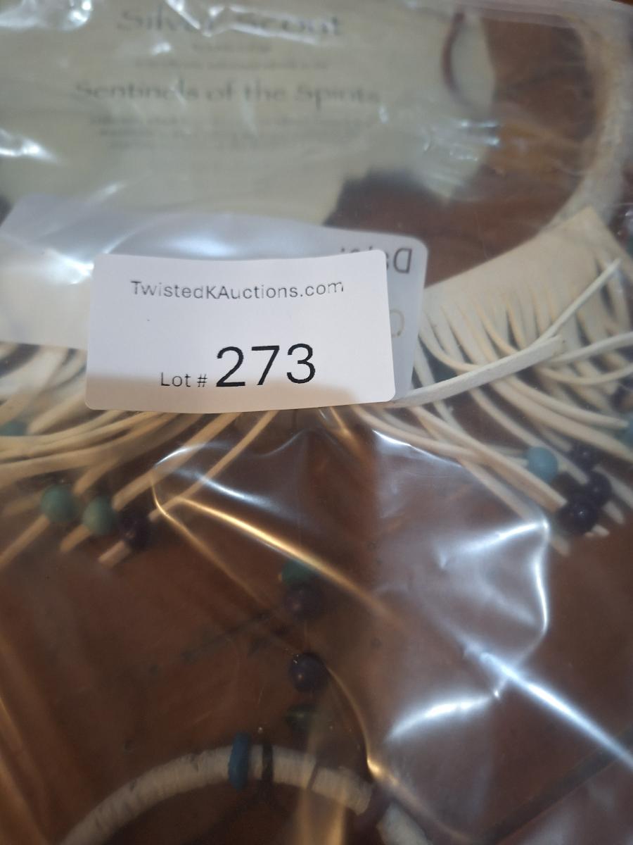 Native American-inspired wolf dreamcatcher, from The Bradford Exchange. Has some damage the bottom of the center leather piece has been chewed by a pet.