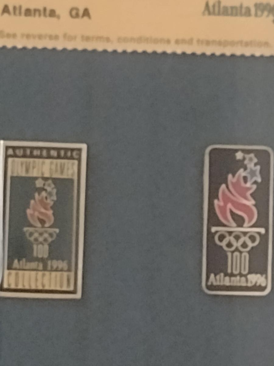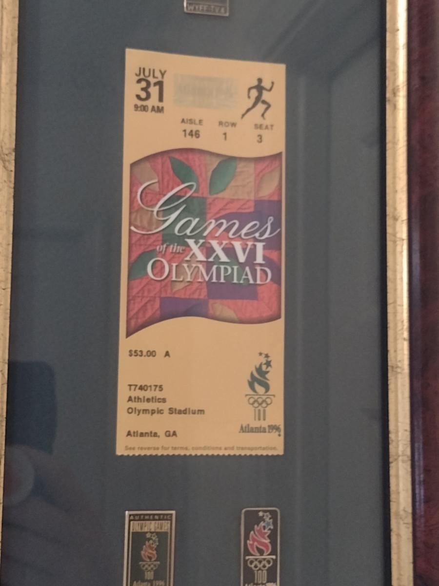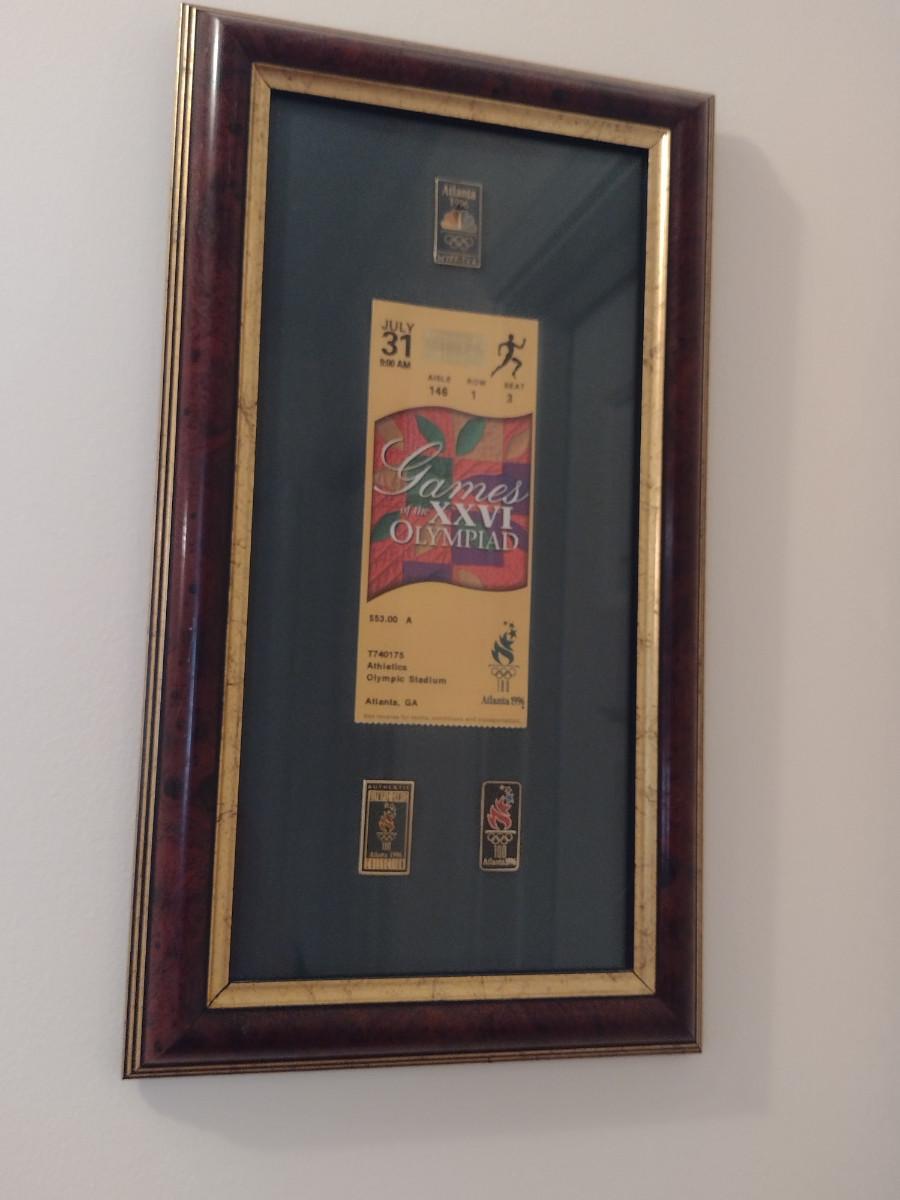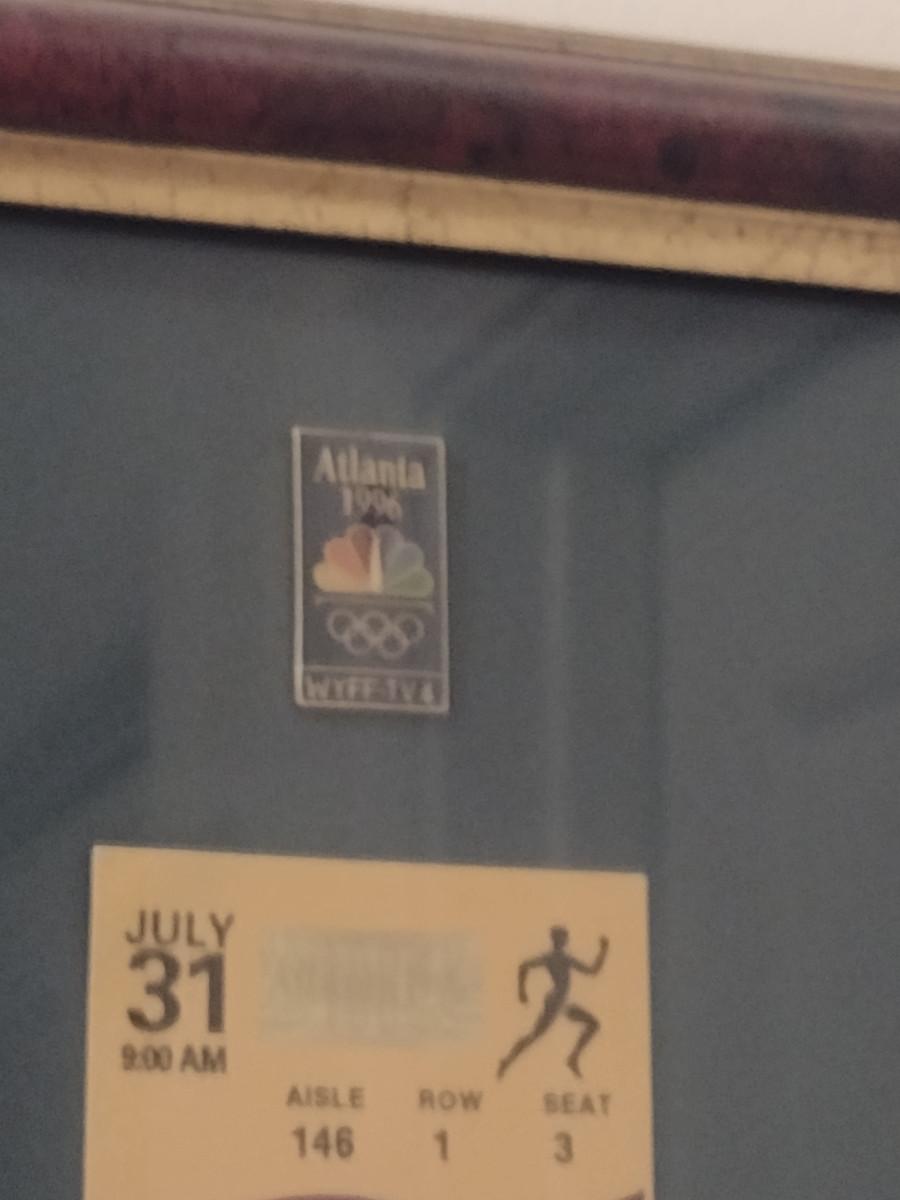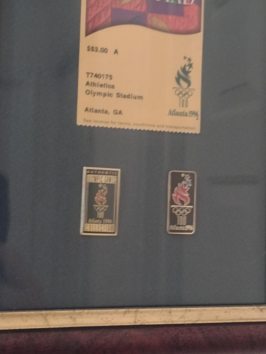 Atlanta 1996 Centennial Olympic Games Memorabilia Ticket and Pins Framed- Approx 8 1/4" x 14 3/4"