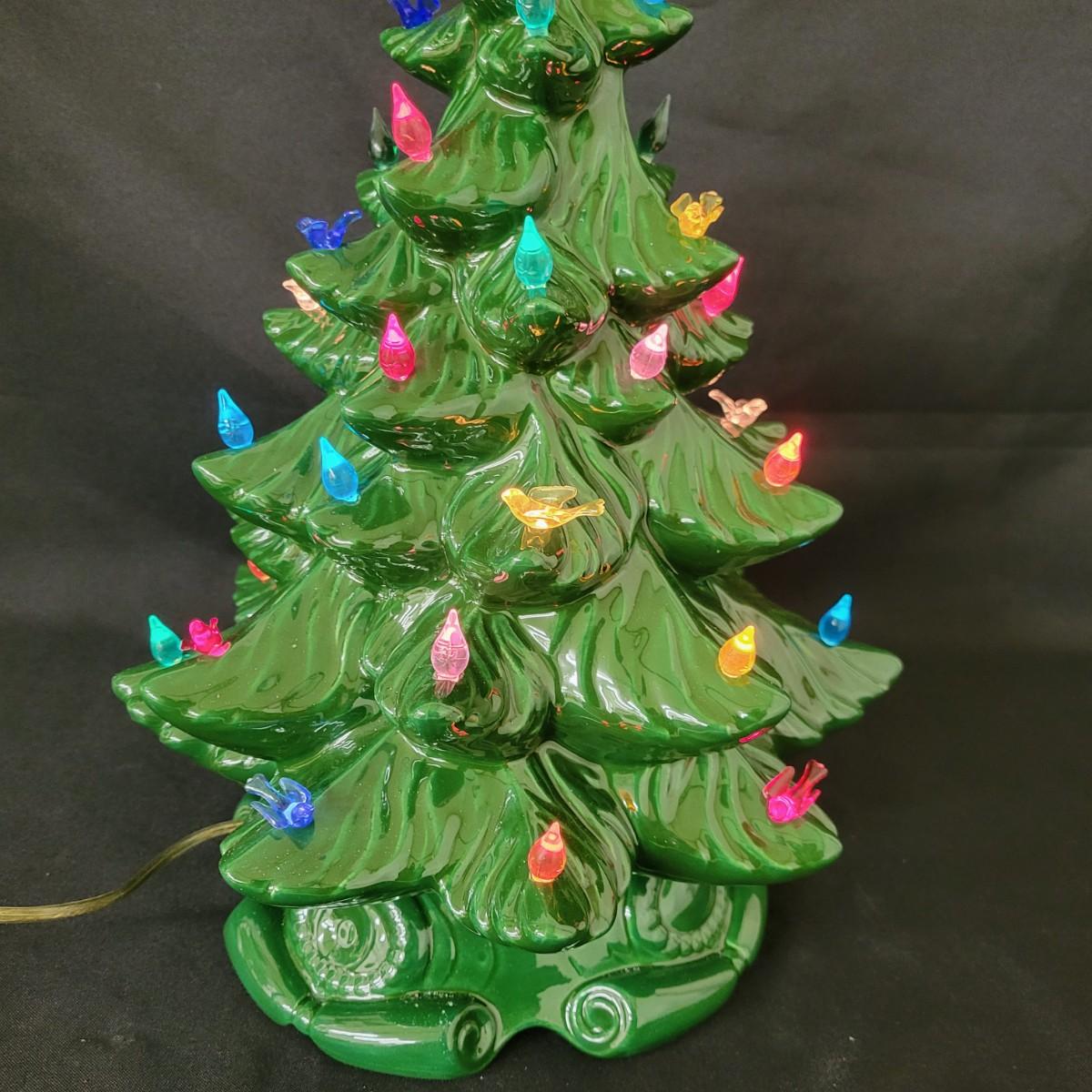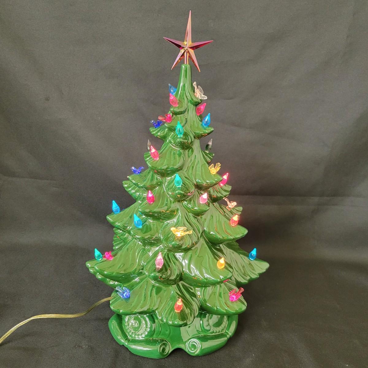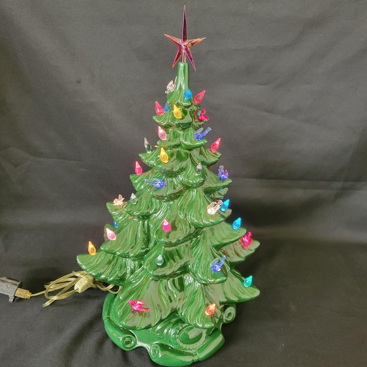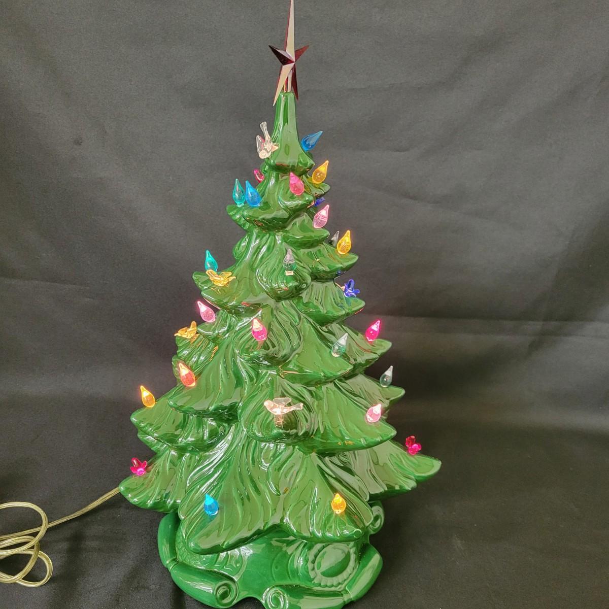 An Atlantic ceramic Christmas tree that powered on when plugged in. There are no missing ornaments and it measures approximately 12"D x 19"H. Shipping available