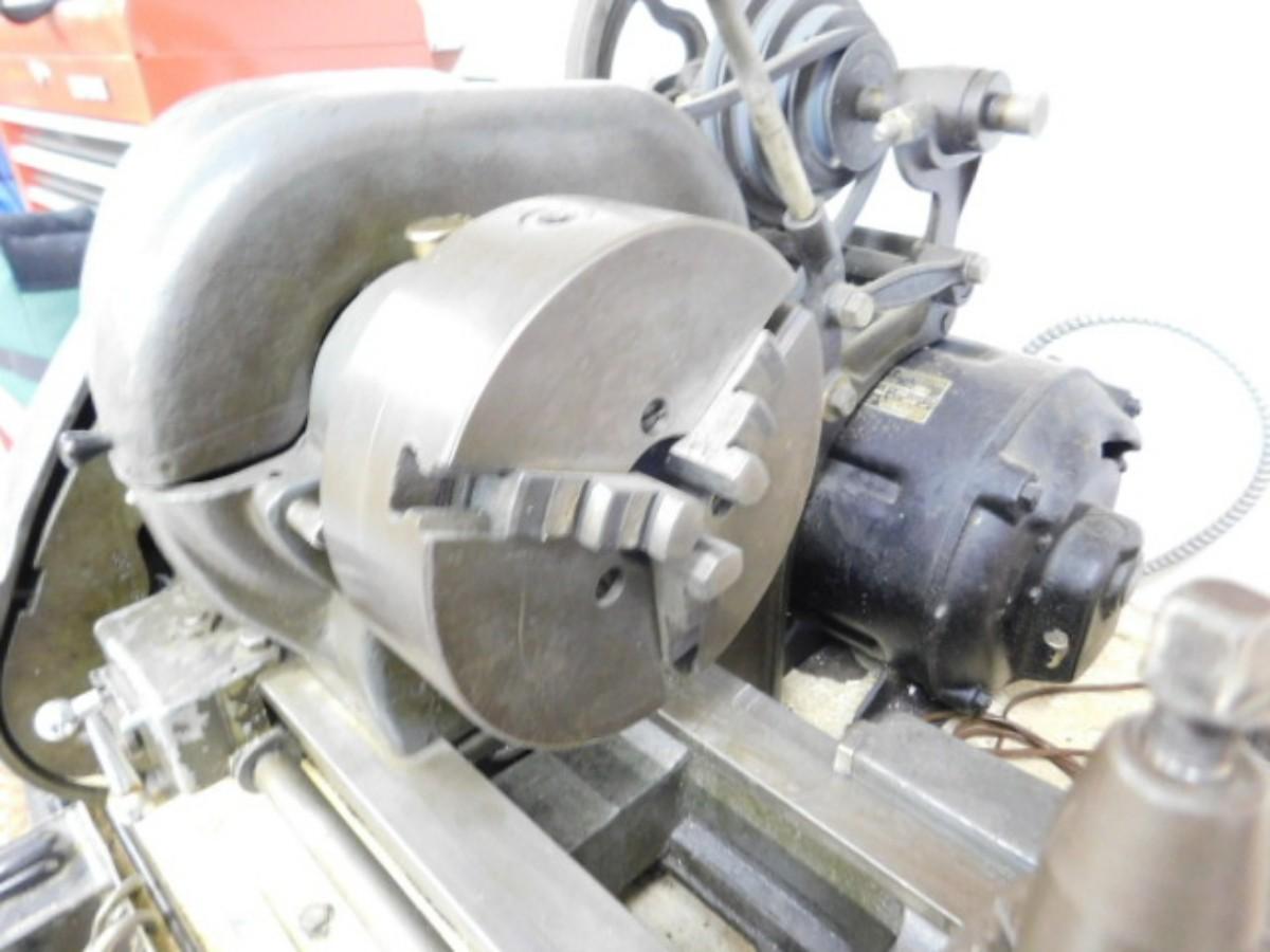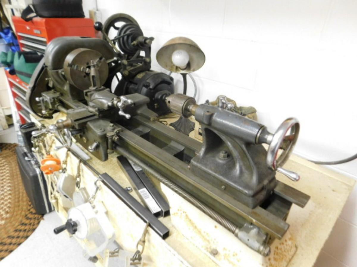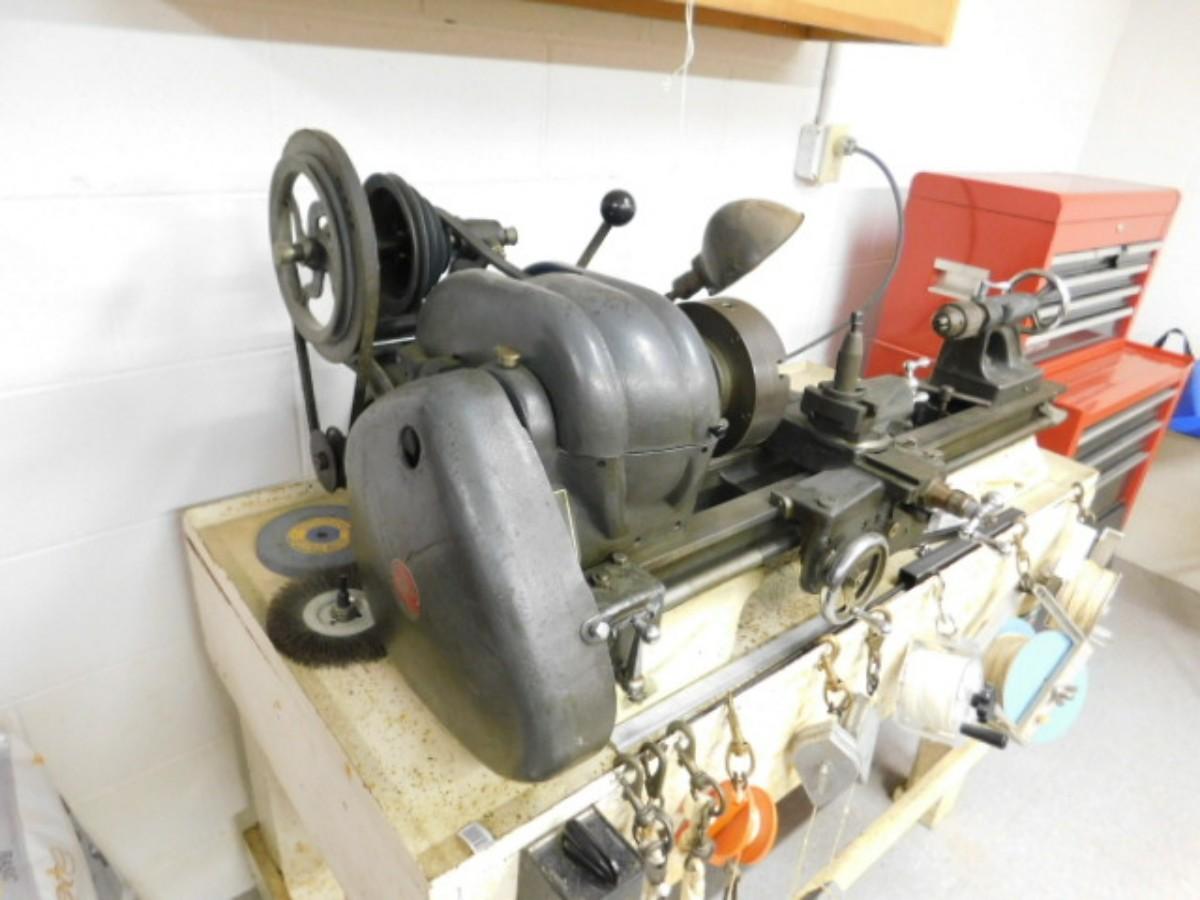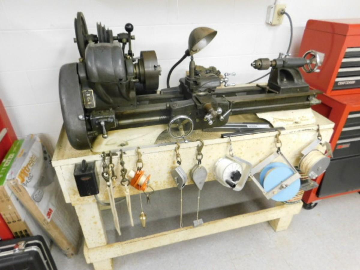 Atlas Metal Lathe on Work Bench. Lathe is attached to the bench which is included in the bid.
