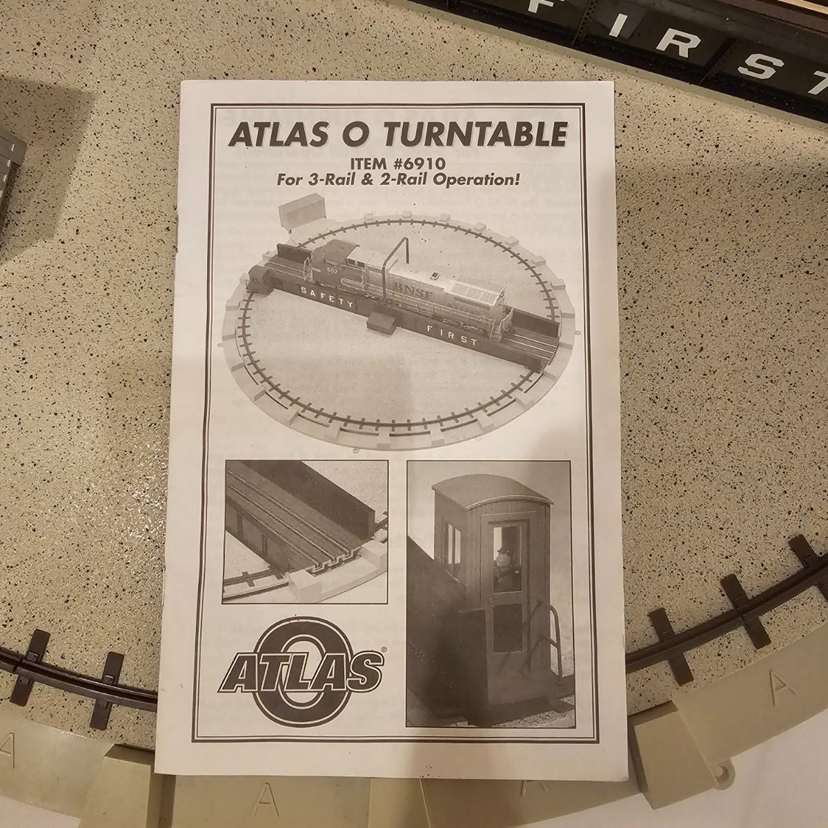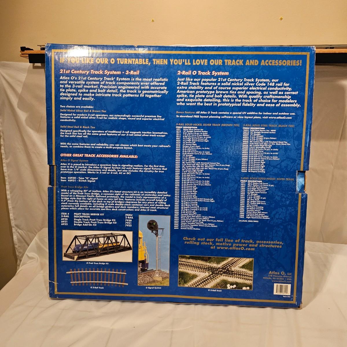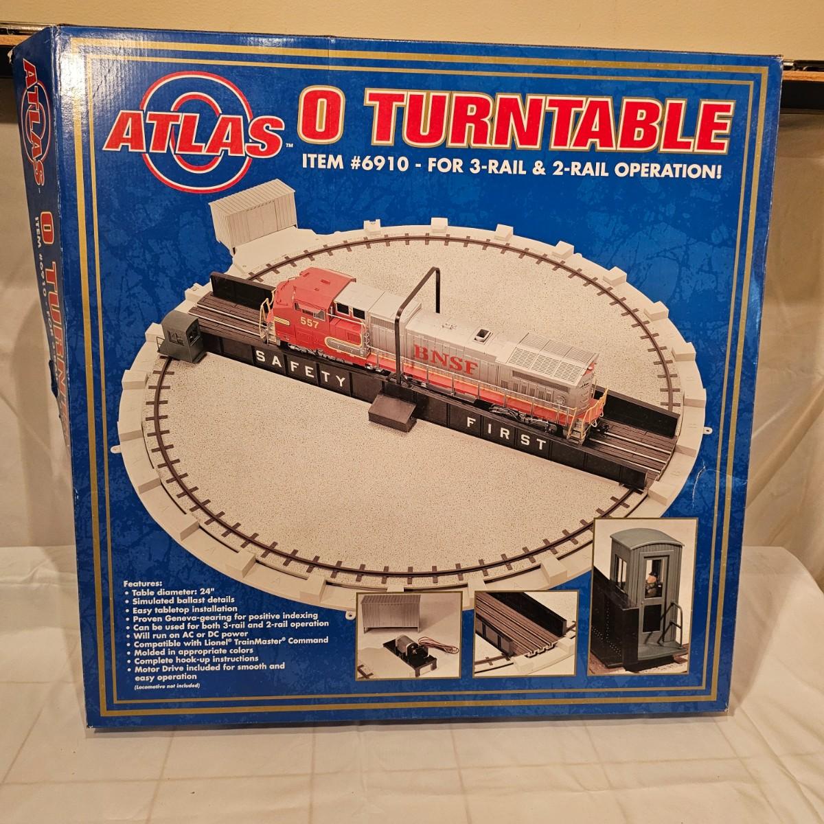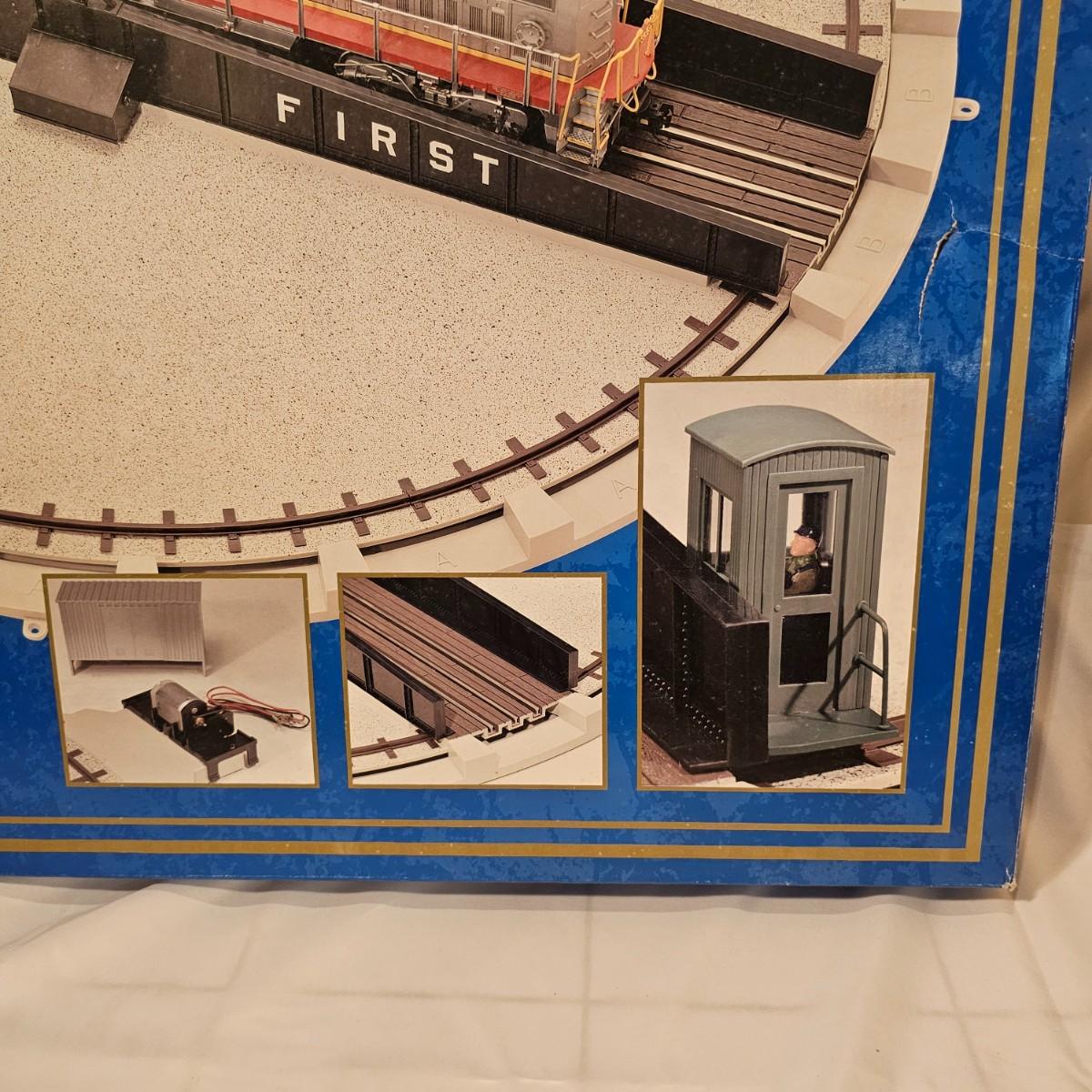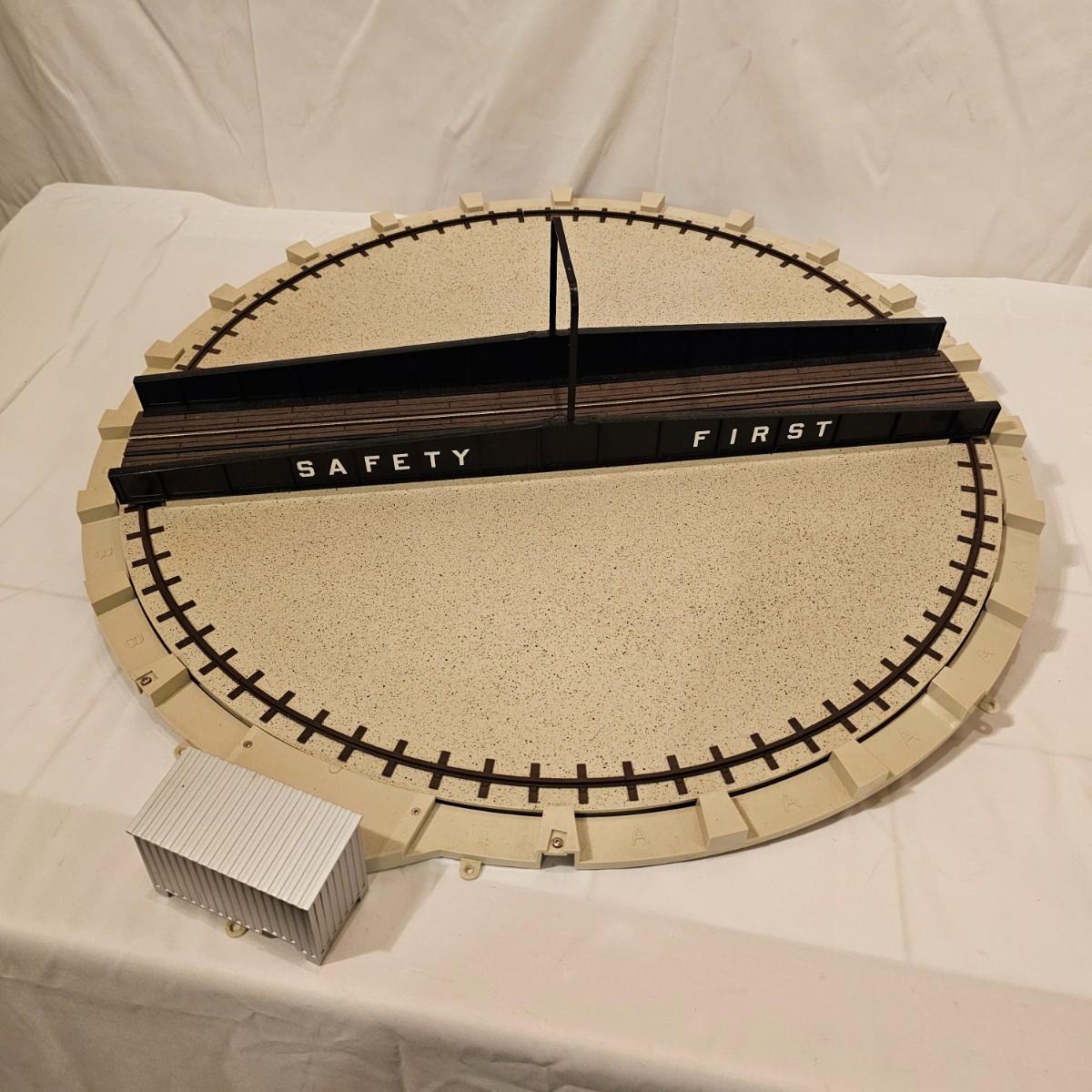 Atlas brand O scale turntable w/motor and instructions. All plastic construction, motor unit has housing to cover it. Missing is the green shanty piece from the side of the bridge. Item measures 28.5"D x 6"H, comes in original box, quite wobbly. Not tested. See photos for details. Local pickup only. Please note that any price tag seen on an item was not put there by Sterling Transitions and does not reflect the current value of the item.