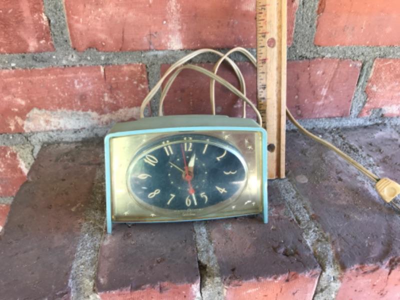 Atomic era alarm clock by GE. Works. Pointy numbers and starbursts around the face. Teal blue. It has some discolor to the plastic.