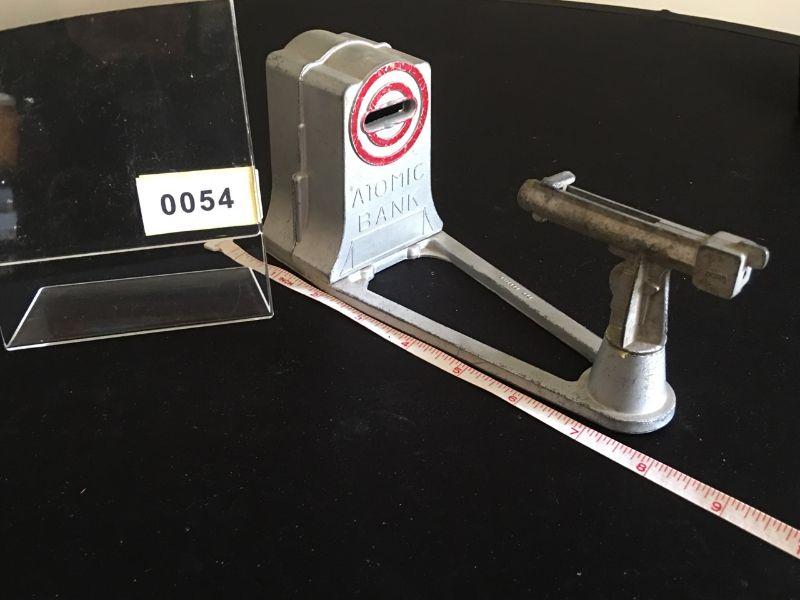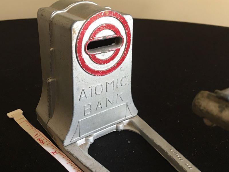 Atomic motion metal coin bank with target. No key was found. Not tested