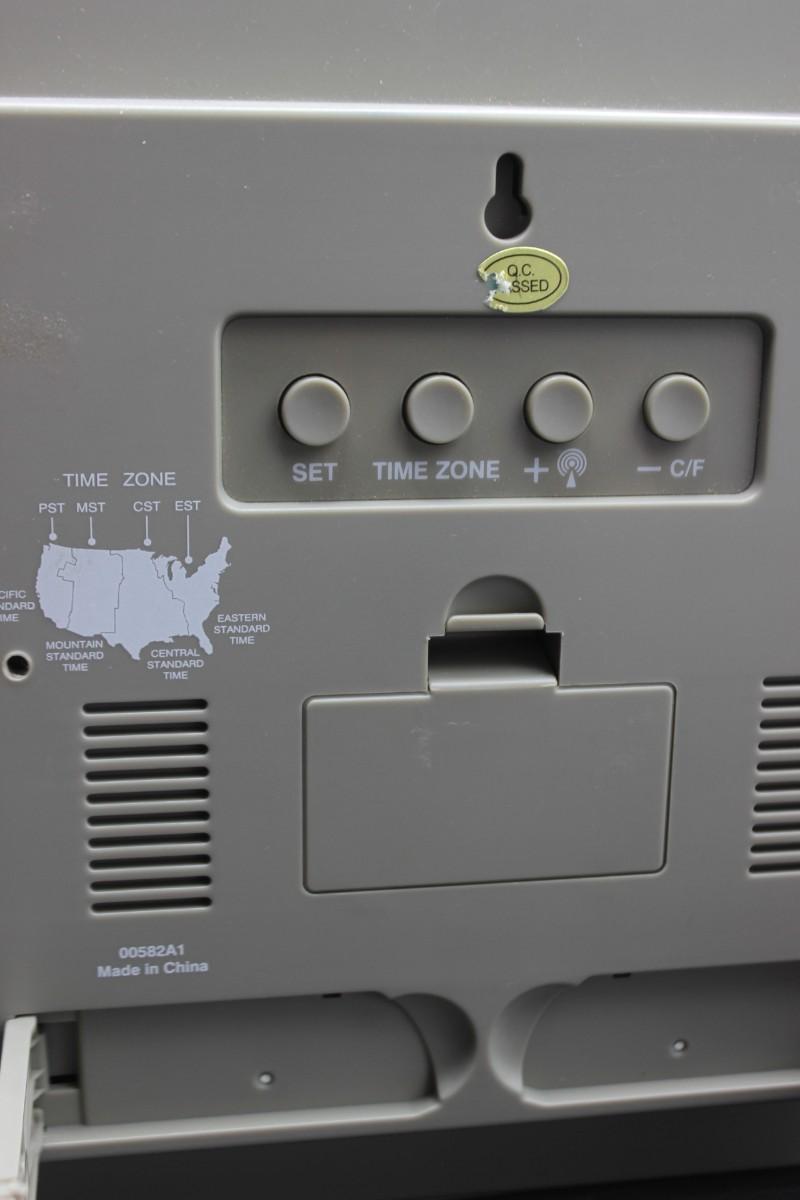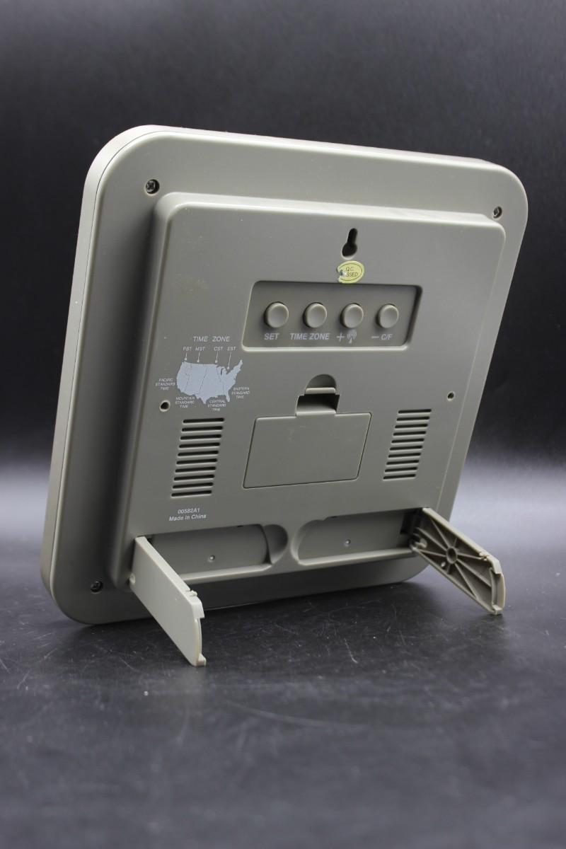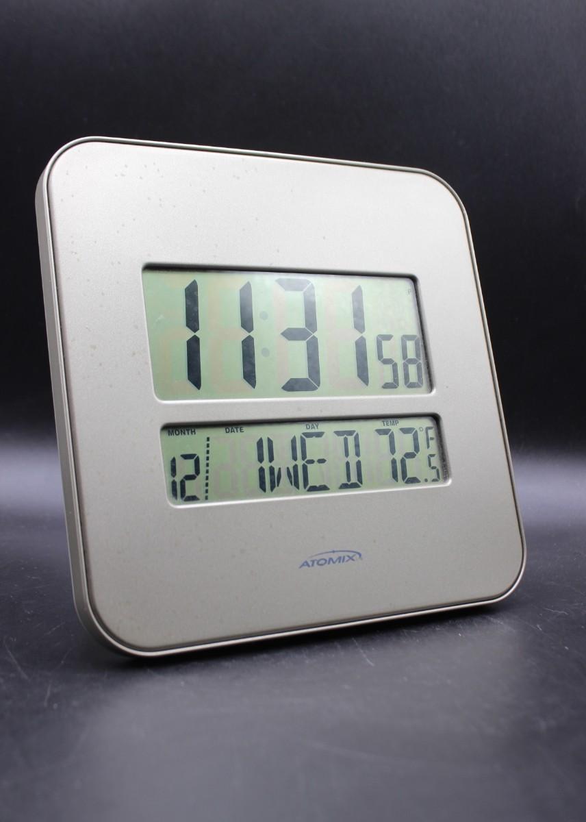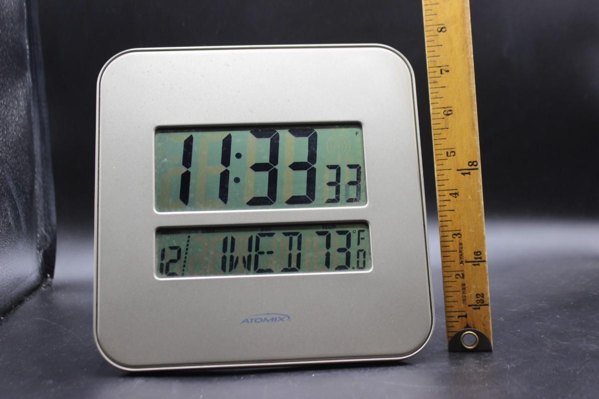 Atomix Battery Operated Wall or Table Clock Time, Date, and Thermometer, there is no significant damage to the clock and is in good useable condition. Check pictures for more details and for sizing.