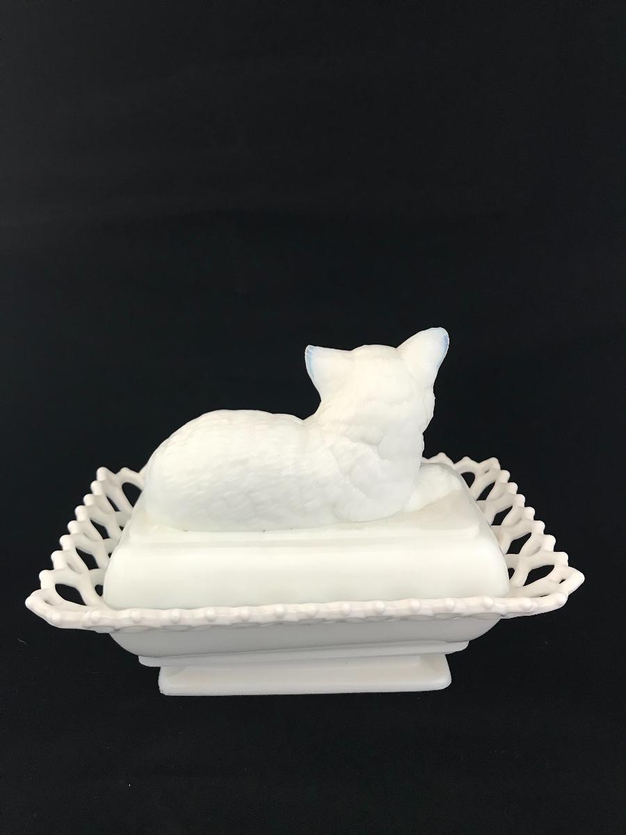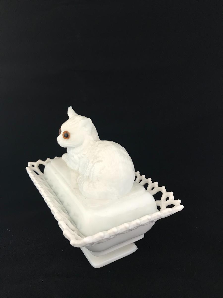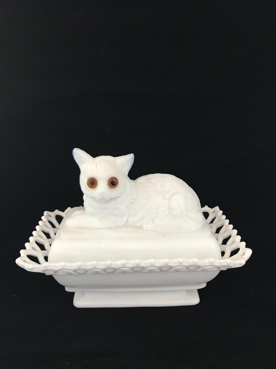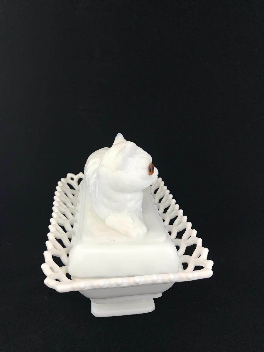 Atterbury Milk Glass Cat on Bed Box