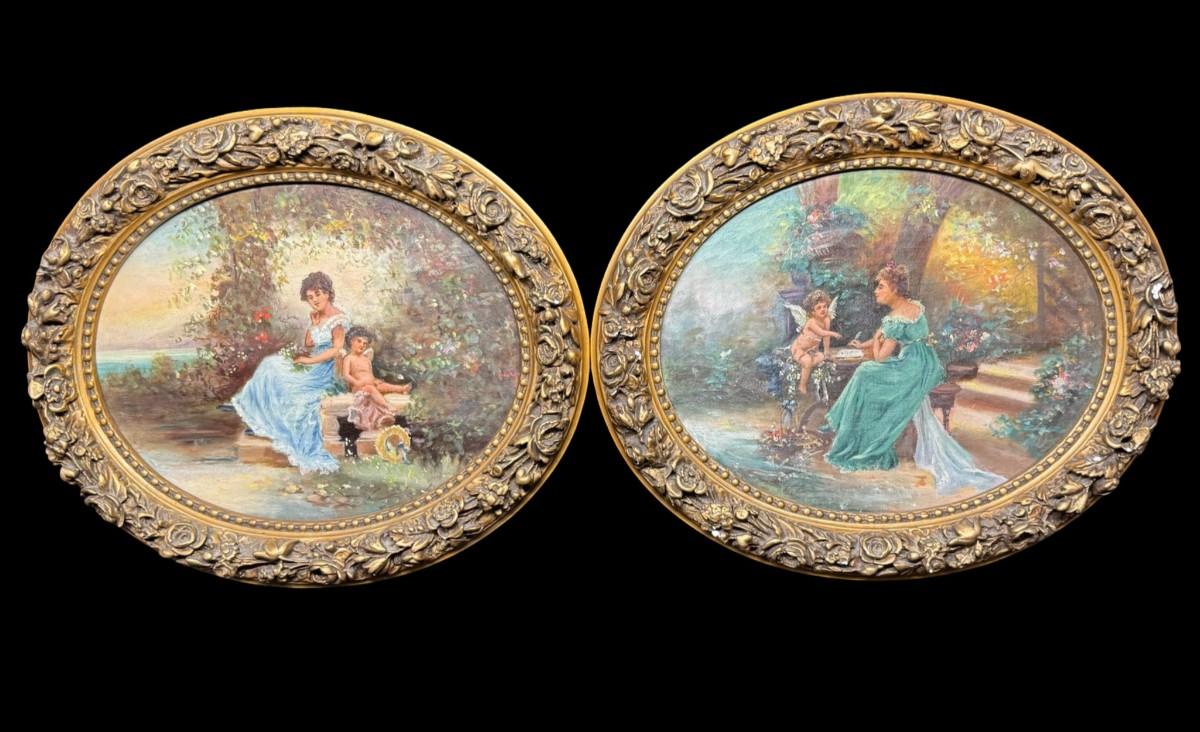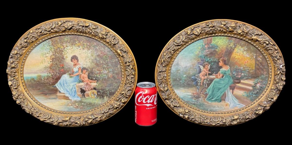 Two pieces. Each piece is believed to be 19th century, and has a scene with a maiden and a cherub in a garden setting. Measurement: 15” x 12” (each). Pre-auction estimate: $1000-$2000. [JP]