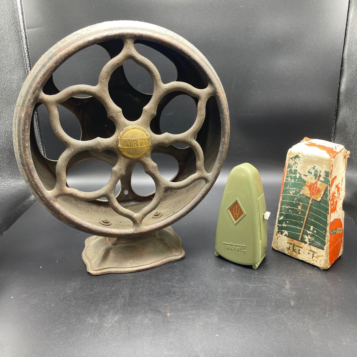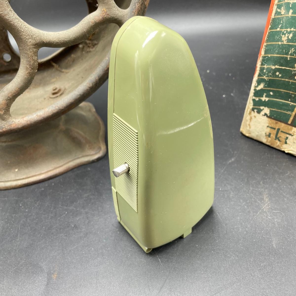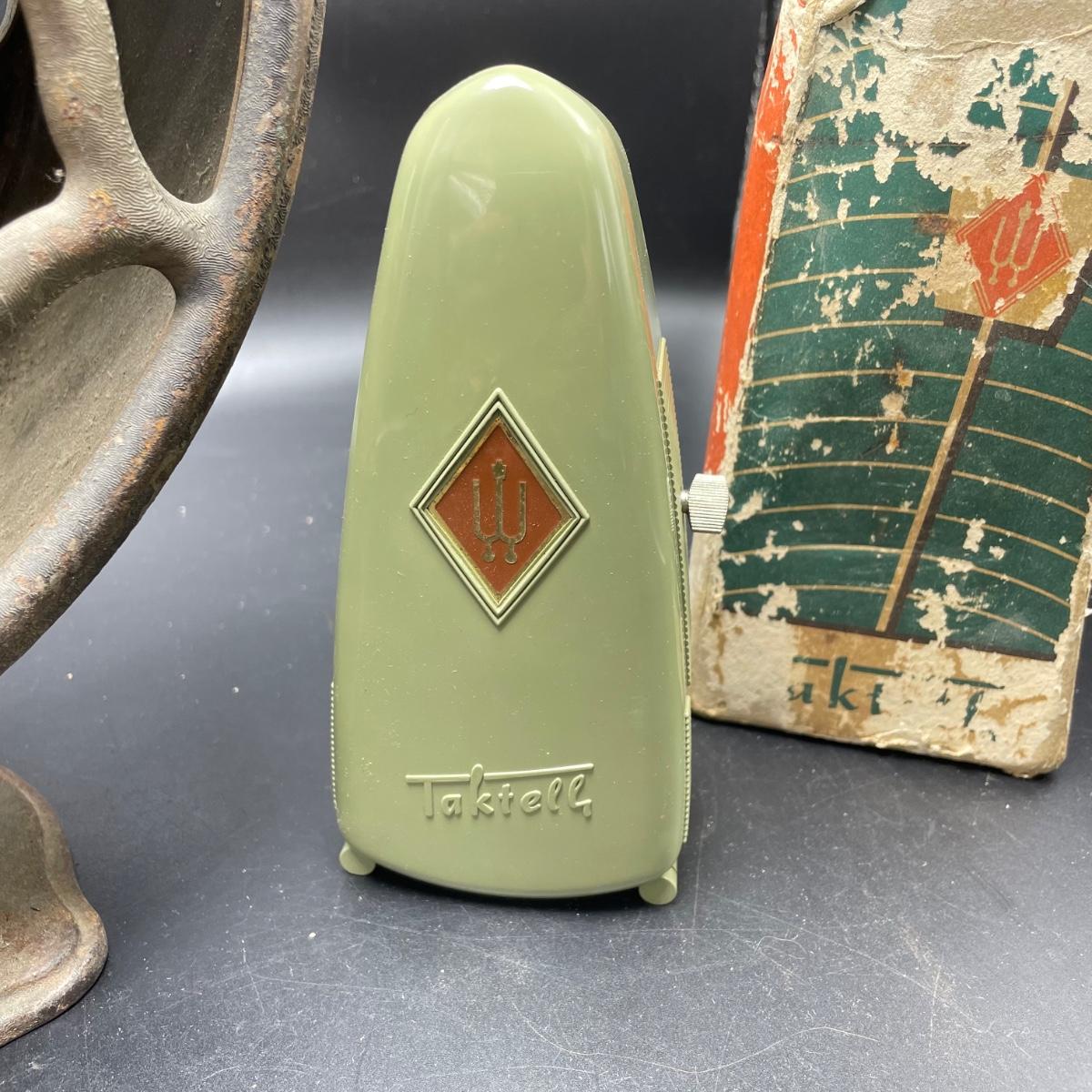 A hollow iron Atwater Kent Type 53 Radio Speaker serial number 435353. Lot also features a working light green TakTell Metronome with its original box. See images. Shipping available.