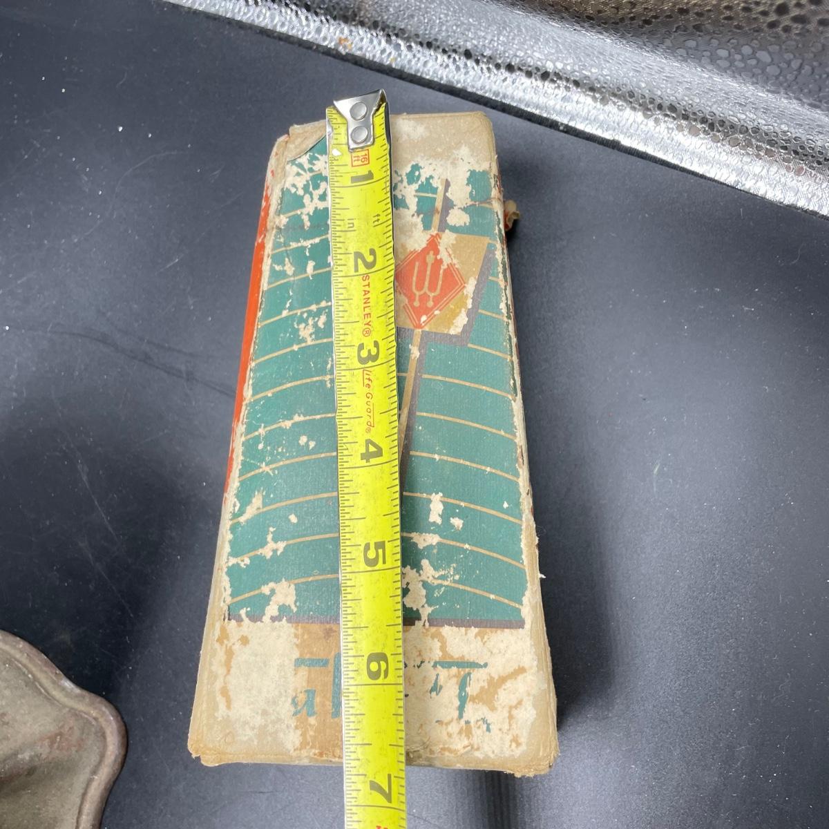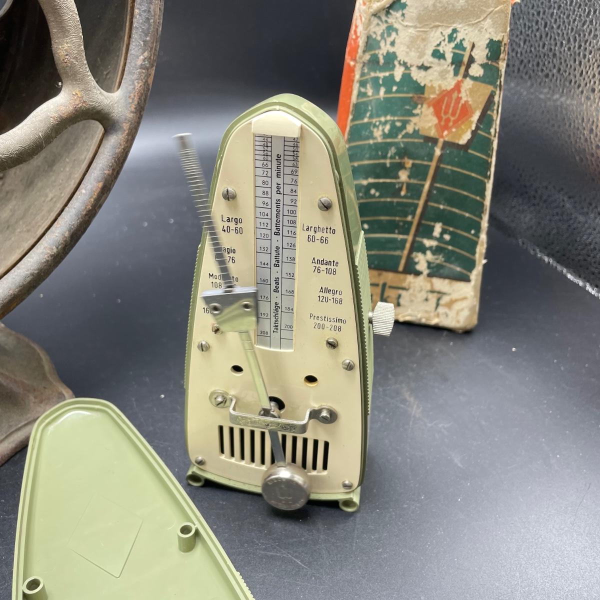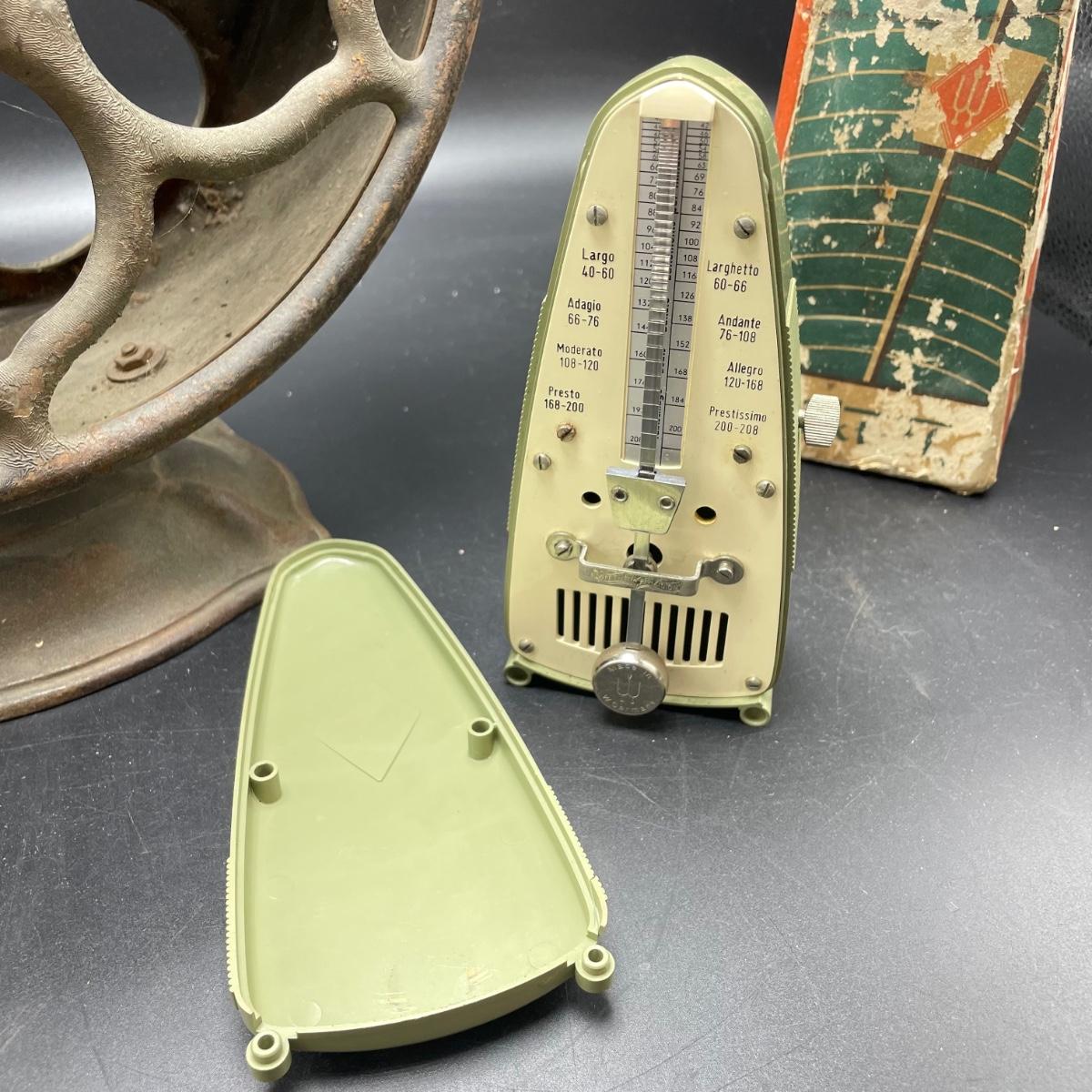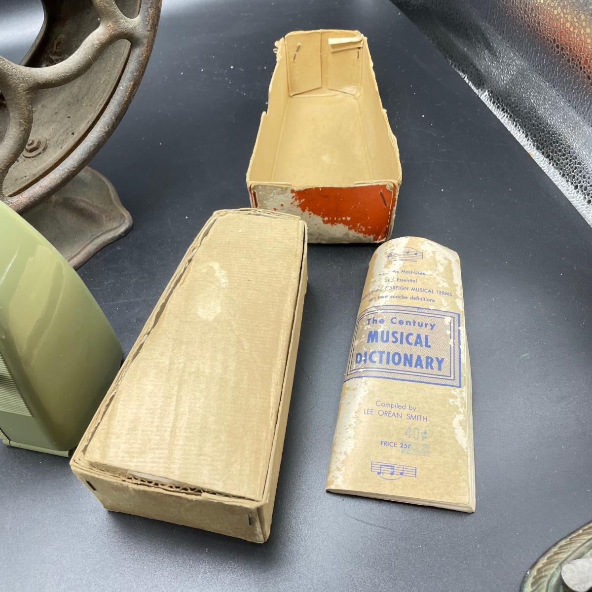 A hollow iron Atwater Kent Type 53 Radio Speaker serial number 435353. Lot also features a working light green TakTell Metronome with its original box. See images. Shipping available.