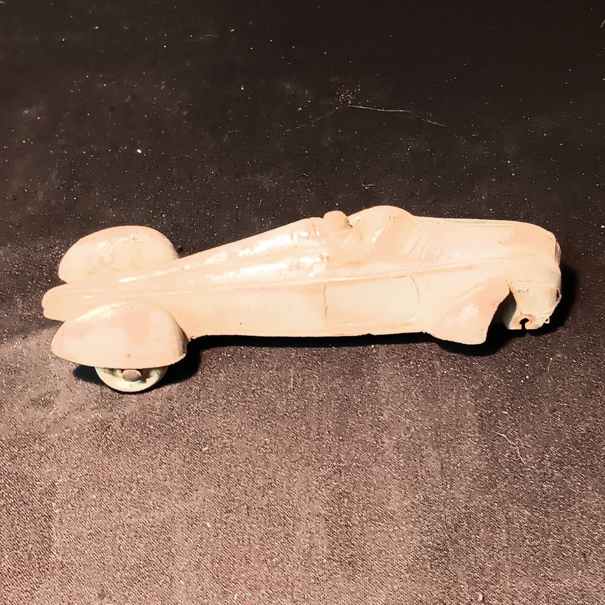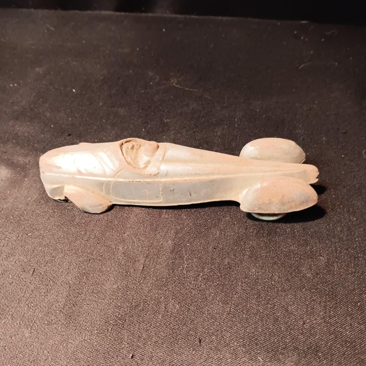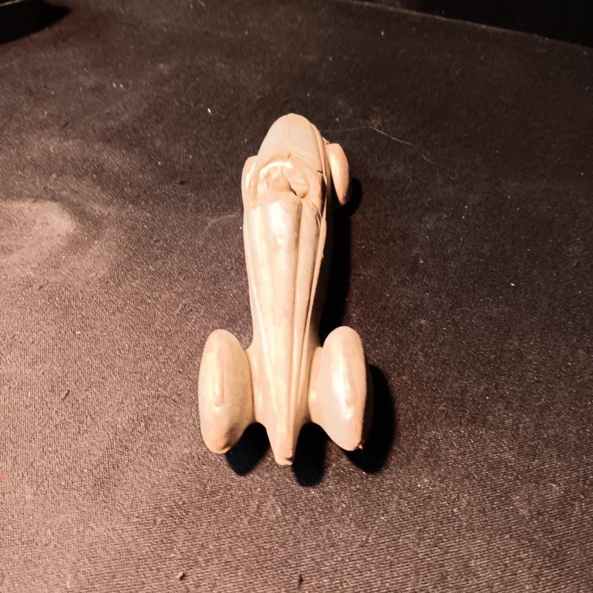 THE WHITE RACE CAR IS MISSING THE FRONT WHEELS