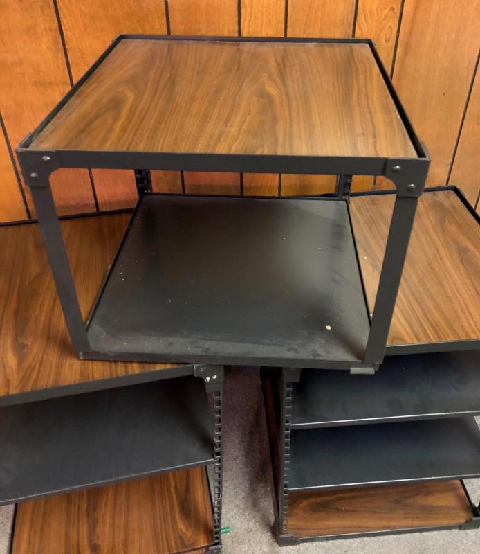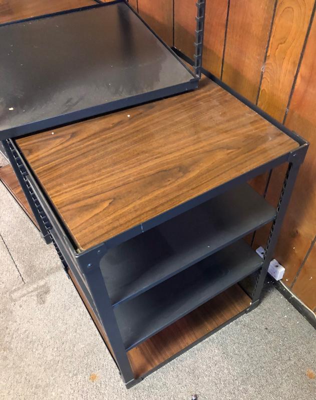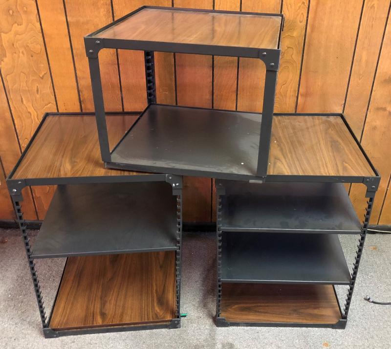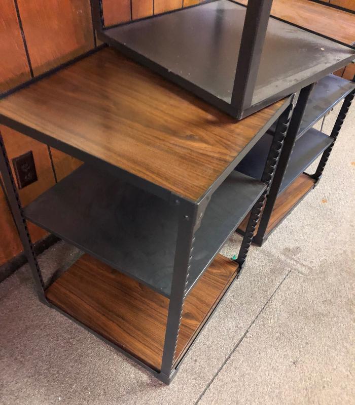 Faux wood and steel electronics shelves..20 x 20 x 27 and one at 15" tall...Stackable...Very good condition...