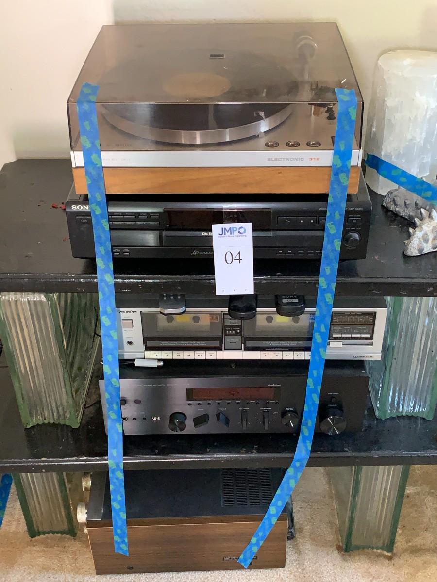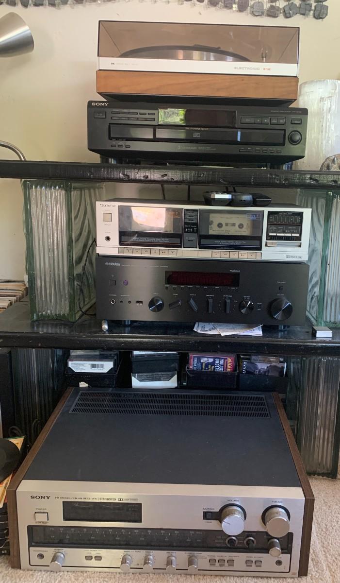 Sony Stereo/Receiver, STR-5800 SD. Technics dual cassette recorder/player. Yamaha receiver R-N602. Sony 5 CD player. Vintage Turntable: Philips Electronic 312, DC servo belt drive. Does not include cassettes, shelves or blocks in photos All components turn on, not tested.